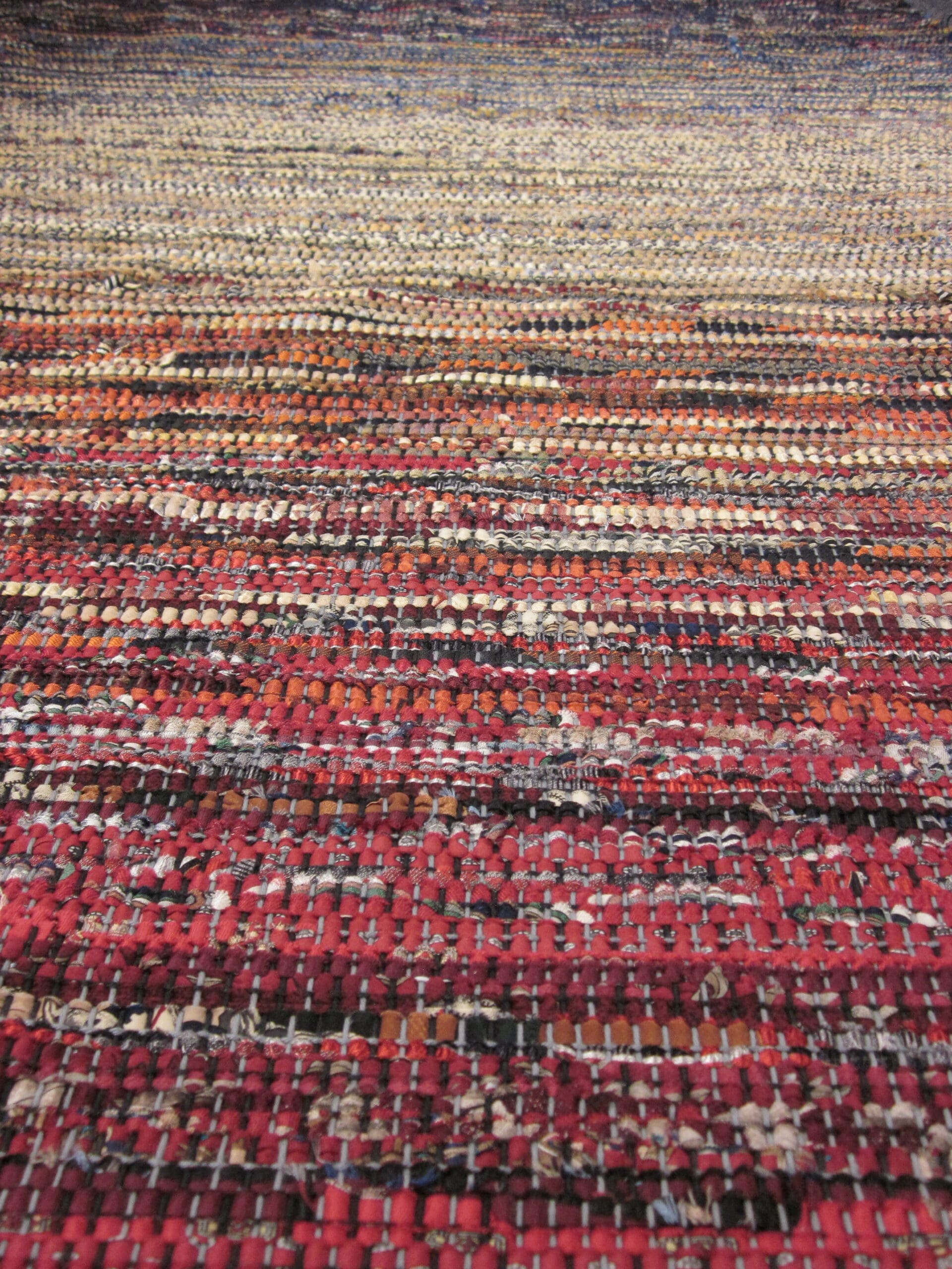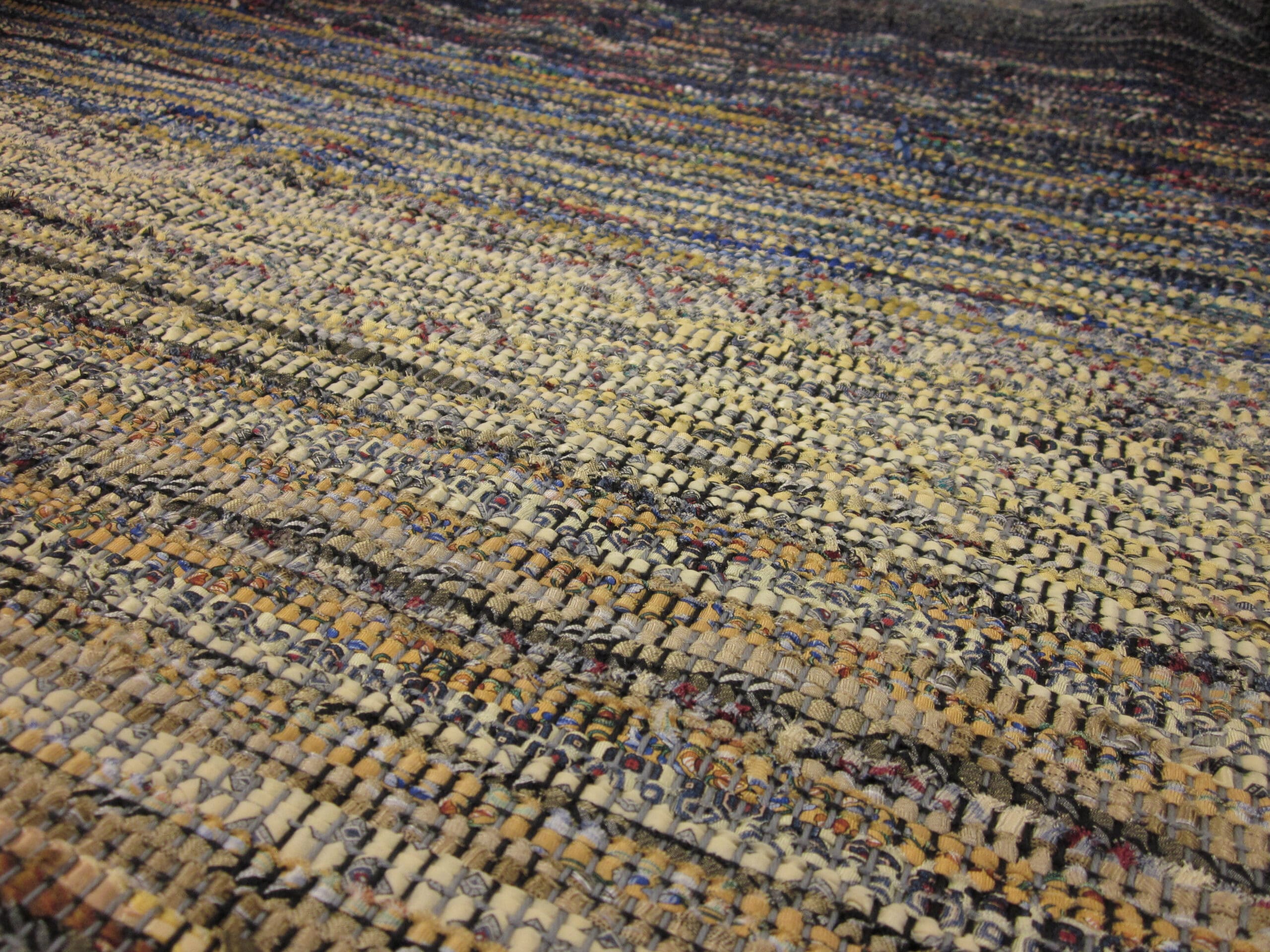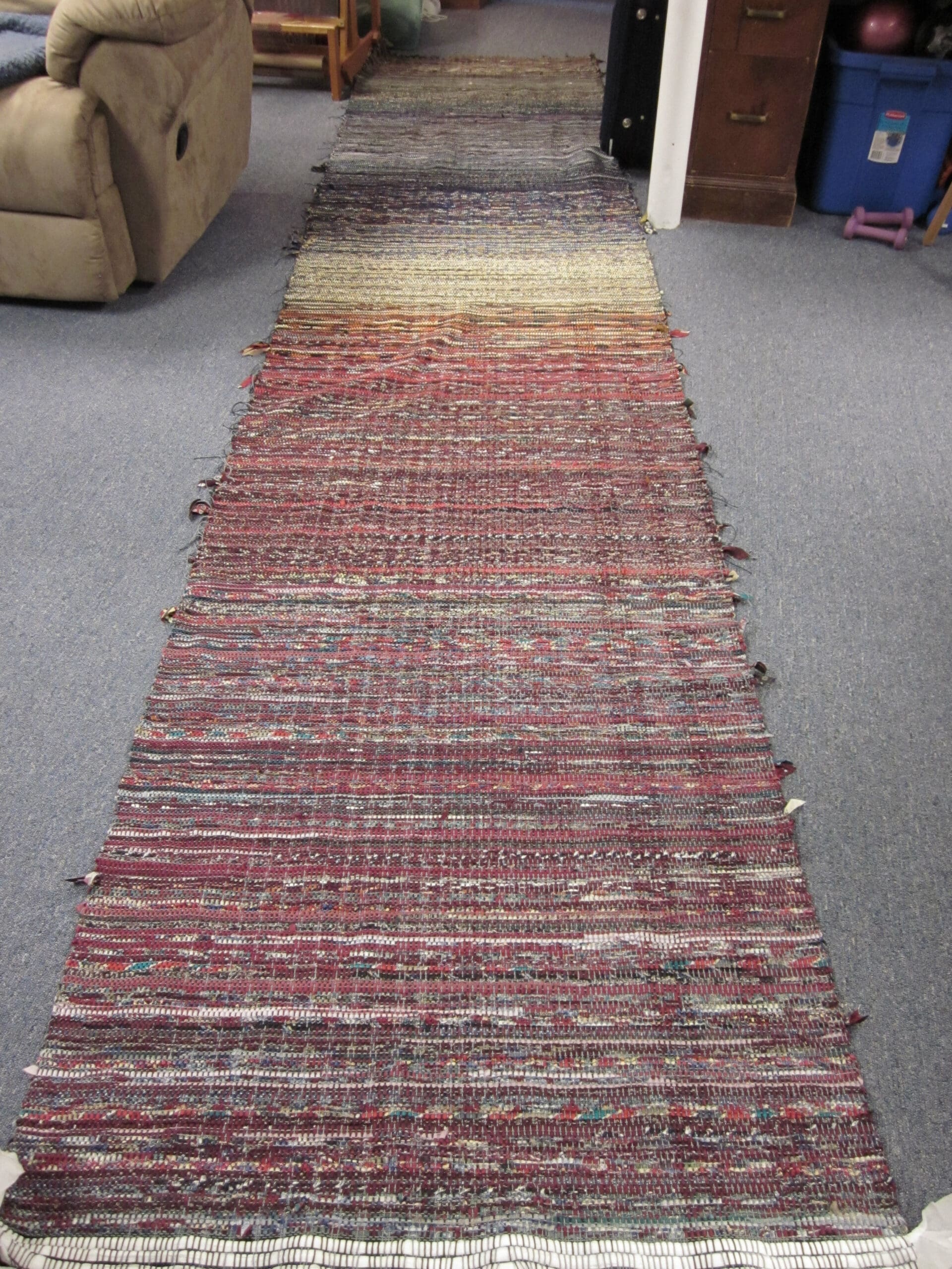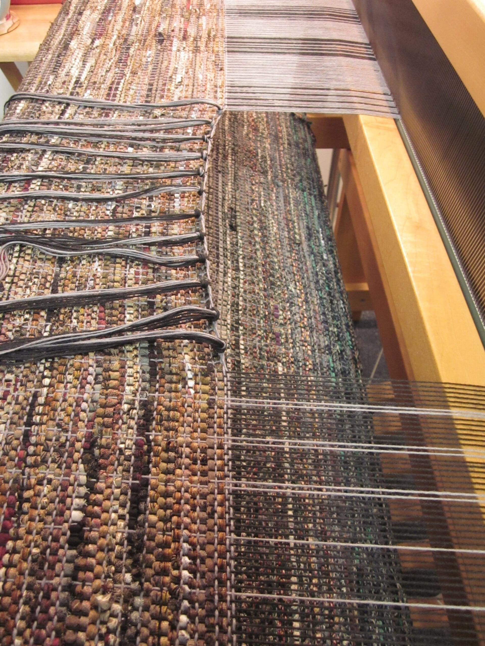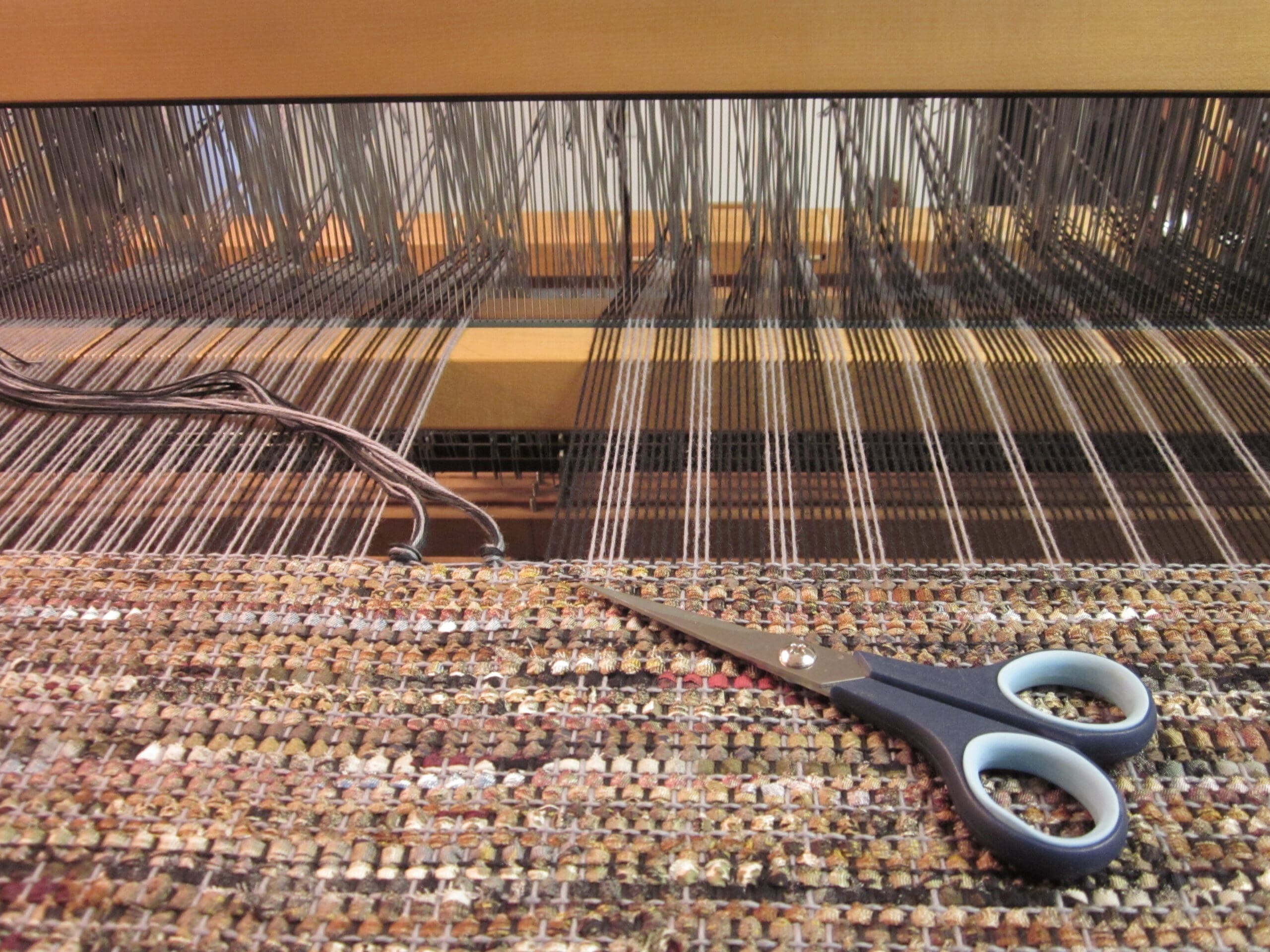 One of the considerations taken into account when planning a weaving project is that there is always waste. There is a dead zone in the middle of the loom where it’s impossible to use all the yarn. So, those inches become built into the project as waste. I have no doubt that someone has developed a way to squeeze out every last inch. But for me, I’m too excited taking it off to worry about it!