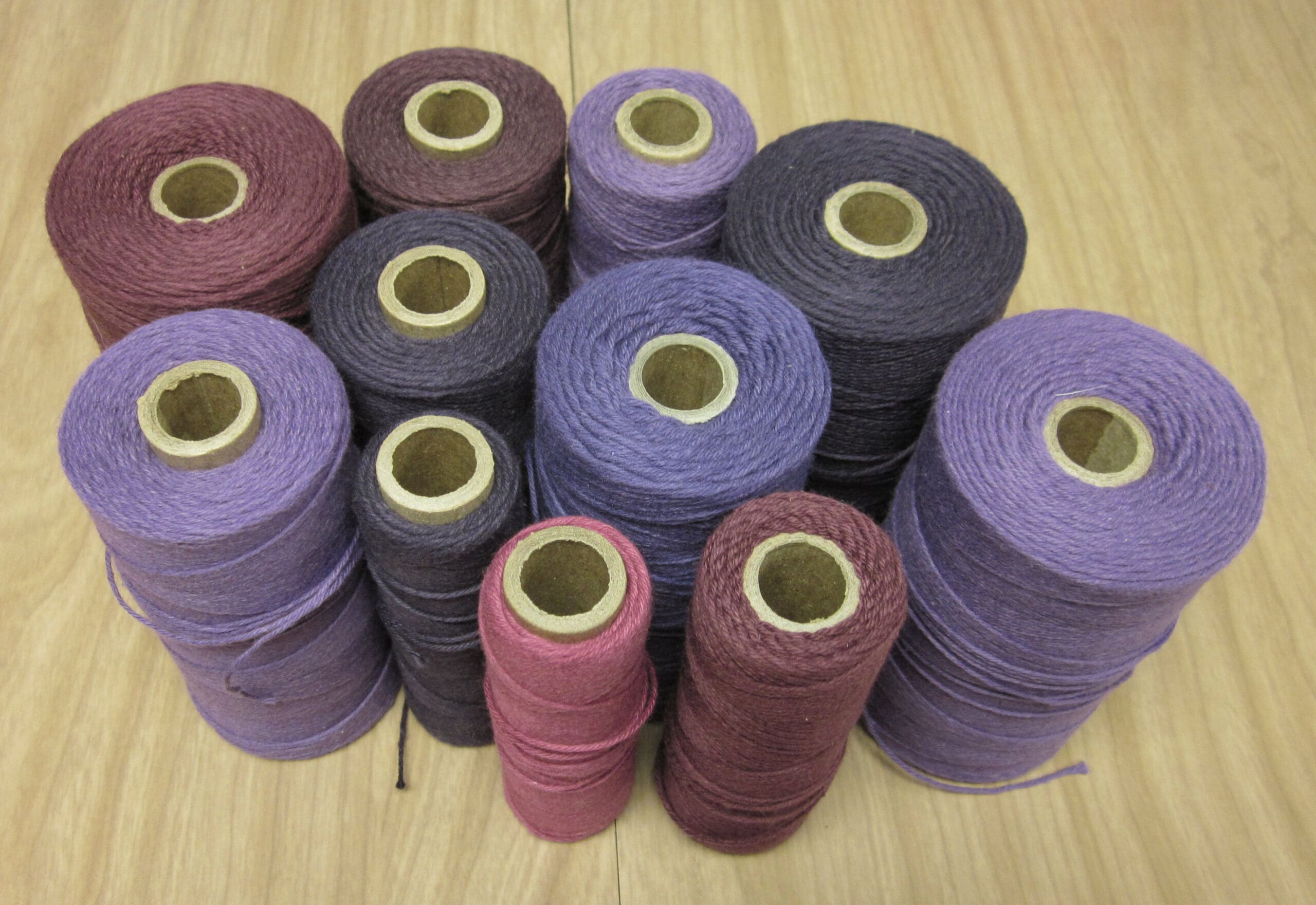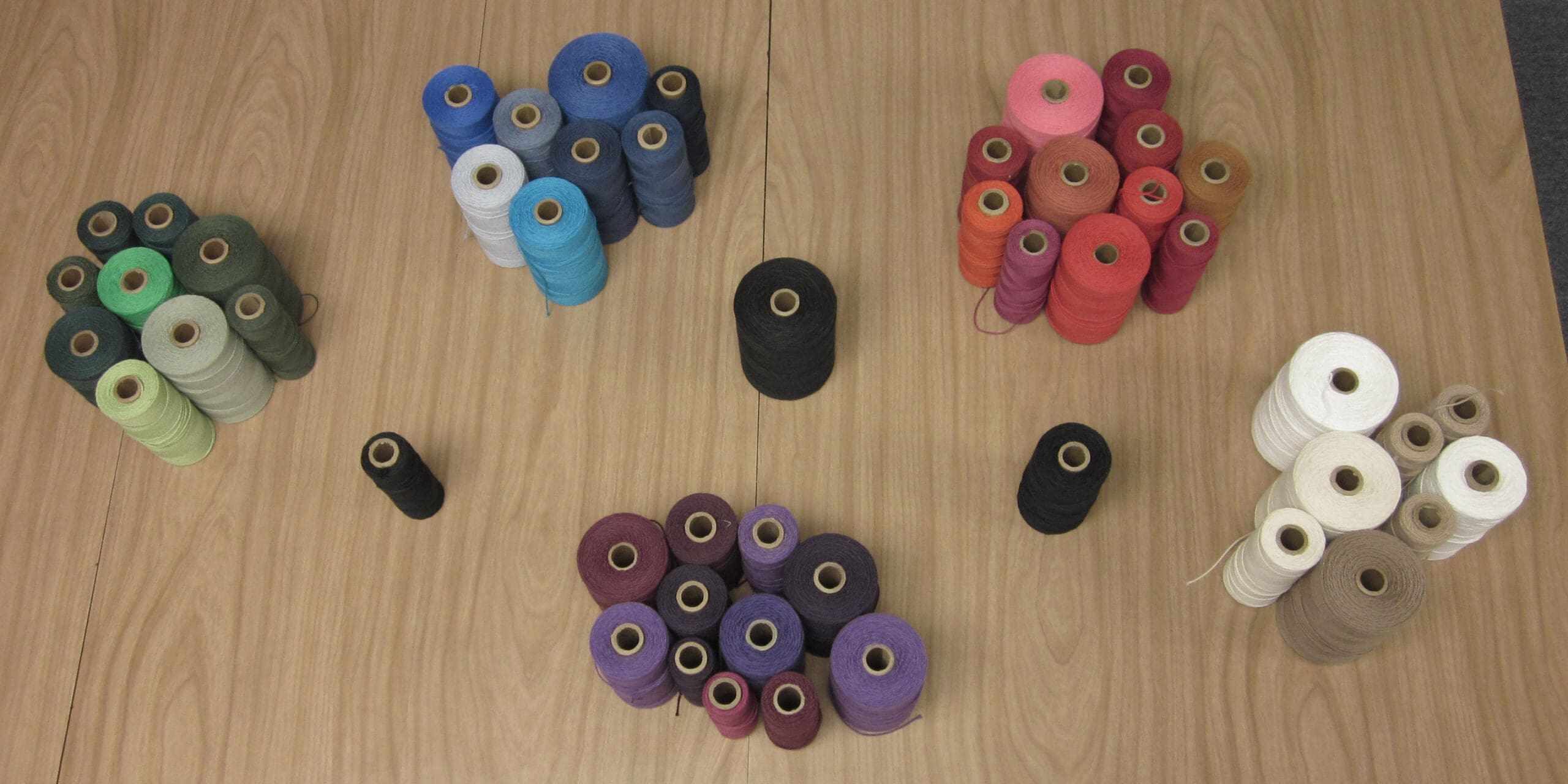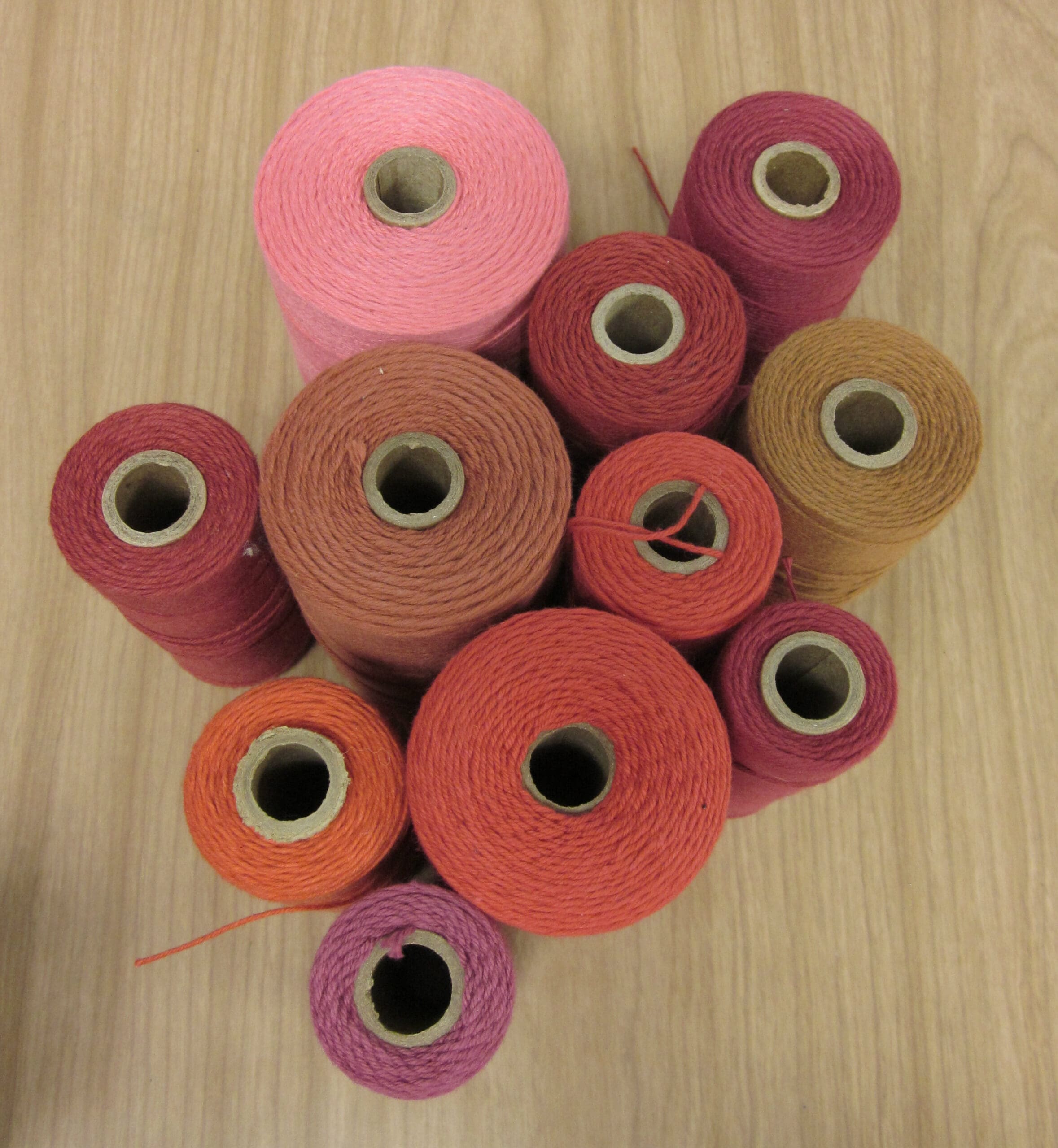 So to start, I begin pulling out yarn – 5 different groups of colors. I like using a cotton yarn called carpet warp or rug warp. It comes in a million colors and is very easy to work with!