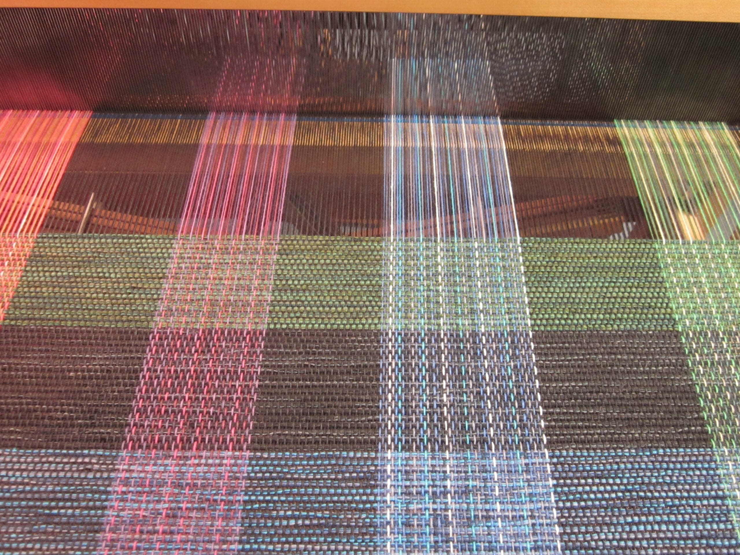 So for this fabric, I want to continue the black-spacing theme that I set up in the warp. The idea is I want to create fabric with blocks of color separated by black yarn. The tricky part is that I don’t want it to look plaid. Now, once the fabric is cut up into small bags, it won’t be as big a concern. But, at least you can appreciate the goal!