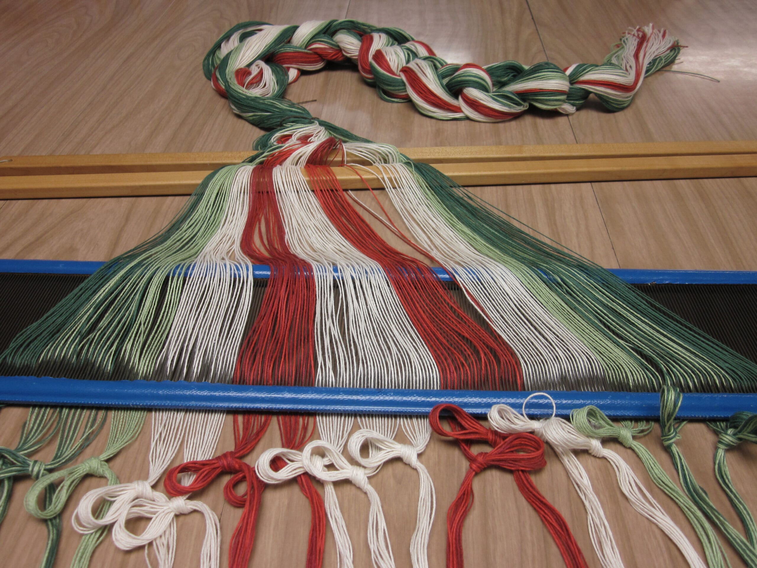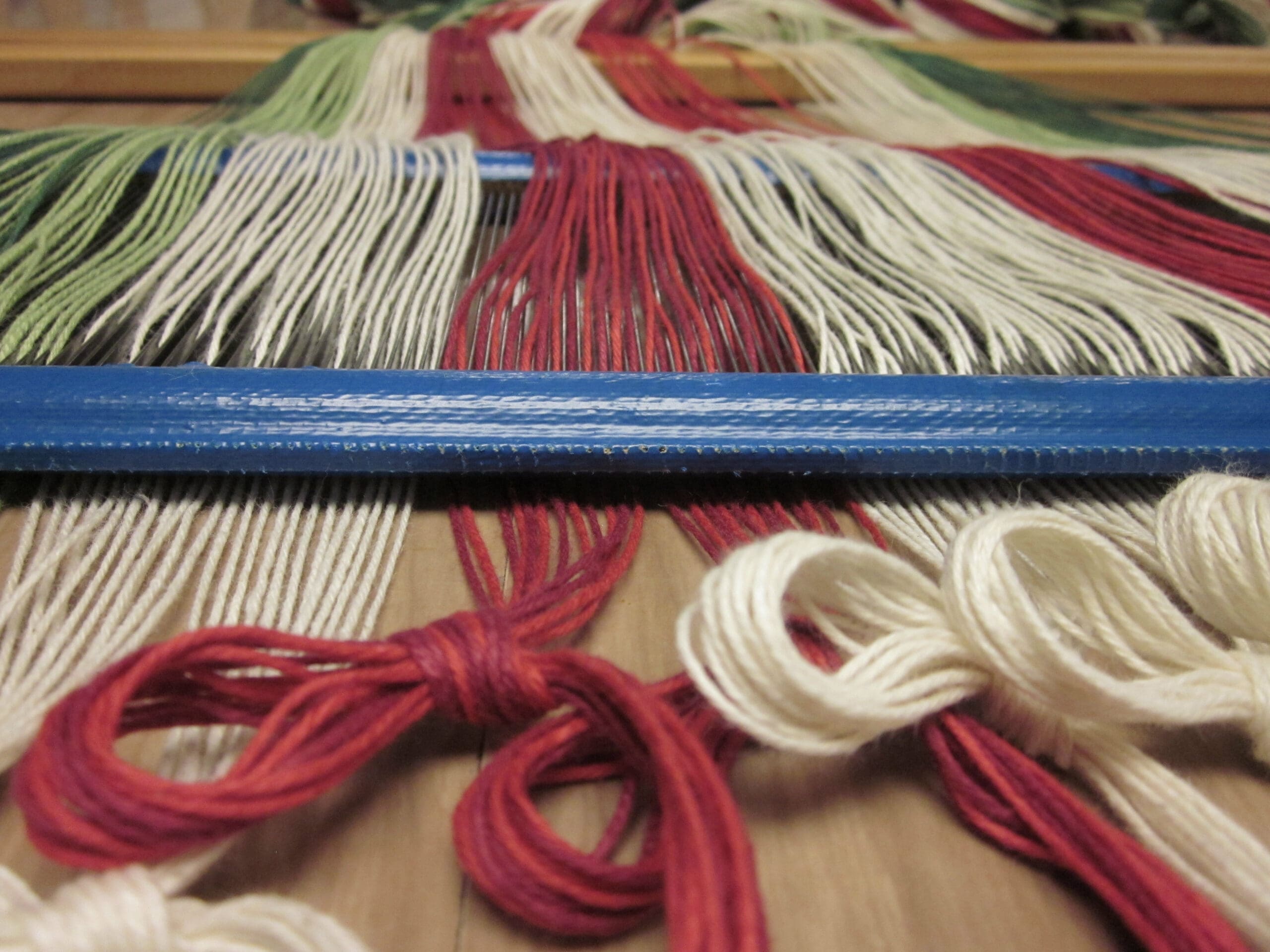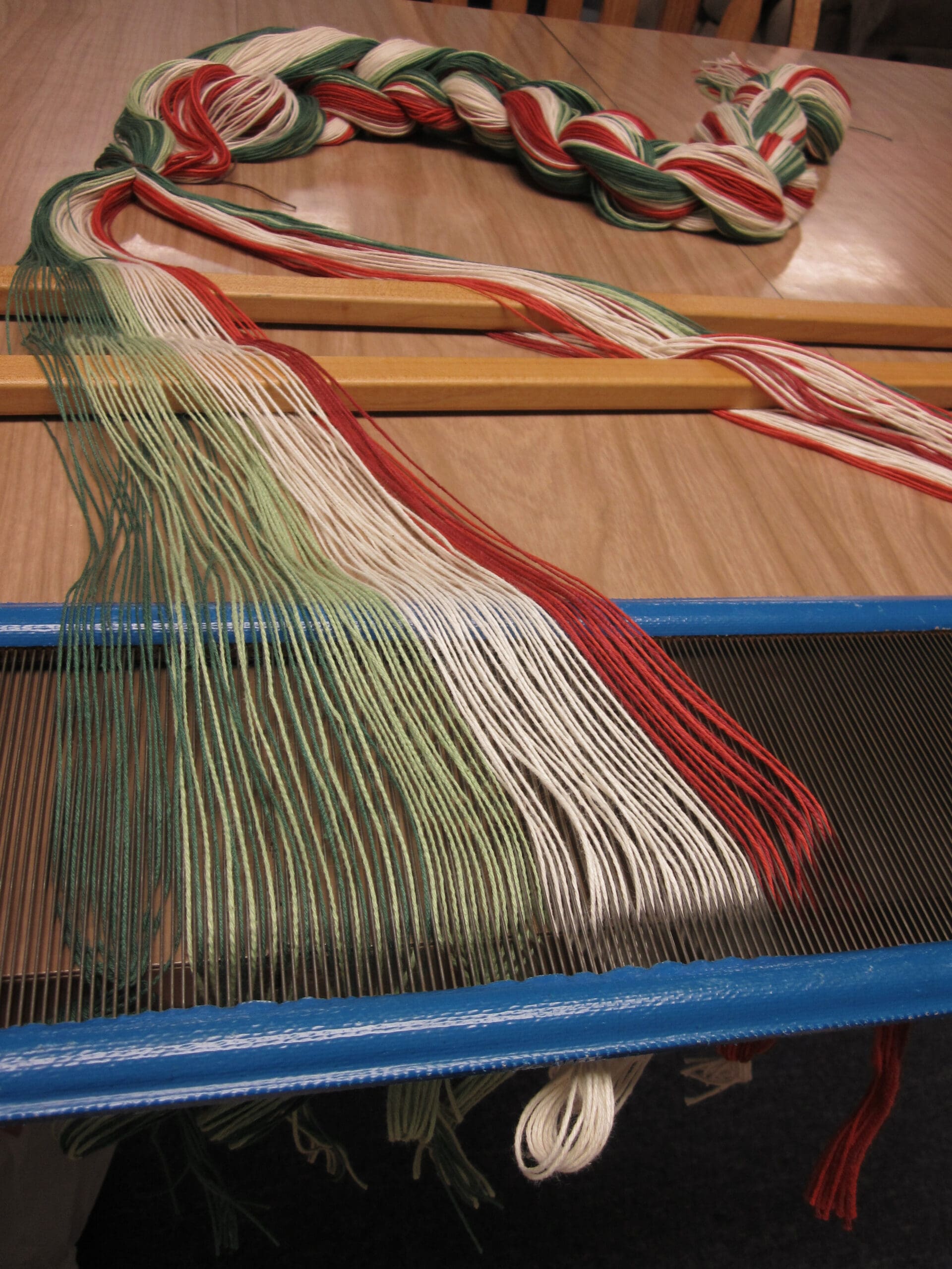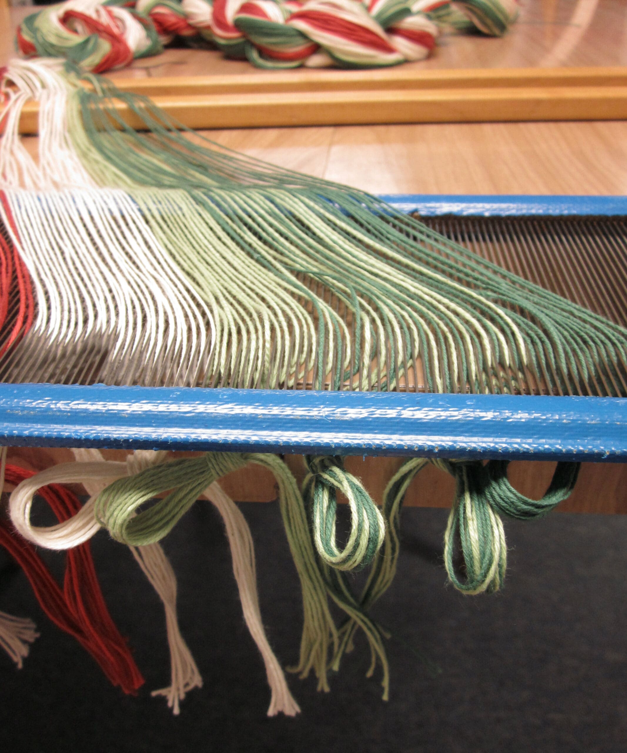 I like to make my projects as logical as possible. (The less frustration, the better – especially when setting up the loom!) So, I usually plan my projects in terms of each inch (solid green for inch 1, mixed green for inch 2, etc.). It helps immensely to knot each inch together after it’s through the reed! I can then easily verify that I have “x” amount of inches in the reed versus the “x” amount of inches I thought I put on the warping board.