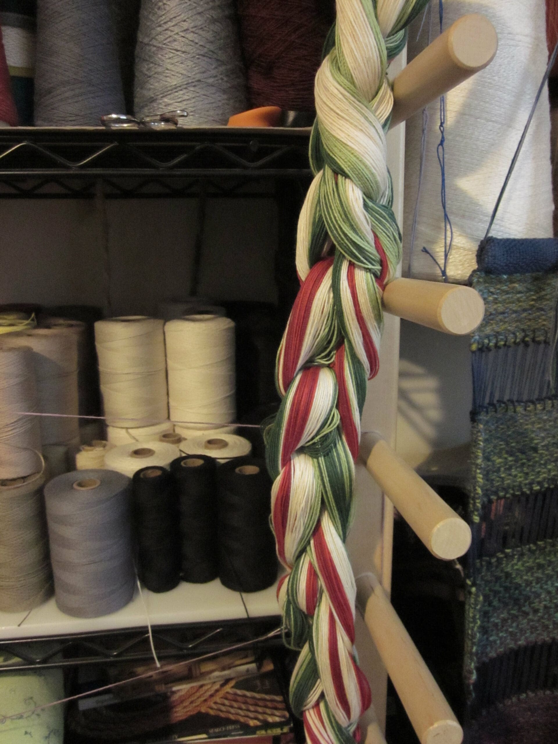 Next up, I’m taking the yarn off the warping board. To do this, I start at the bottom and twist my way up to the top. The goal here is to keep the yarns from falling apart all willy-nilly. So, when the twist comes off the warping board, it’s in a format that doesn’t allow the yarns to slip out, knot up or generally cause me pain and suffering.