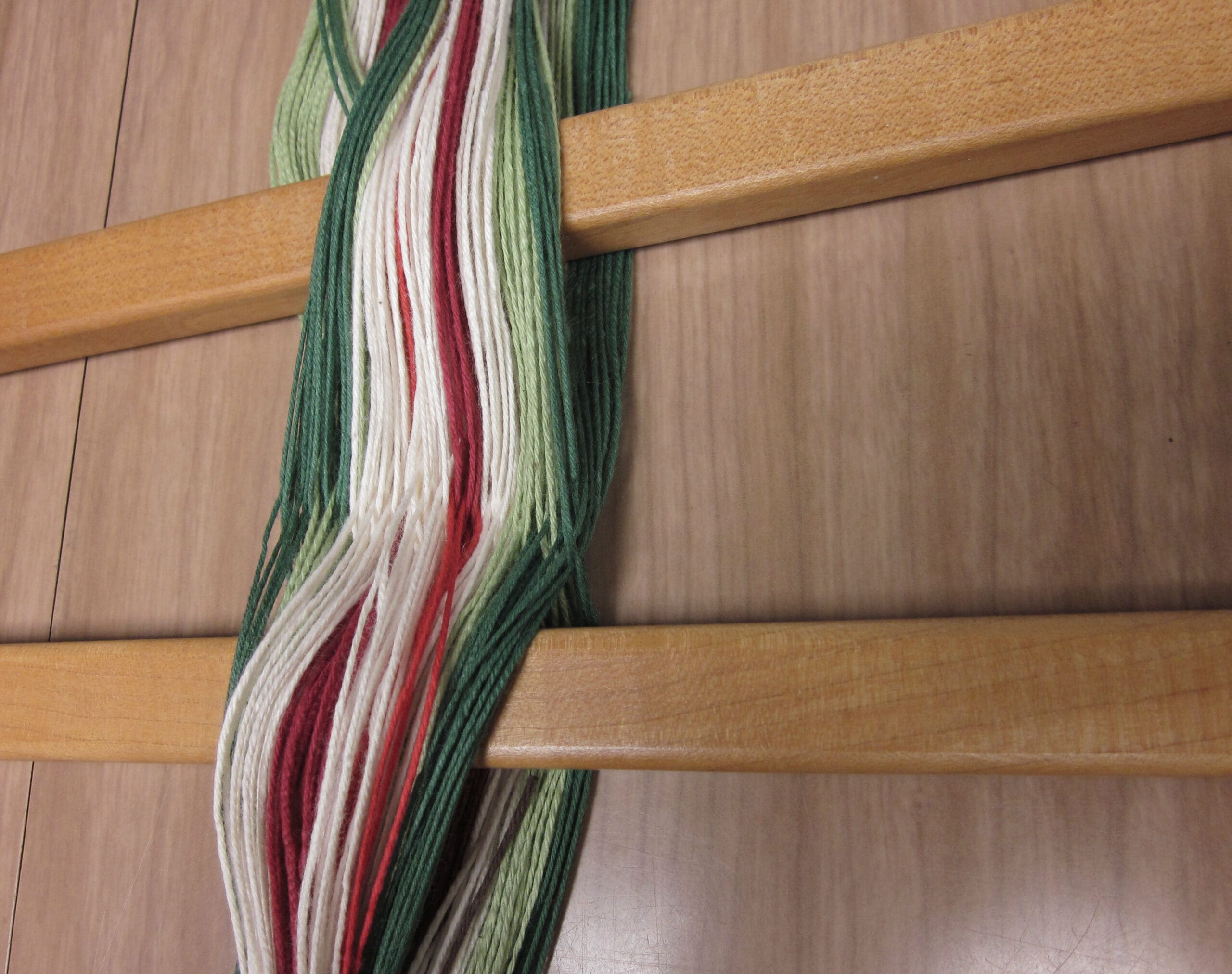 Next, I’m heading over to the table to slide in the lease sticks and sley the reed! Lease sticks are 2 sticks with some way to tie them together at each end. Mine have little holes , but I’ve seen many other styles. The lease sticks keep the cross in place. I’ve spent quite a bit of time putting each yarn in order. I don’t want to mess up the order now!