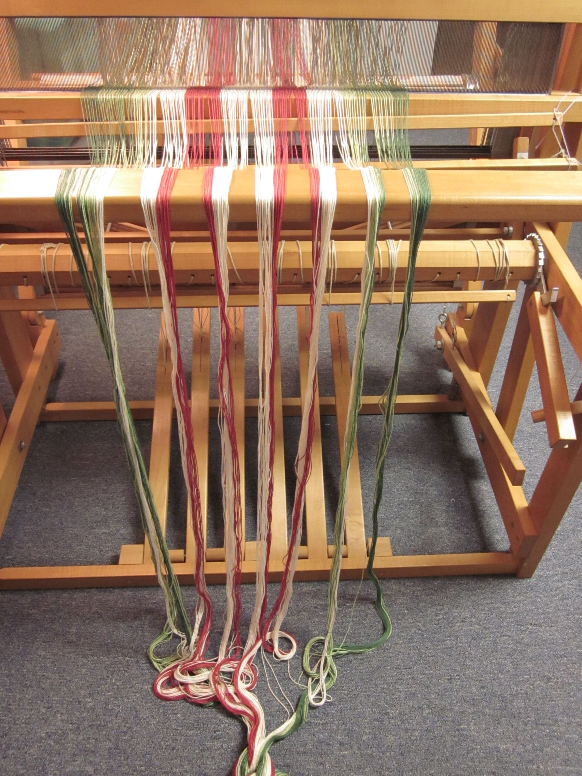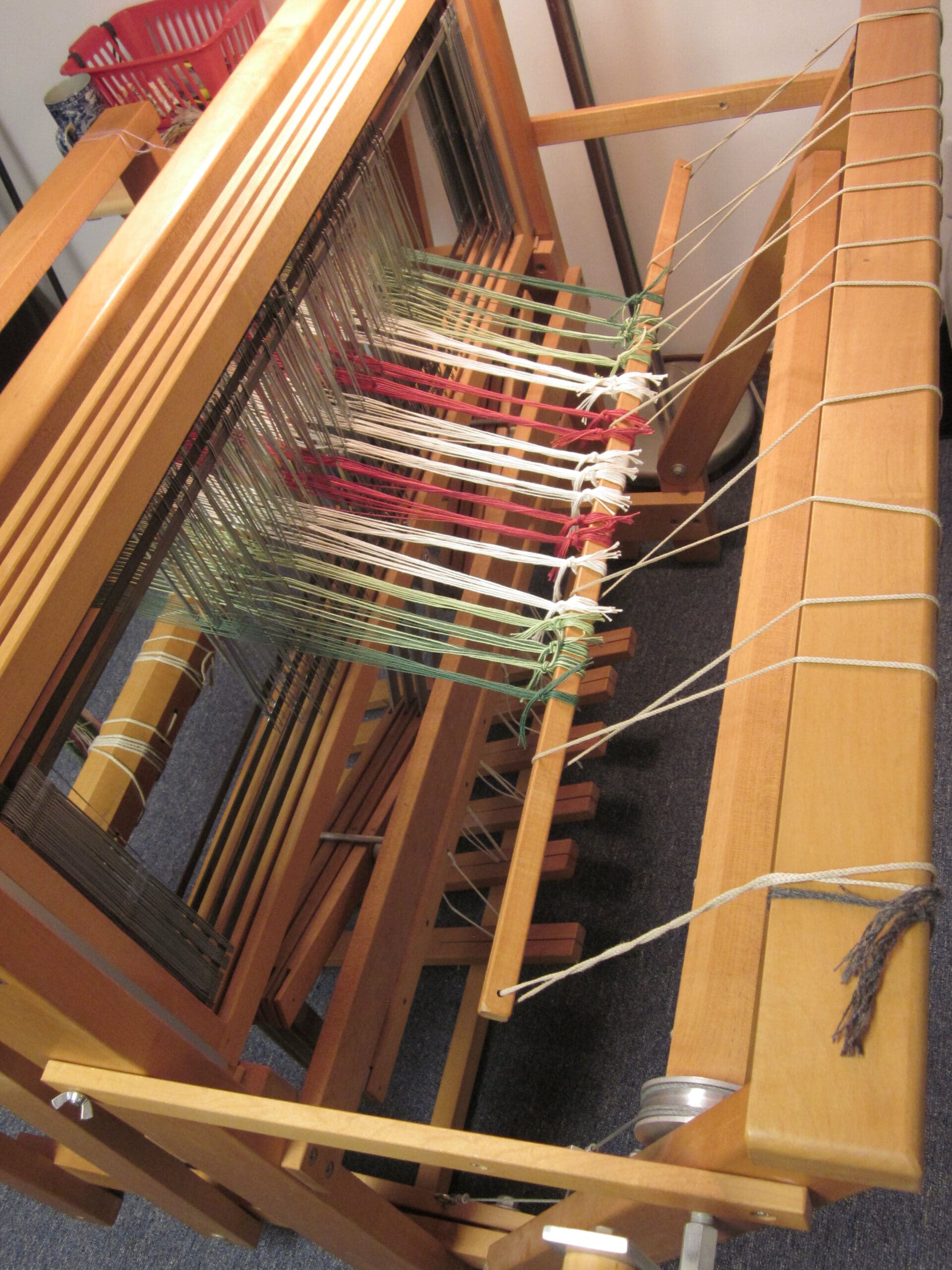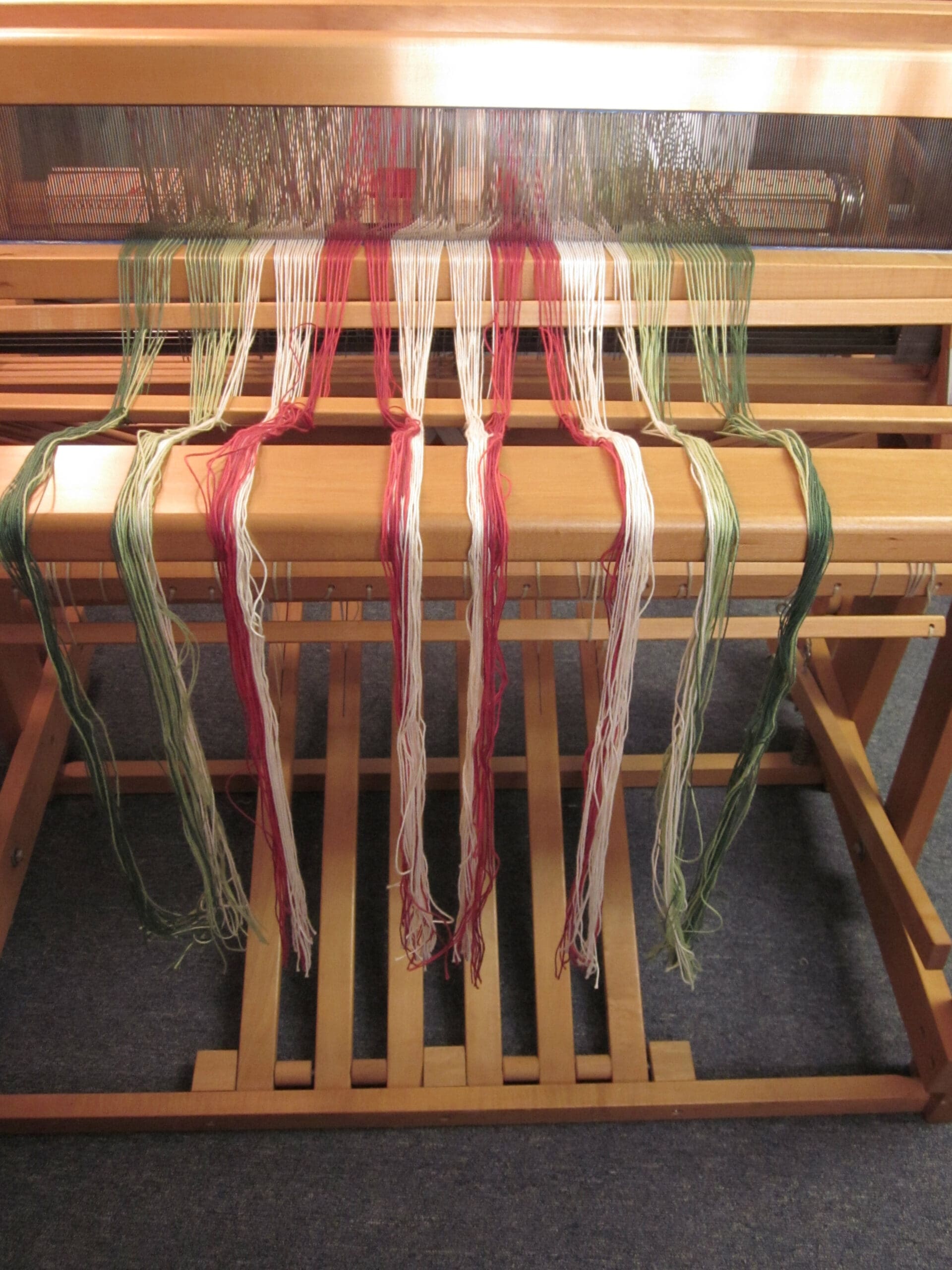 So, before I begin weaving, I have to be sure the loom is set up correctly for the pattern. To do this, I have to crawl under the loom. (Again, where the yoga comes in handy!) The pedals under the loom (they are called treadles) and the shafts (frames that hold the heddles, which hold the yarn) are connected. I have to be sure they are connected per the pattern I’m following. A little tricky to explain. But, at least you can see the underbelly of the loom!