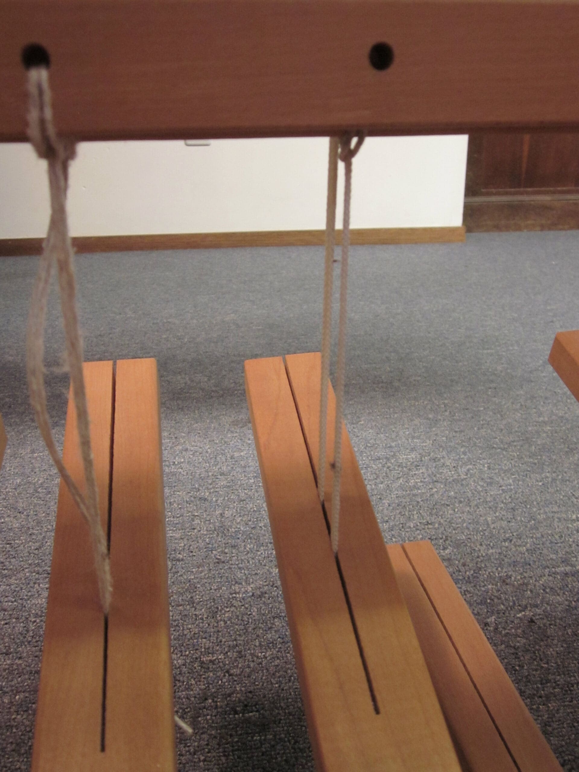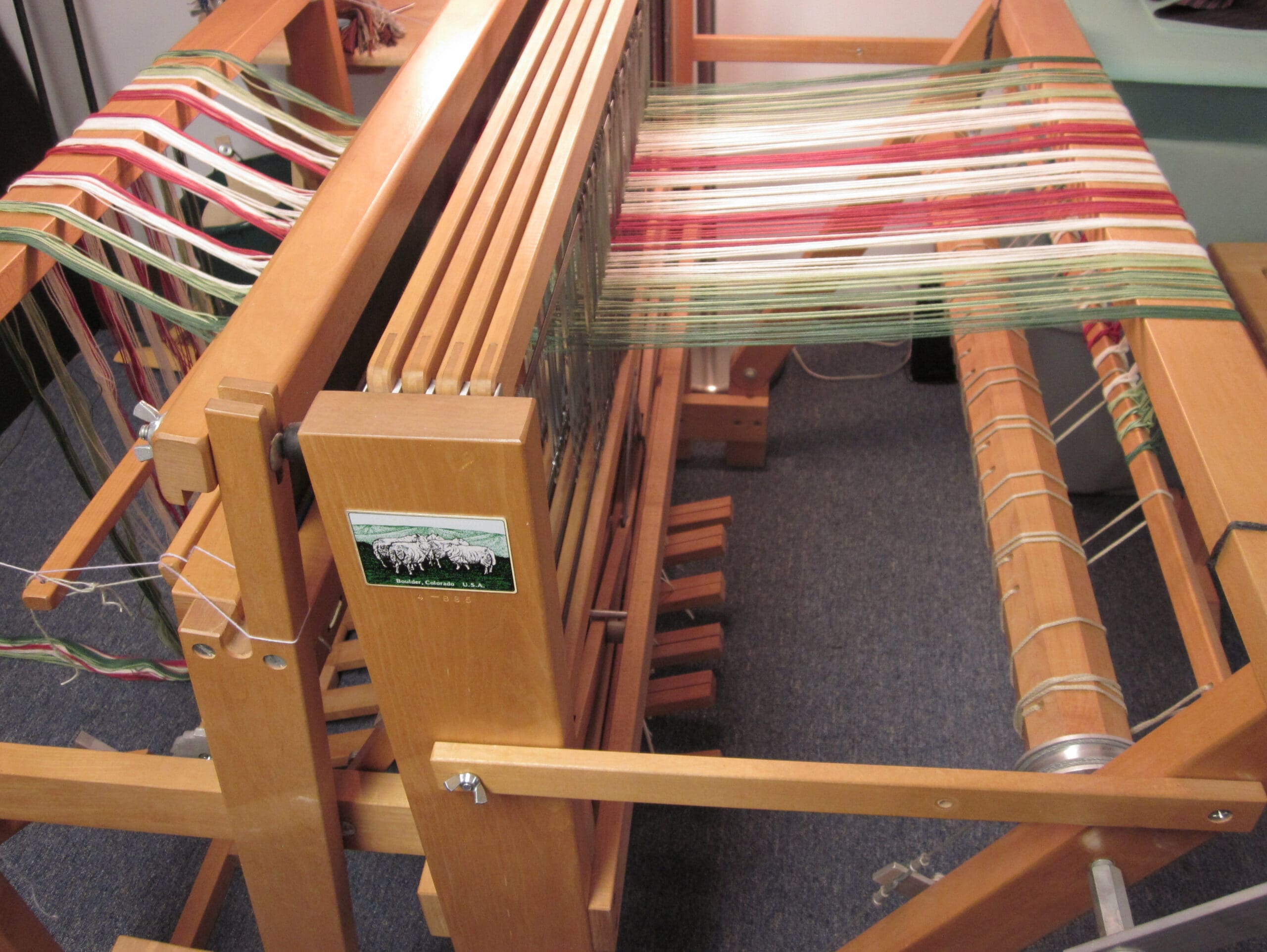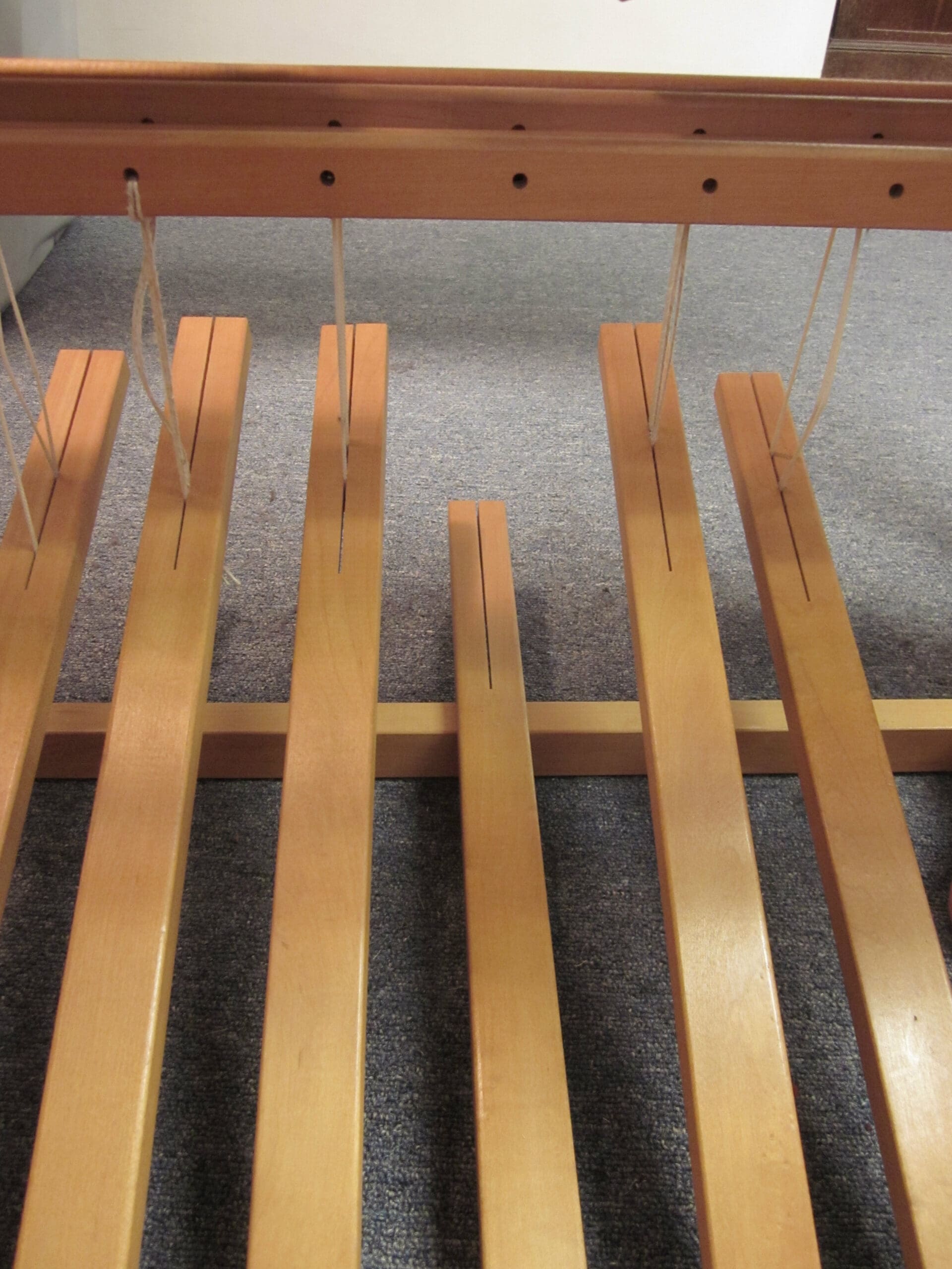 So, before I begin weaving, I have to be sure the loom is set up correctly for the pattern. To do this, I have to crawl under the loom. (Again, where the yoga comes in handy!) The pedals under the loom (they are called treadles) and the shafts (frames that hold the heddles, which hold the yarn) are connected. I have to be sure they are connected per the pattern I’m following. A little tricky to explain. But, at least you can see the underbelly of the loom!