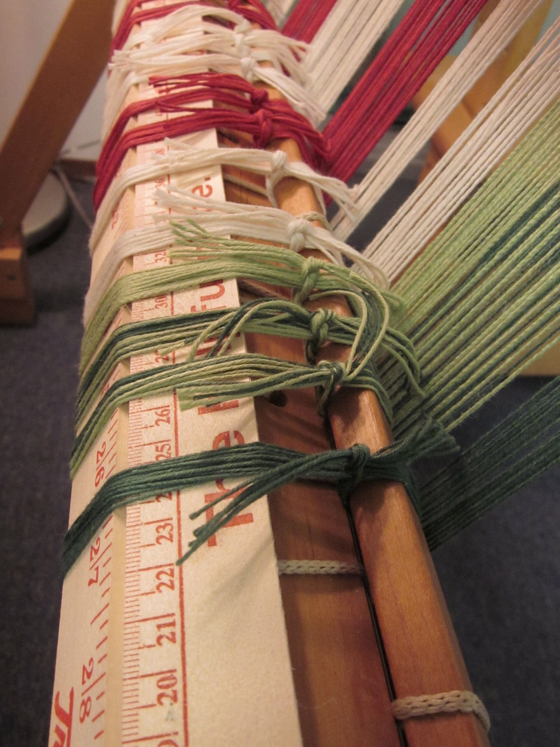 Oh! And while all this is going on, I’m feeding yardsticks into the back to keep the yarn from creating mountains and valleys, which would mess with the tension.