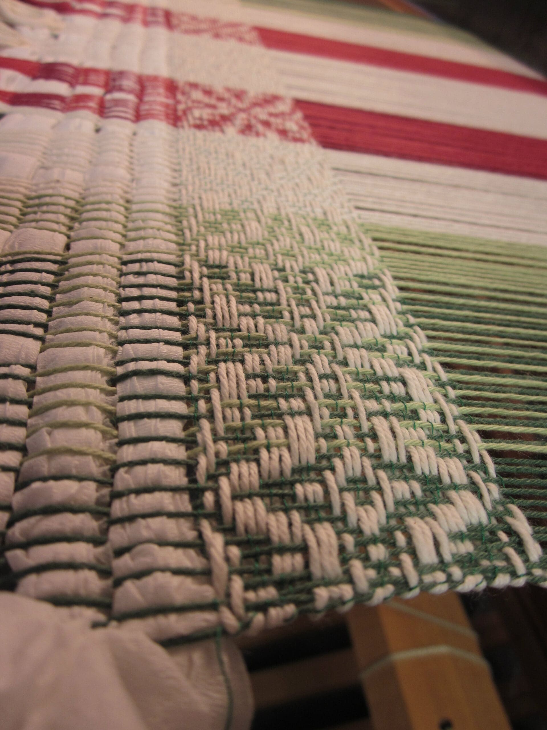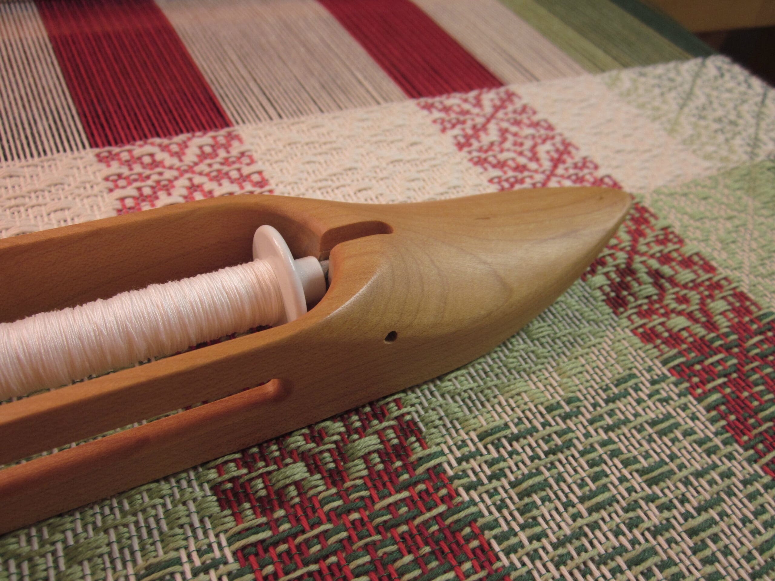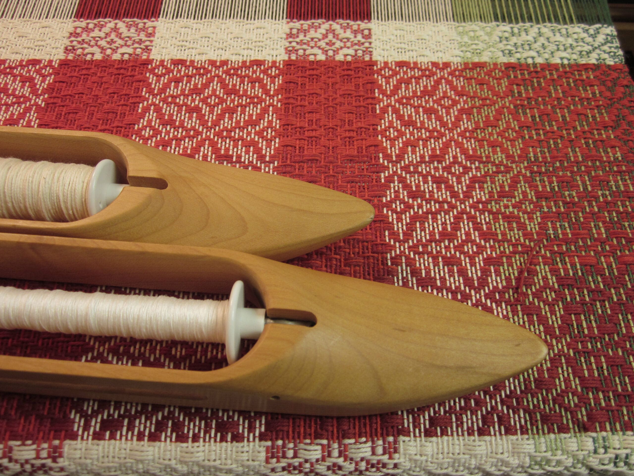 When weaving overshot (that’s the type of pattern this is), you need two shuttles. One shuttle has a fat yarn that makes the pattern and the other has a tiny yarn that holds it together.