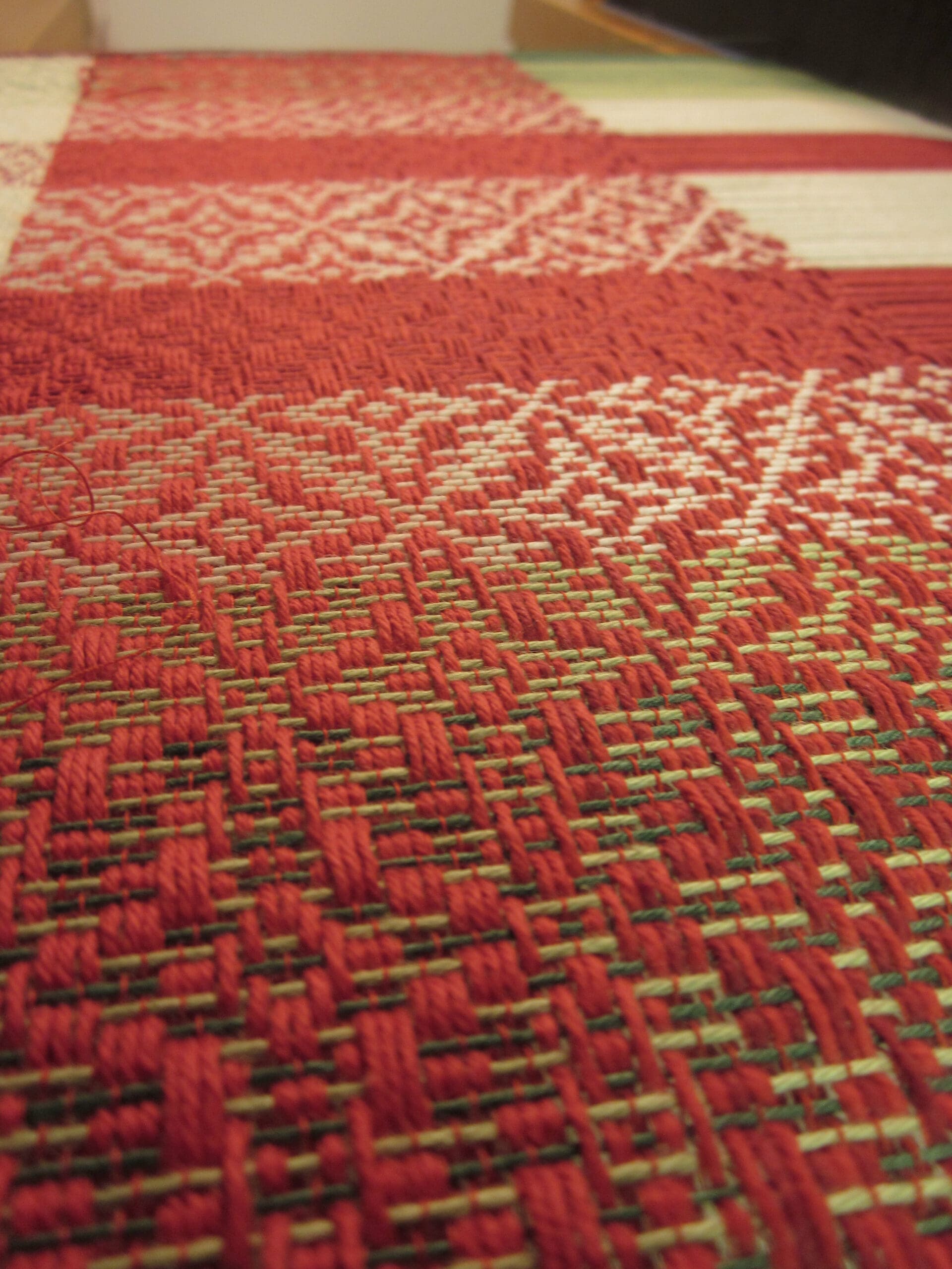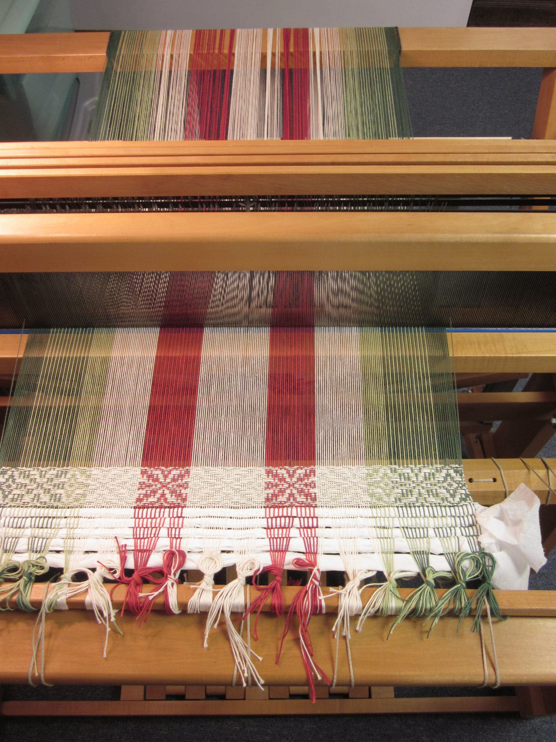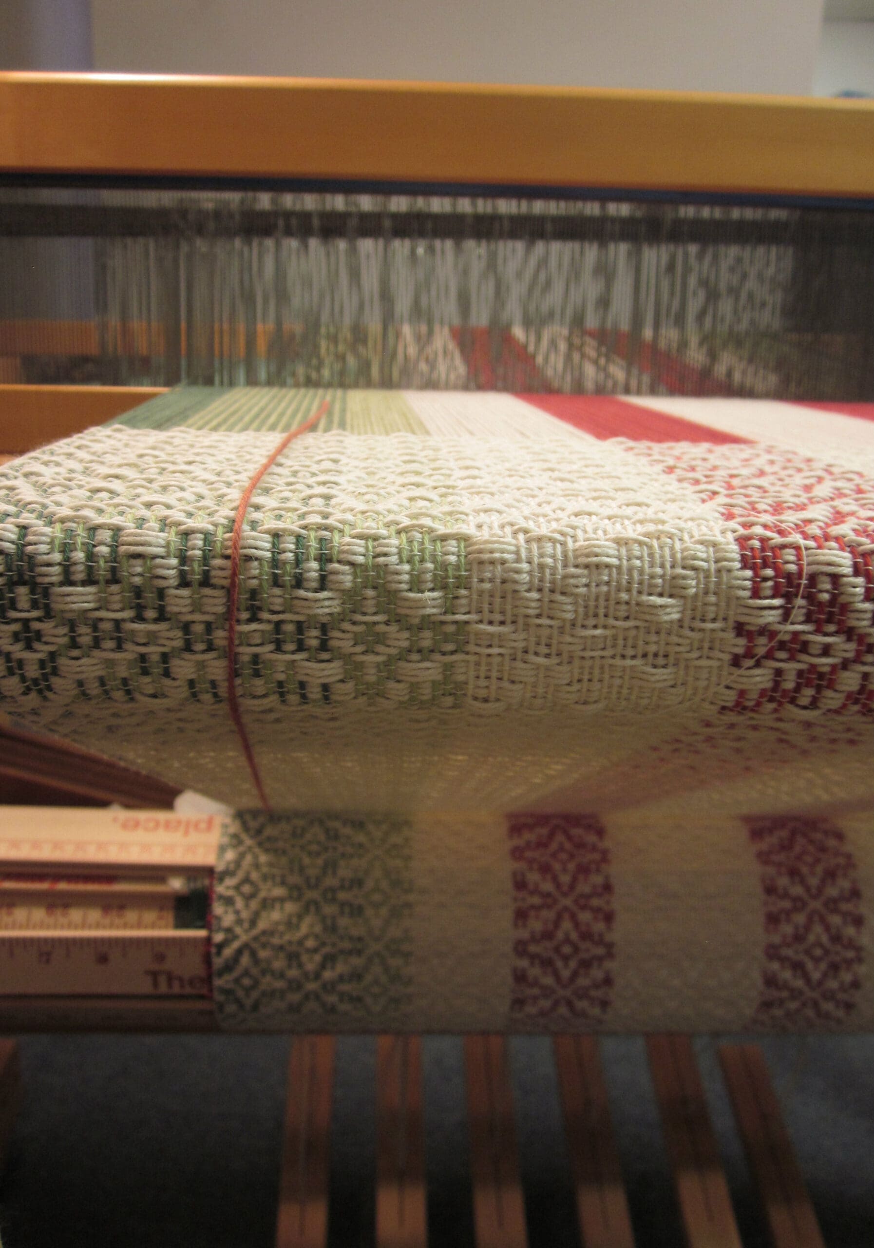 And so it goes! Switch the shafts, throw the shuttle, switch, throw, switch,… you get the idea! Next up, I’ll finish the weaving and cut it off the loom. Stay tuned…