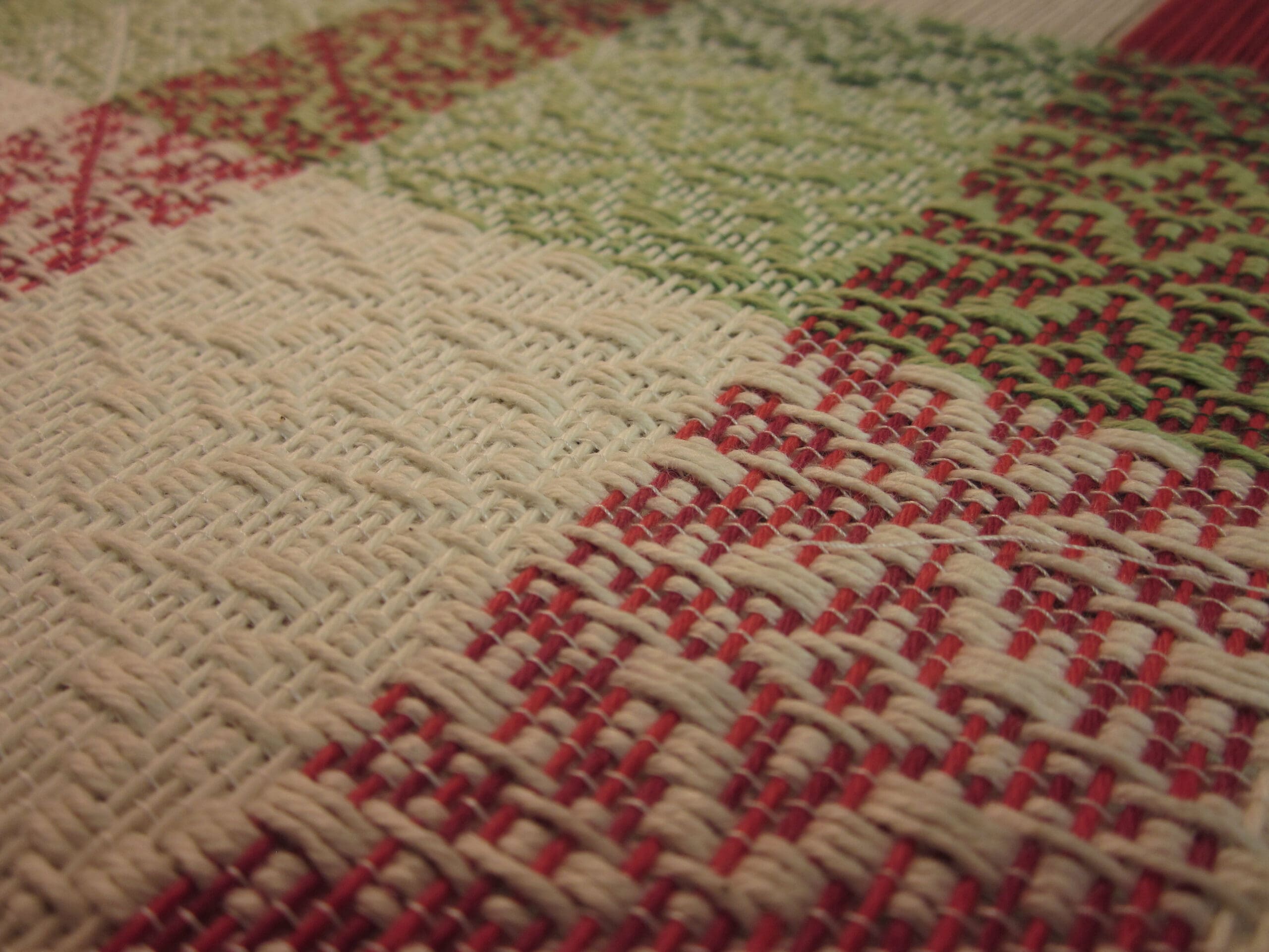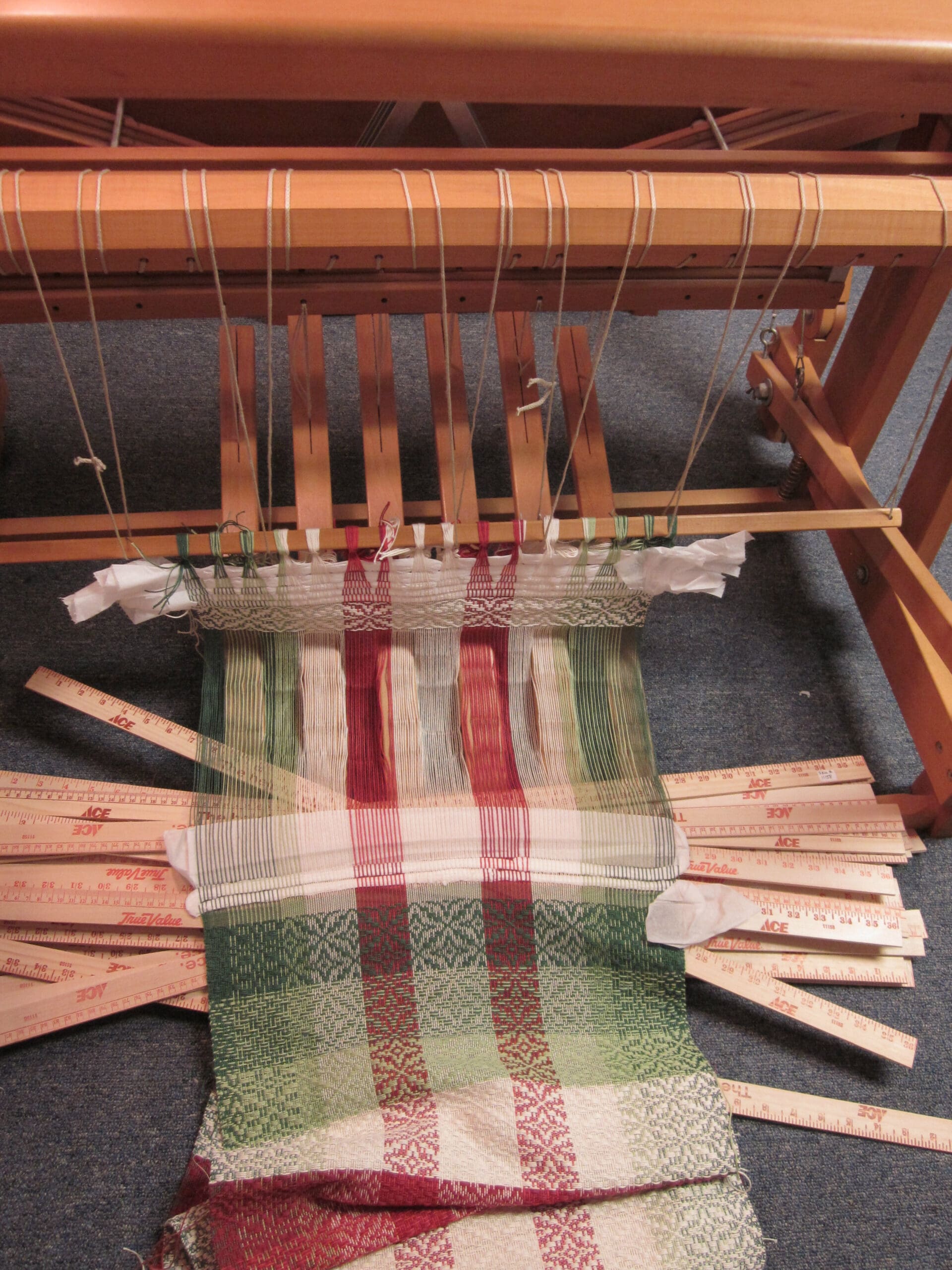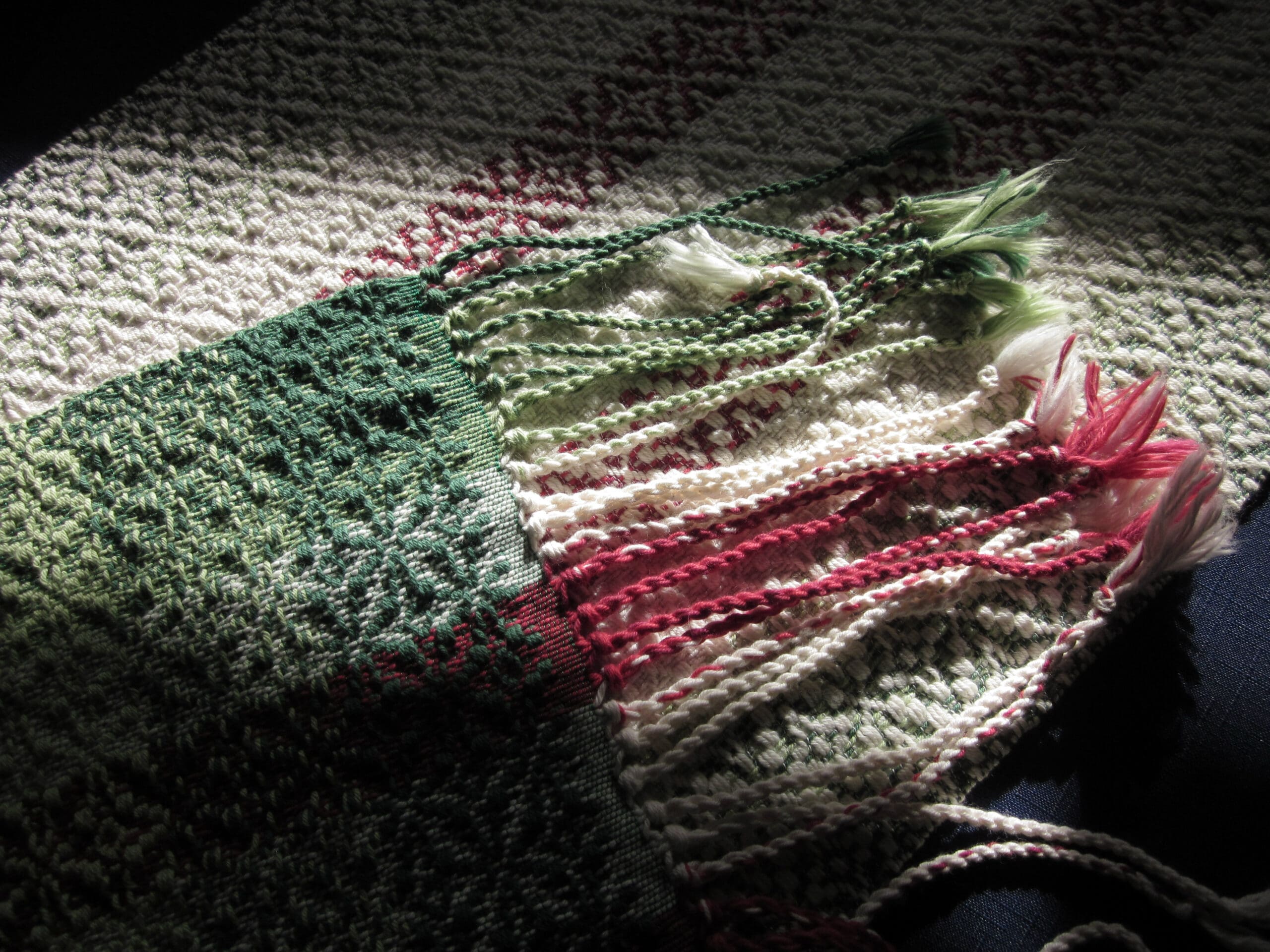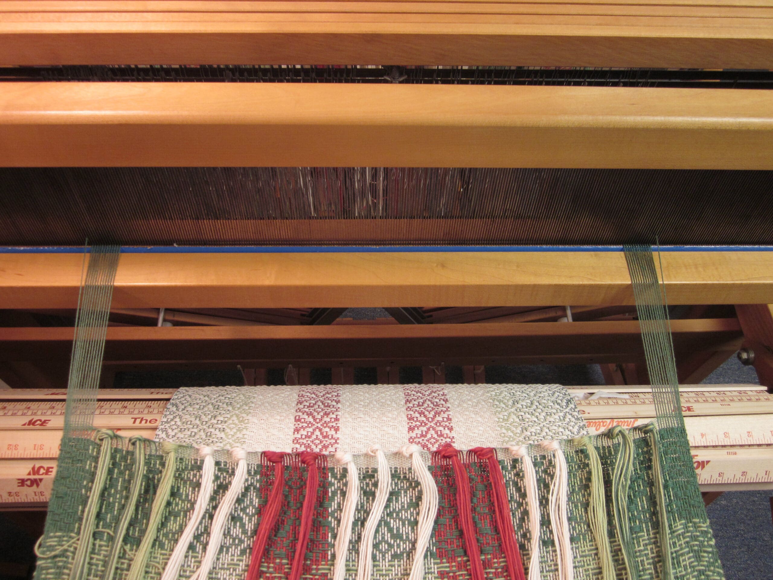 The ends are good! Time for the washing machine. I used all cotton for this project so it’s going to shrink! The question is how much. I planned for 15%, which was pretty close! Thankfully! I purposely wove the project big, anticipating it would end up a particular size once it shrunk. A little wash in cold water with lots of Color Catcher, and then a little spin in dryer (still a bit damp when it comes out), and we have ourselves a Christmas table runner! WooHoo!