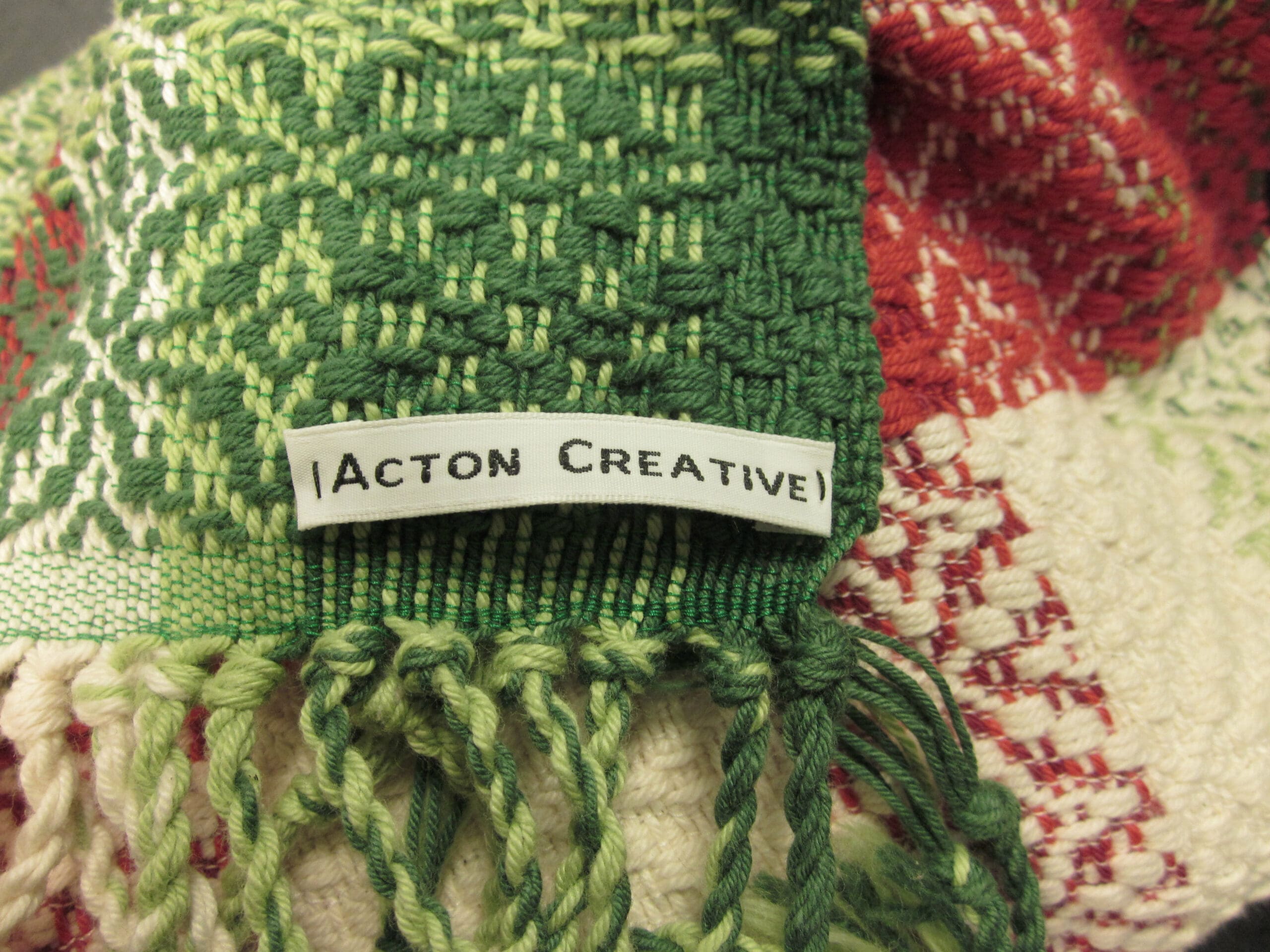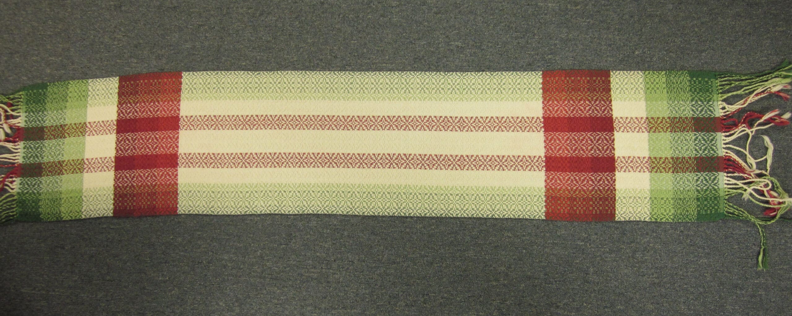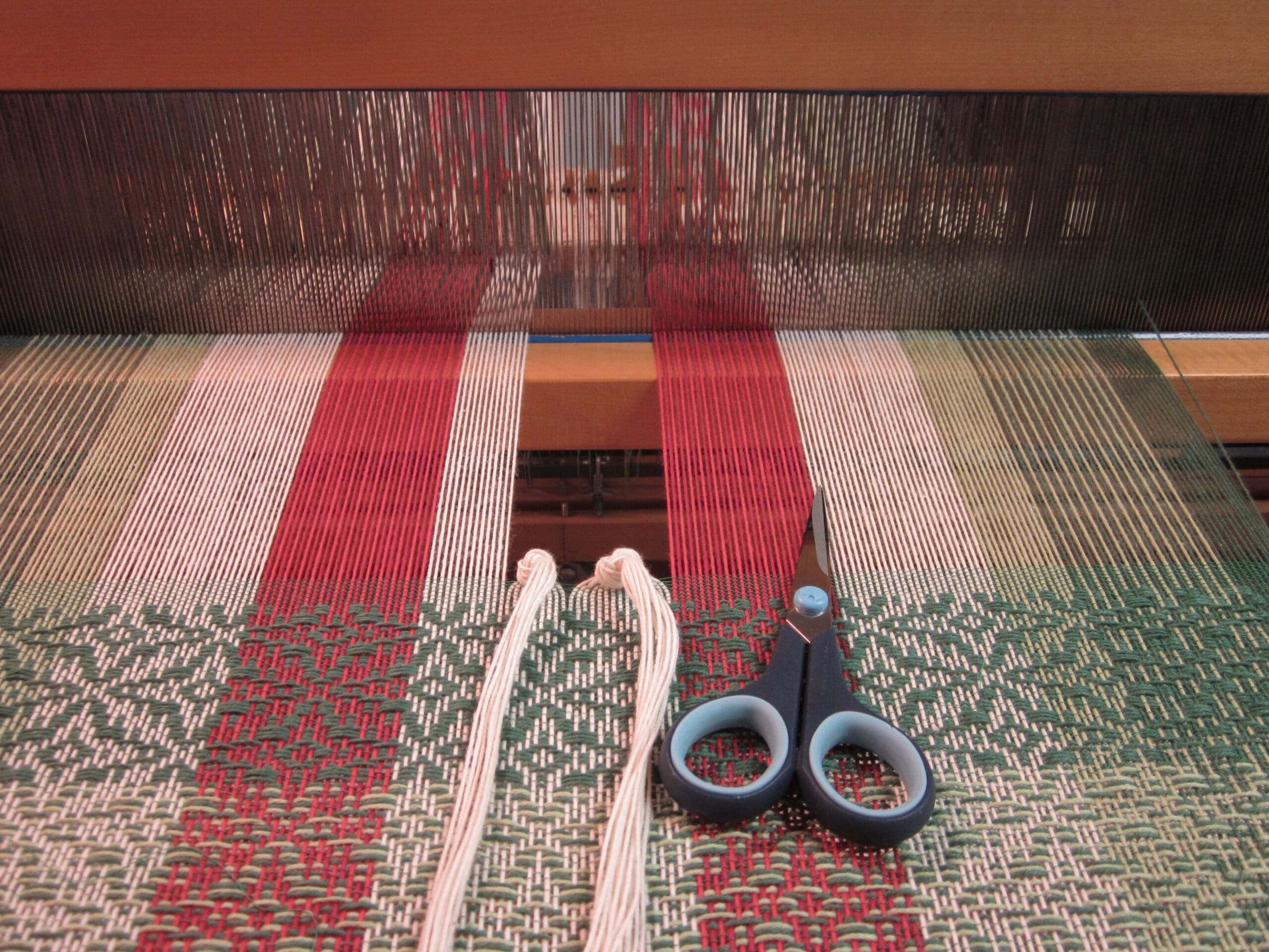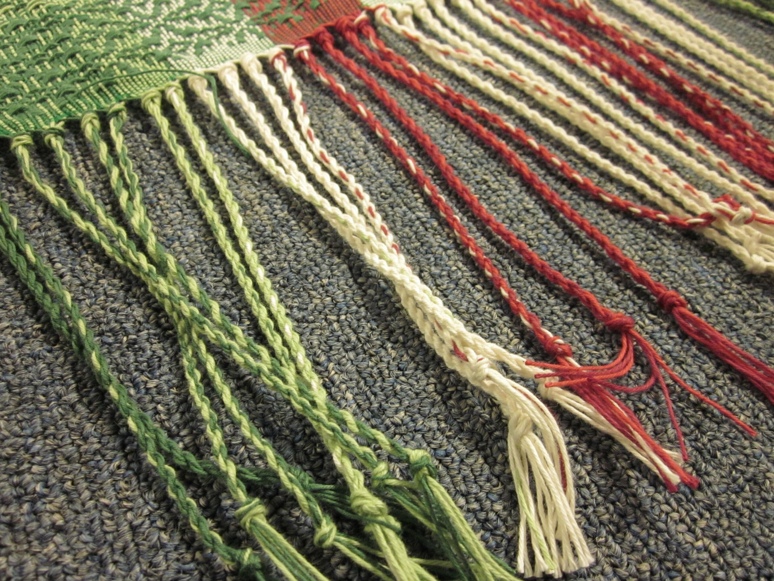 The ends are good! Time for the washing machine. I used all cotton for this project so it’s going to shrink! The question is how much. I planned for 15%, which was pretty close! Thankfully! I purposely wove the project big, anticipating it would end up a particular size once it shrunk. A little wash in cold water with lots of Color Catcher, and then a little spin in dryer (still a bit damp when it comes out), and we have ourselves a Christmas table runner! WooHoo!