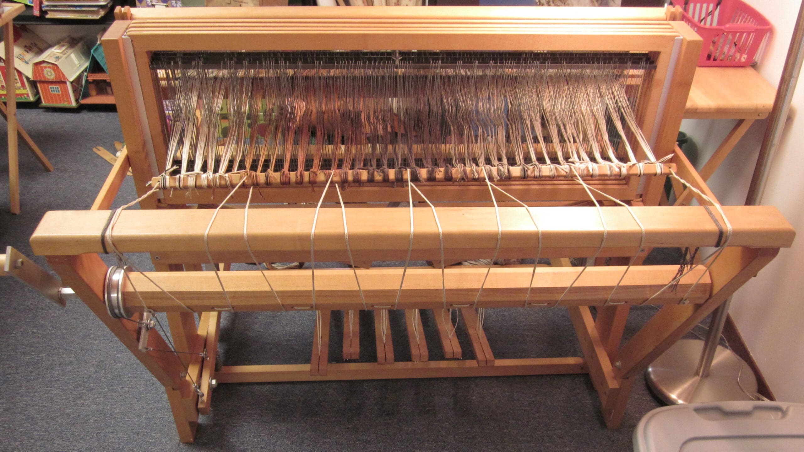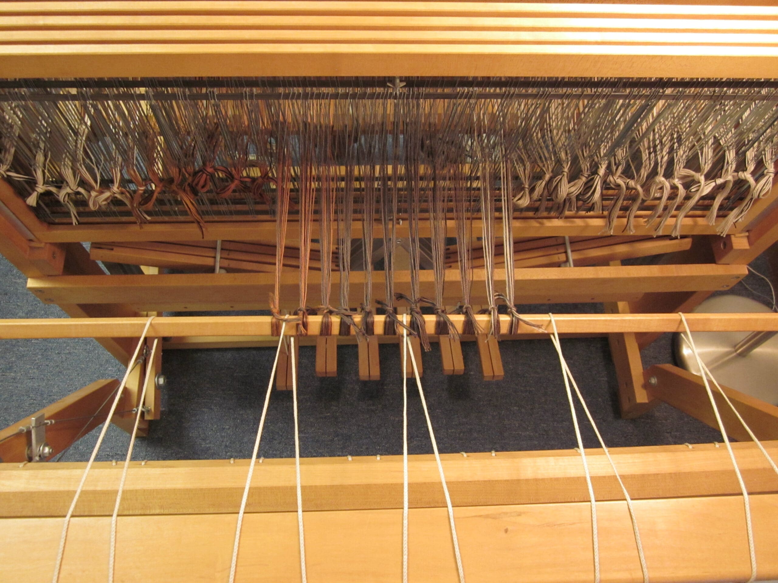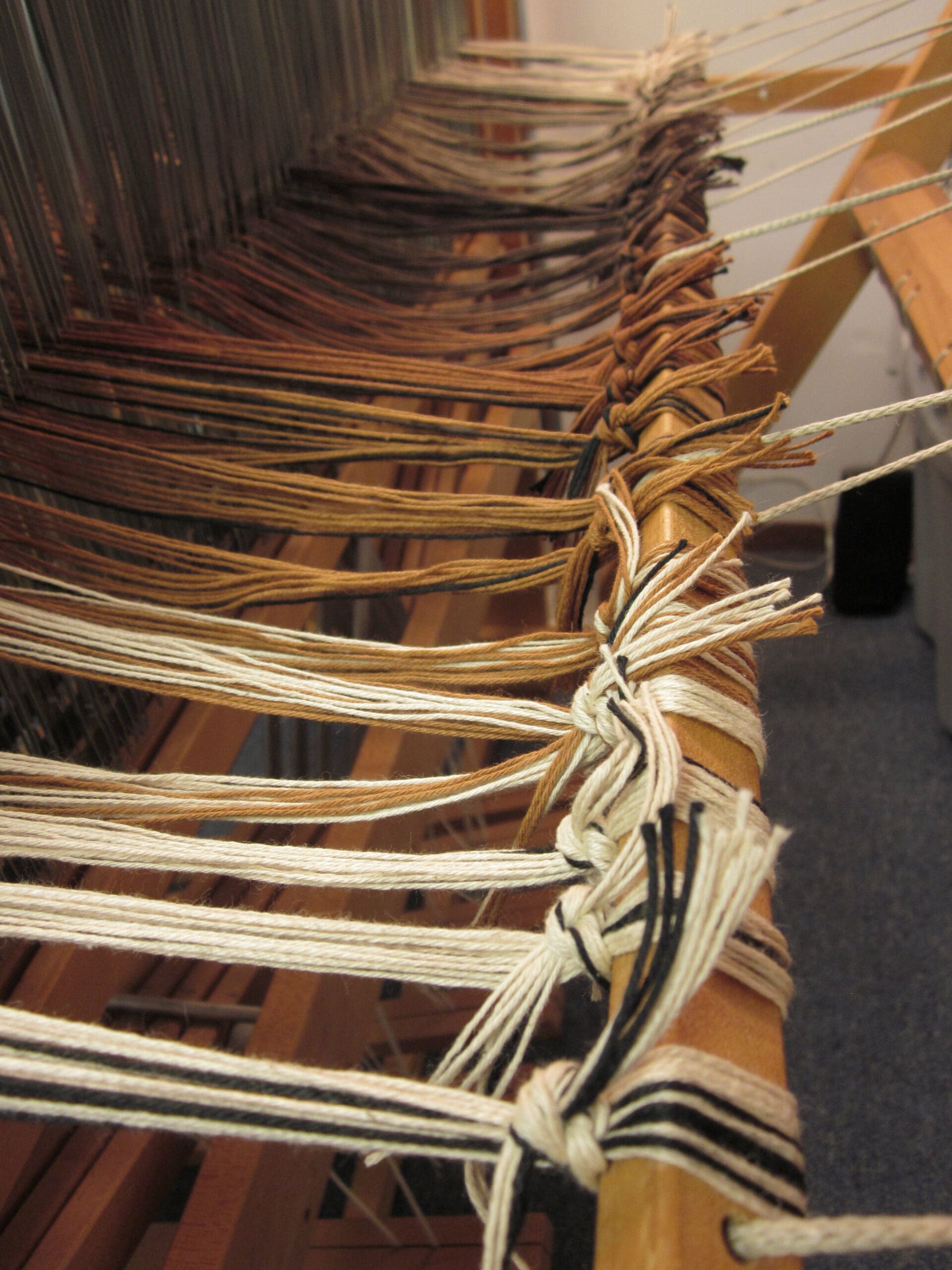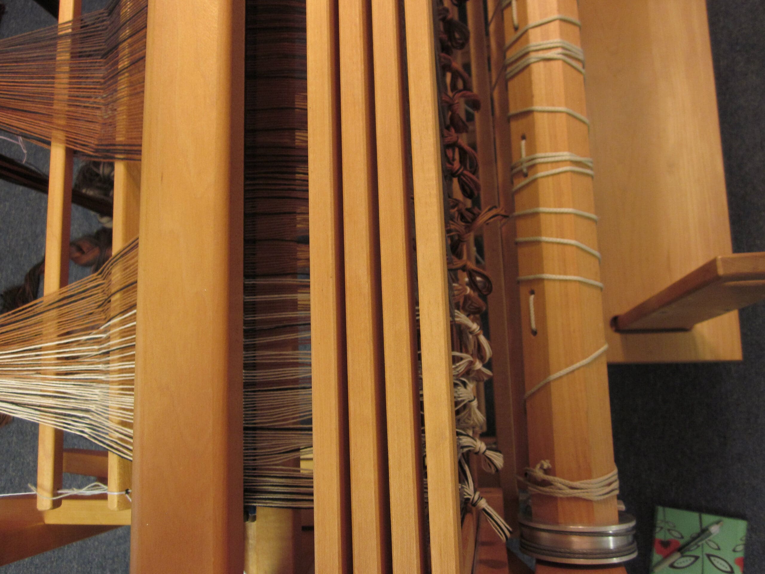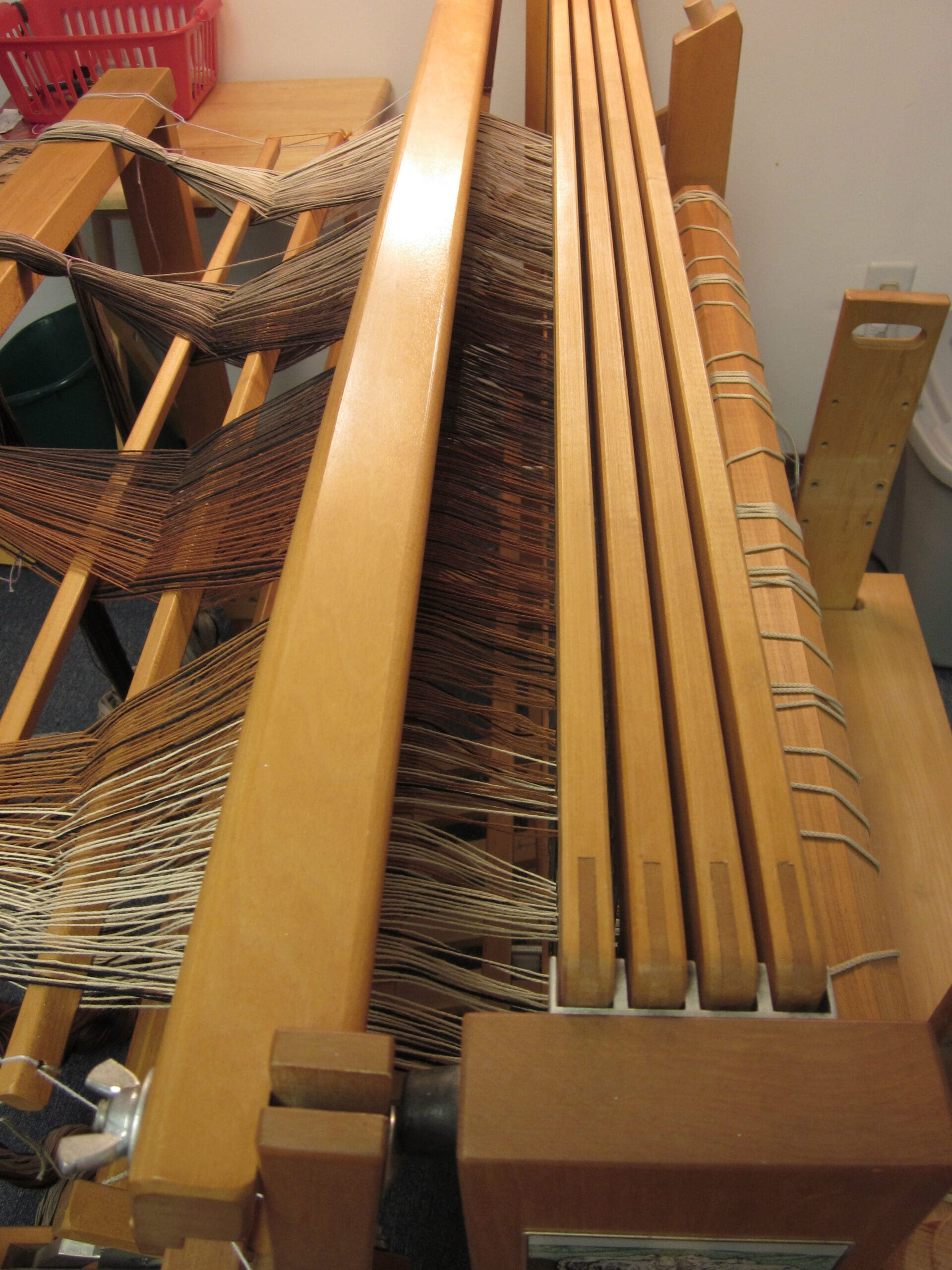 To give you an idea of size, when the back is extended, the loom uses a little less than a 4′ x 4′ space. There’s a skinny rod that is lashed onto the back beam. This is what all the groups of yarns are tied to in the next step.