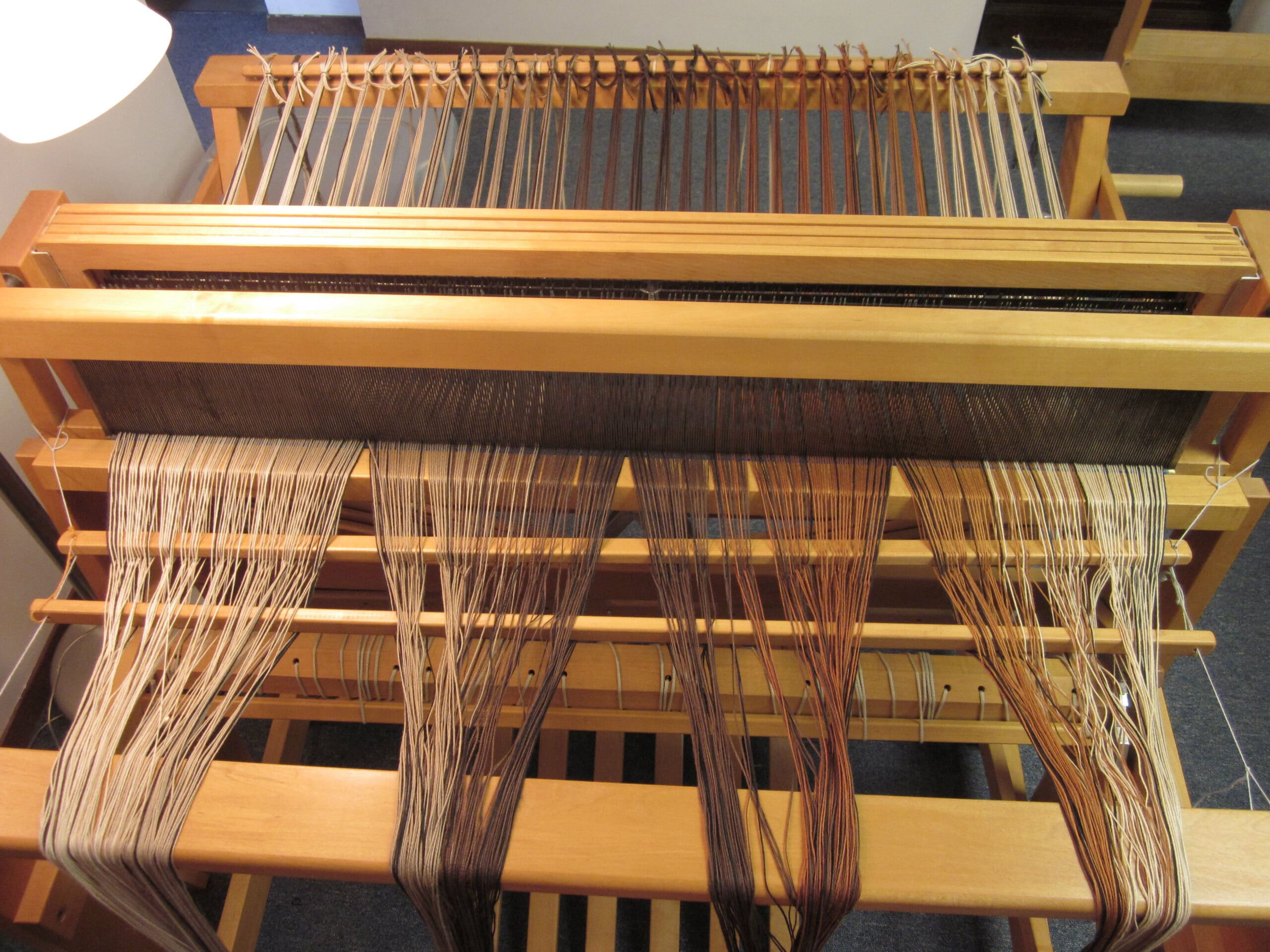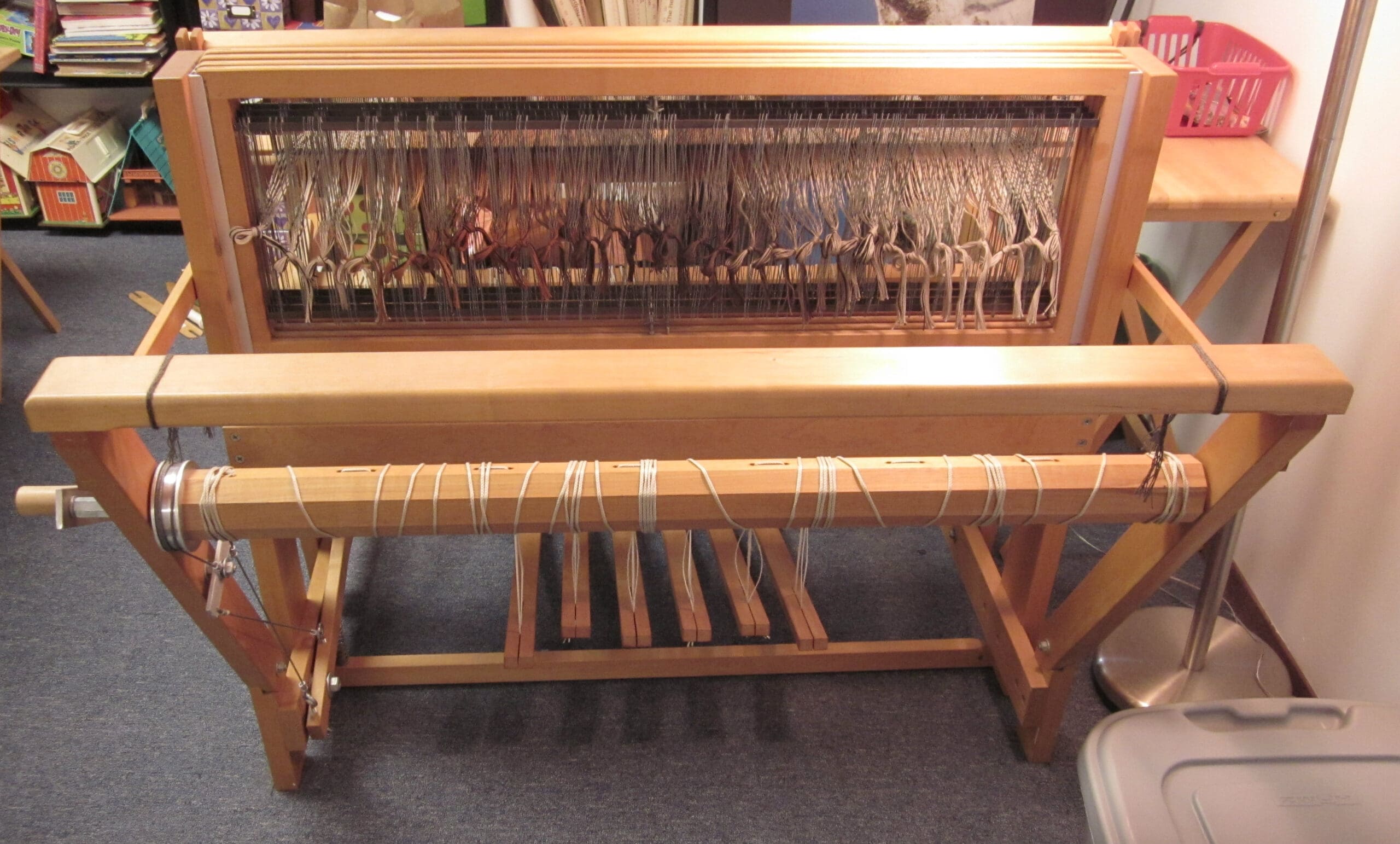 When I thread the heddles, I try to get as close as possible. Thankfully, the back of my loom collapses, allowing me to sit nice and close. But, when I begin winding on, I need to unfurl the back to it’s full extension. (You can see in the bird’s eye view below, how close the back beam can sit – the back beam is the one with all the cording wrapped around it.)