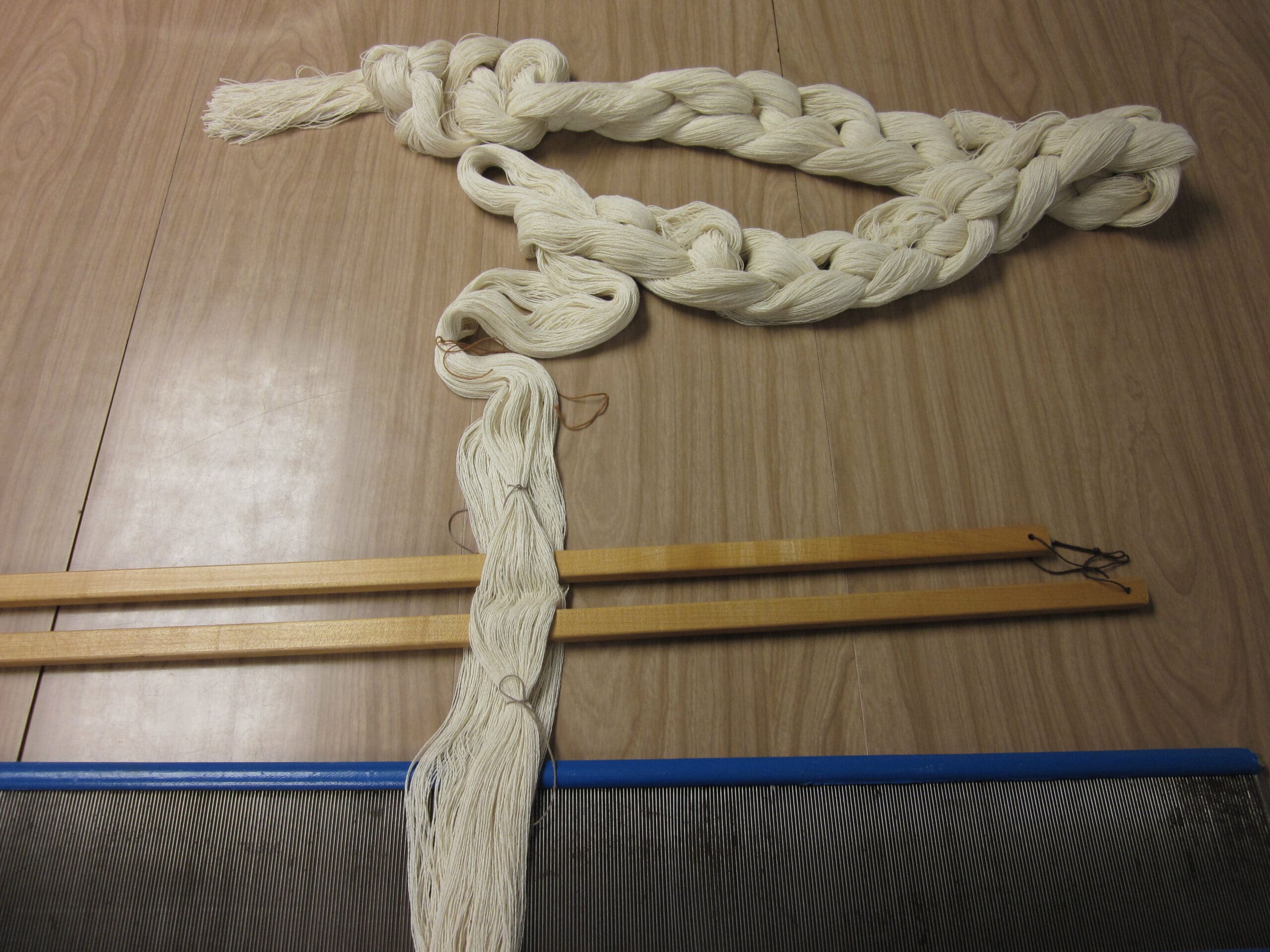 (So, the title doesn’t really work – noun, verb problem. But, sometimes inspiration is an illusive, little, b-!) Next up in the coverlet project, let’s sley the reed! The yarn has been measured on the warping board and has been twisted off. Next step, insert the lease sticks!