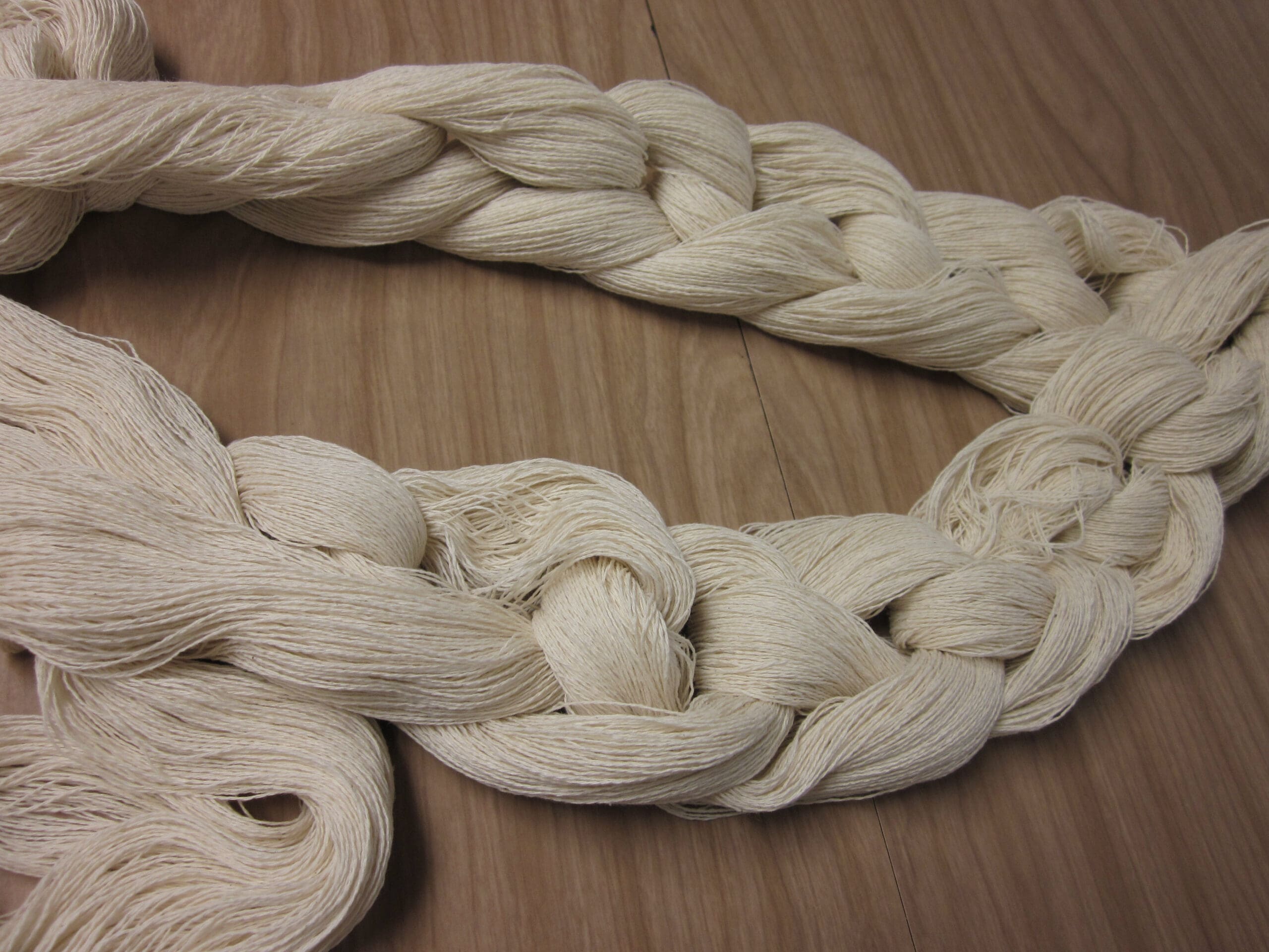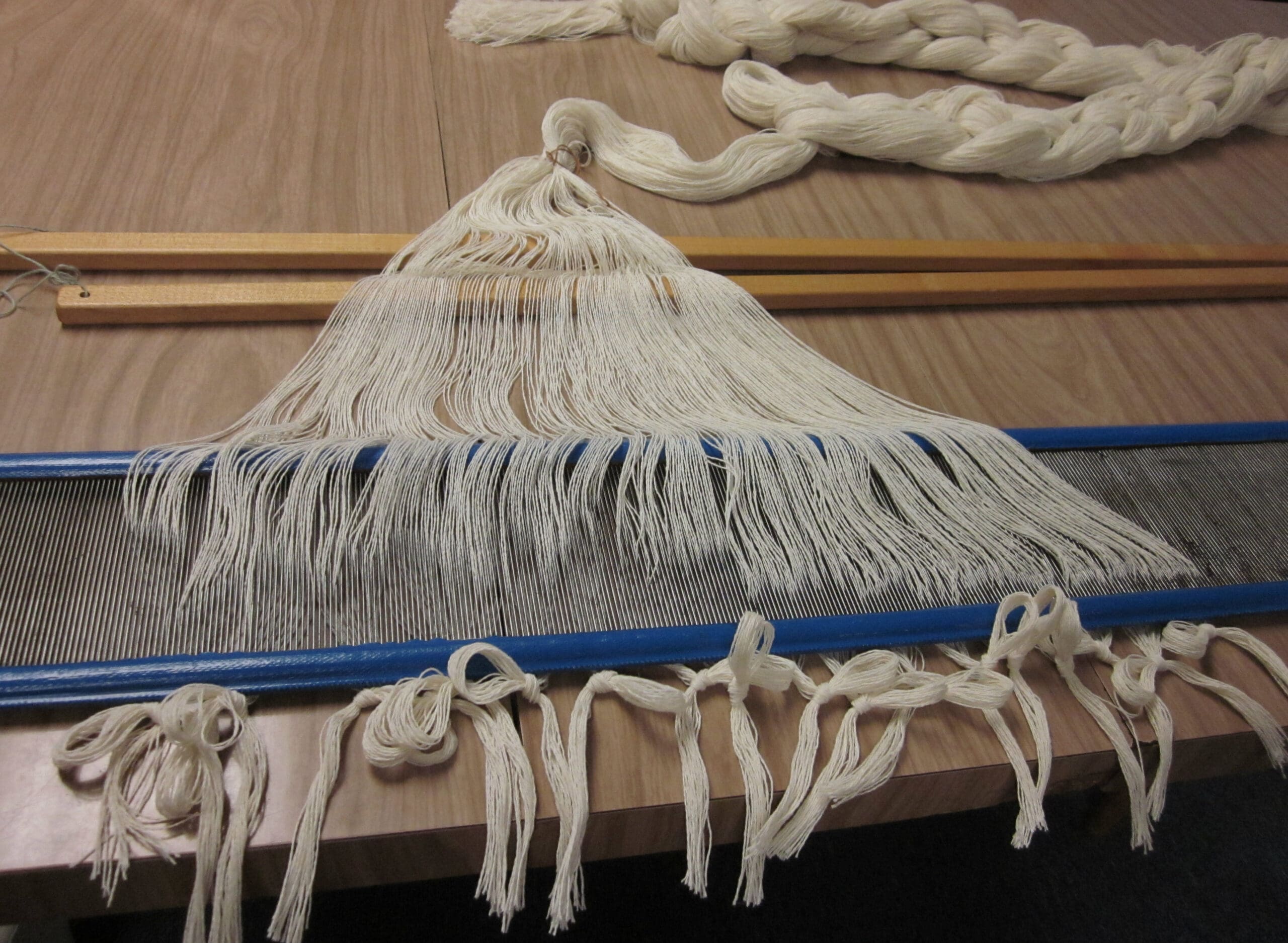 Lease sticks are 2 sticks with holes in the ends. Their purpose is to slide through the cross and keep all the yarns in order. In this case, I have a whole lot of the same color! So, it’s not quite as critical. But, they are still very important when keeping everyone in line! The goal is to avoid unnecessary twists and knots down the road!