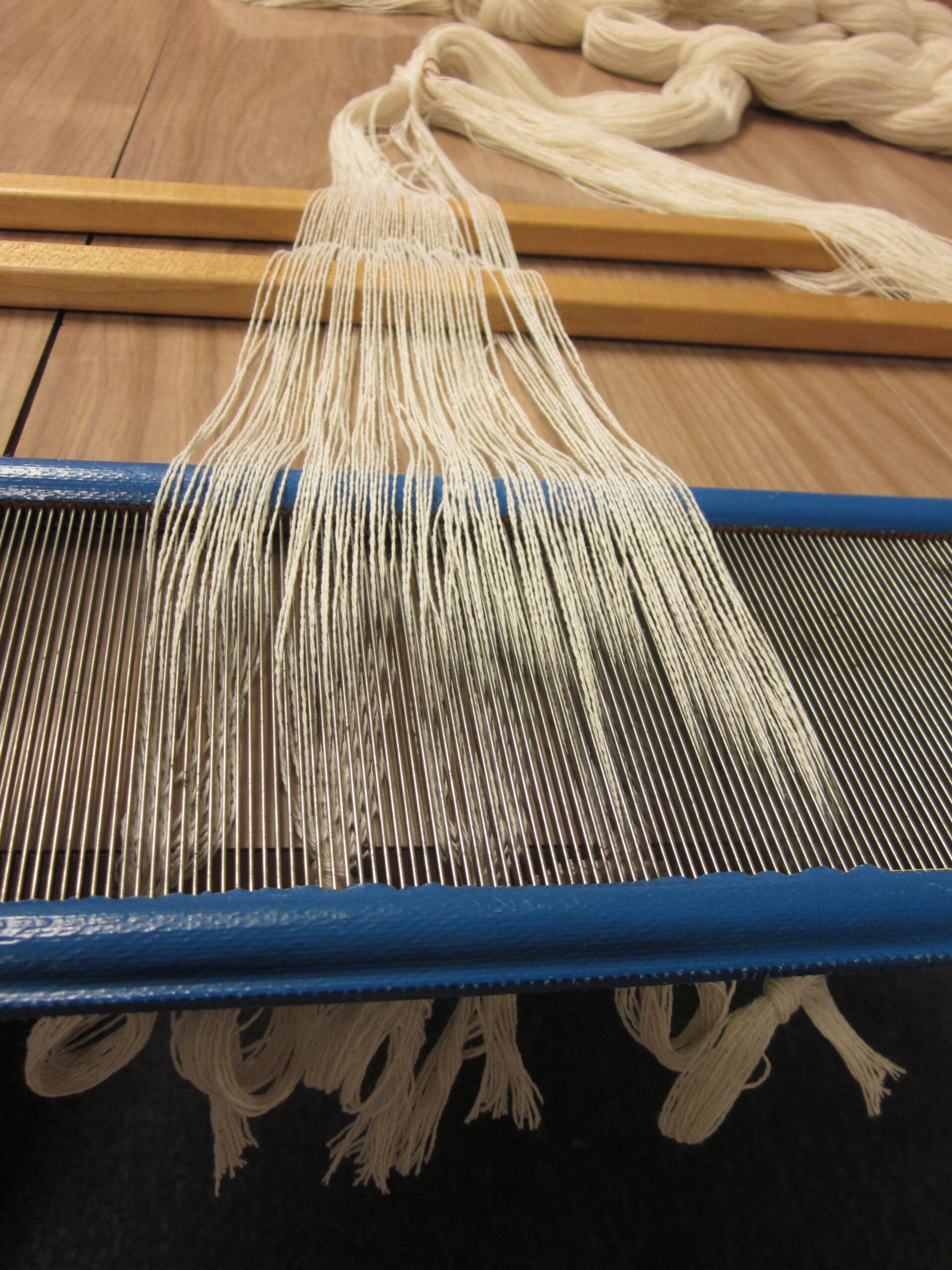 Next up, the yarn goes into the reed! The reed I’m using is a 36″ wide (so it fits in the loom), with 12 dents per inch (12 slots or spaces per inch). Because I have a finer yarn, the yarns share a dent, so I end up with 20 yarns in 1 inch. Project is 18″, thus there is a total of 360 yarns! Math… lots of math!