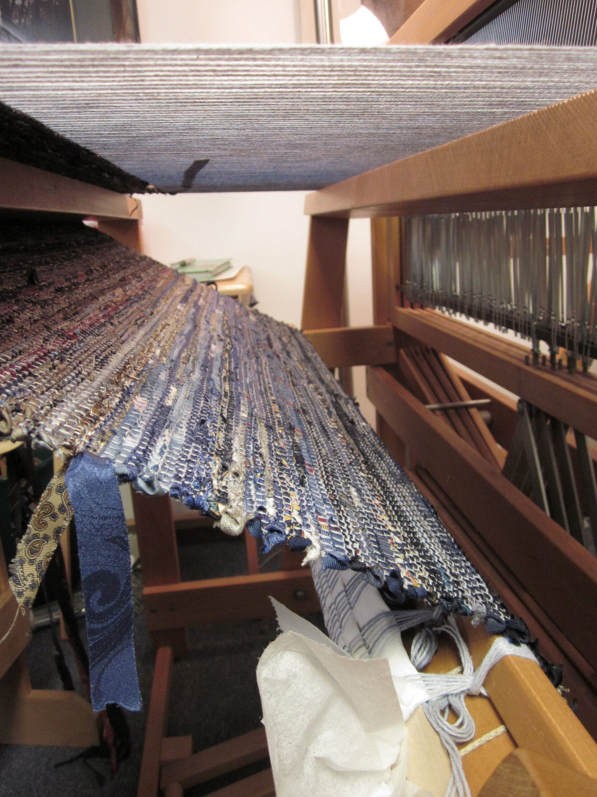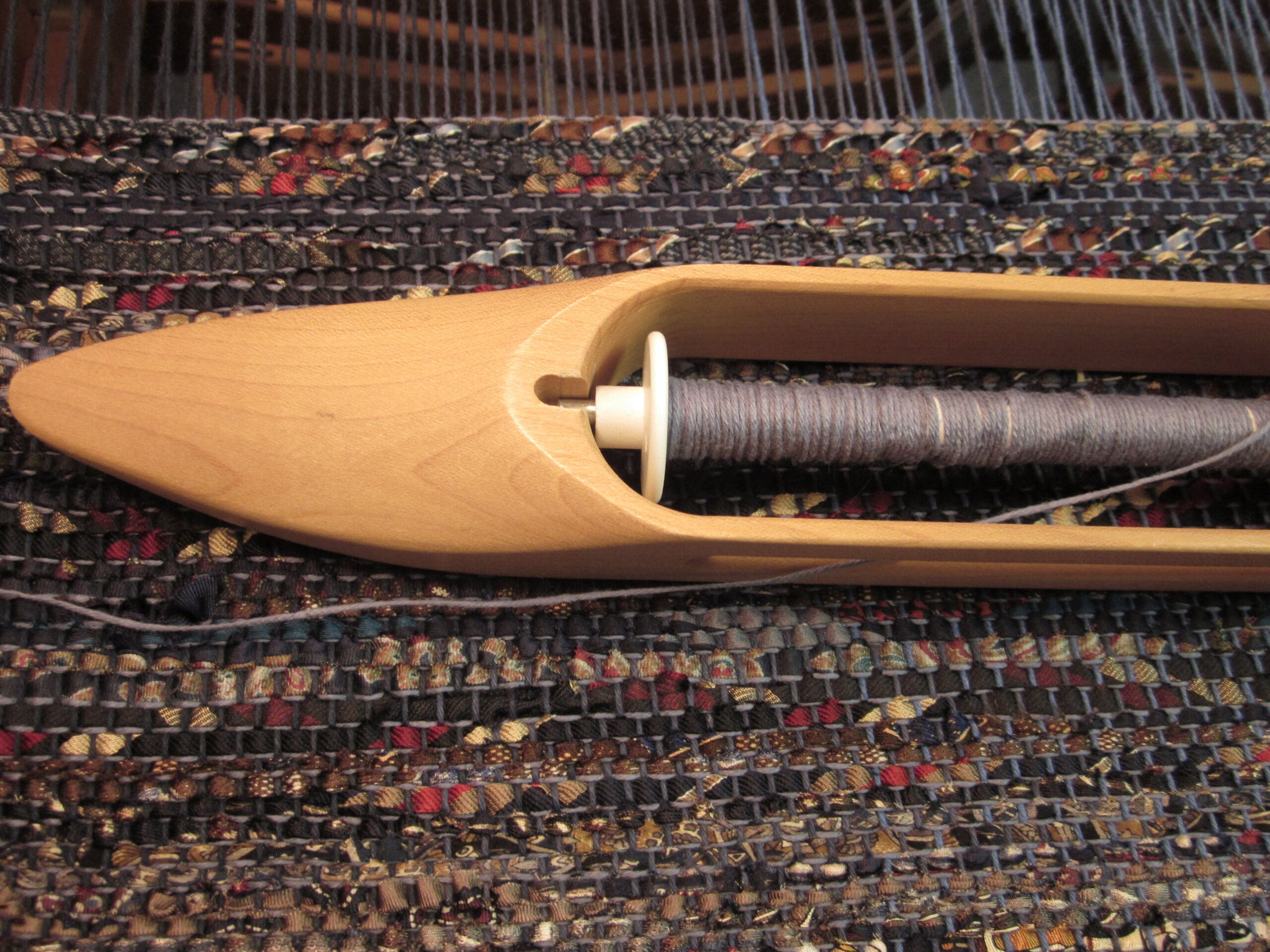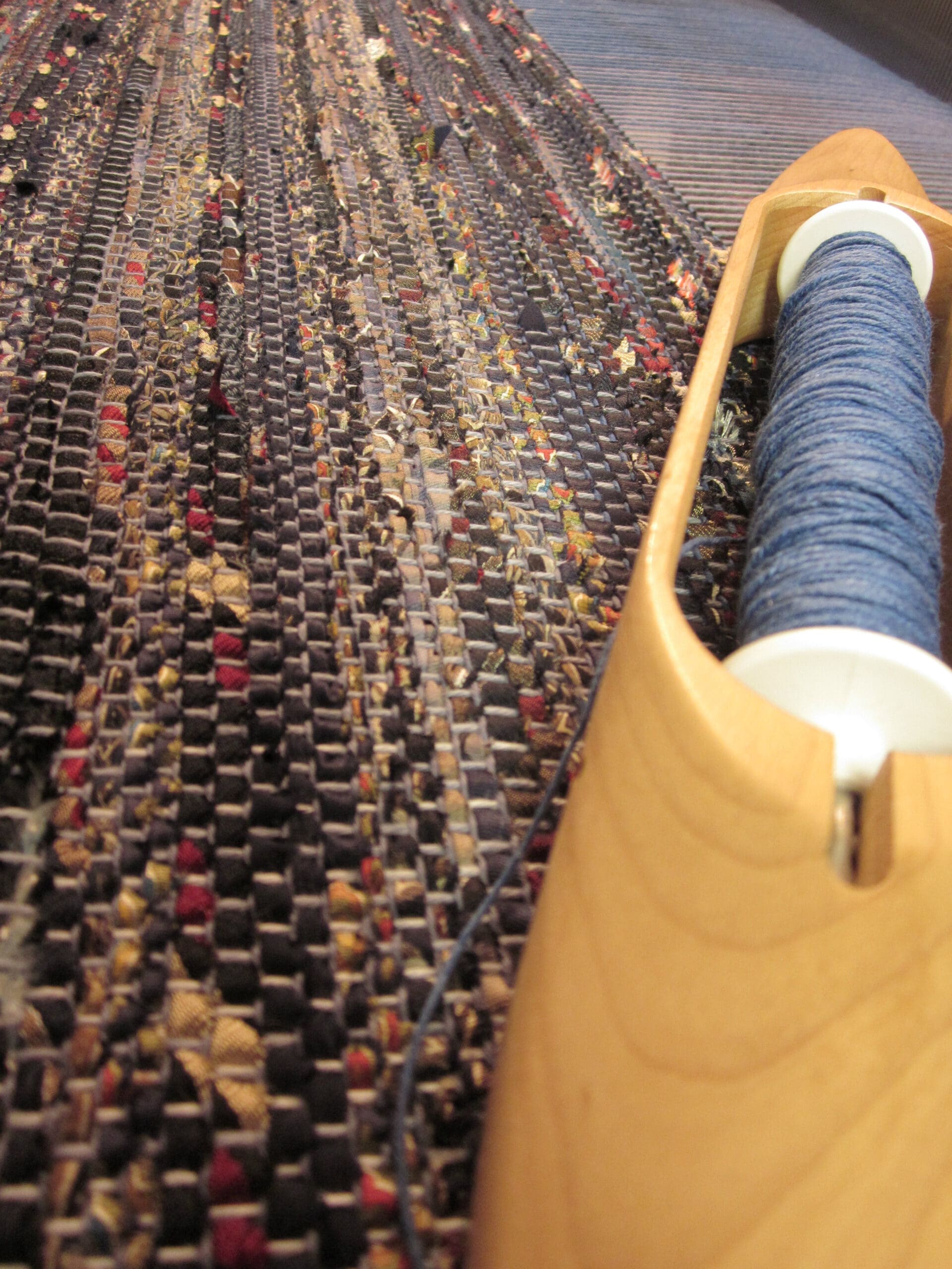 I like to use the big rag shuttle to move the ties across the warp yarns and then, alternate with the cotton yarn in the boat shuttle. So, I typically have 2 shuttles jockeying for position at any given time!