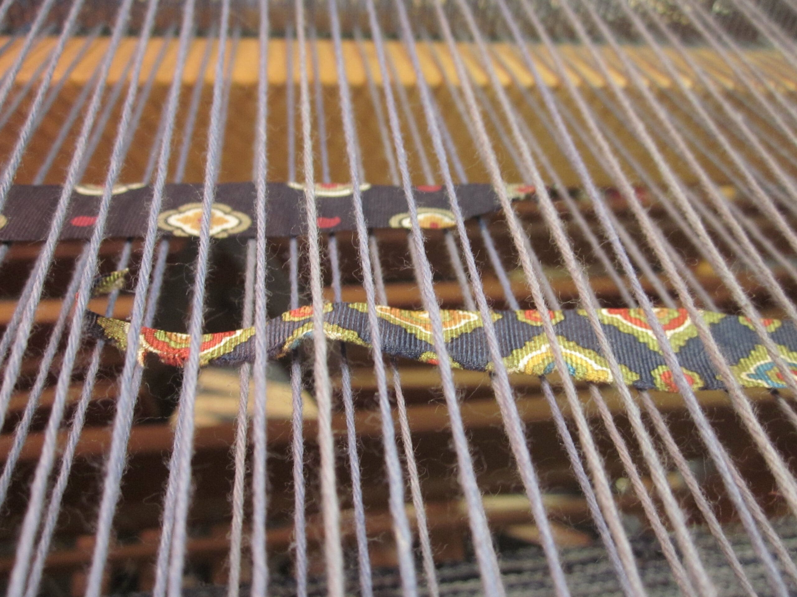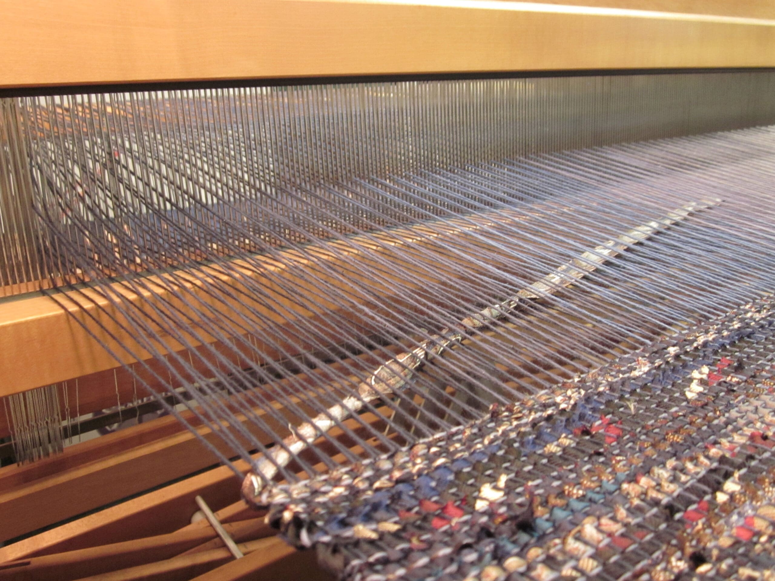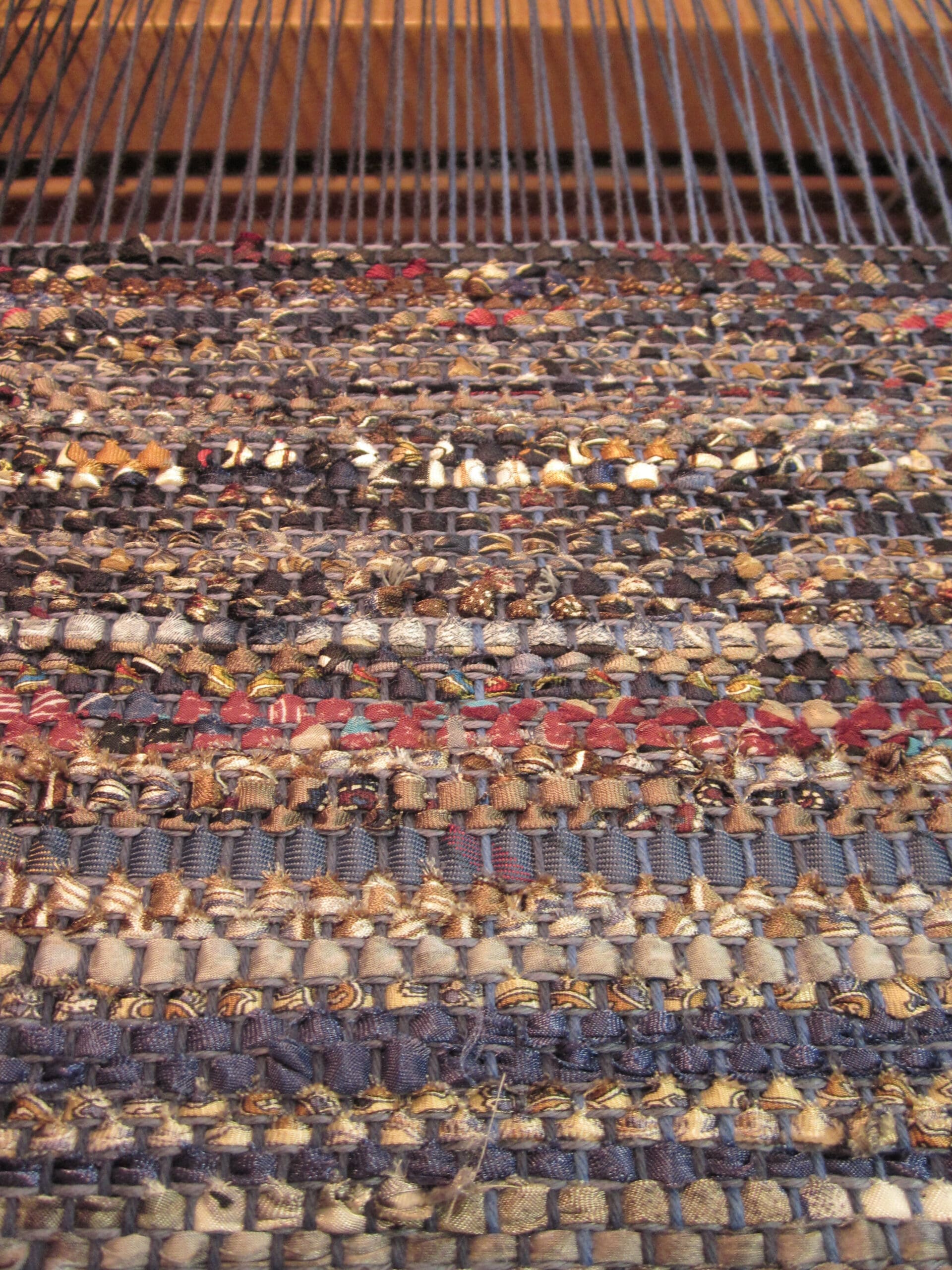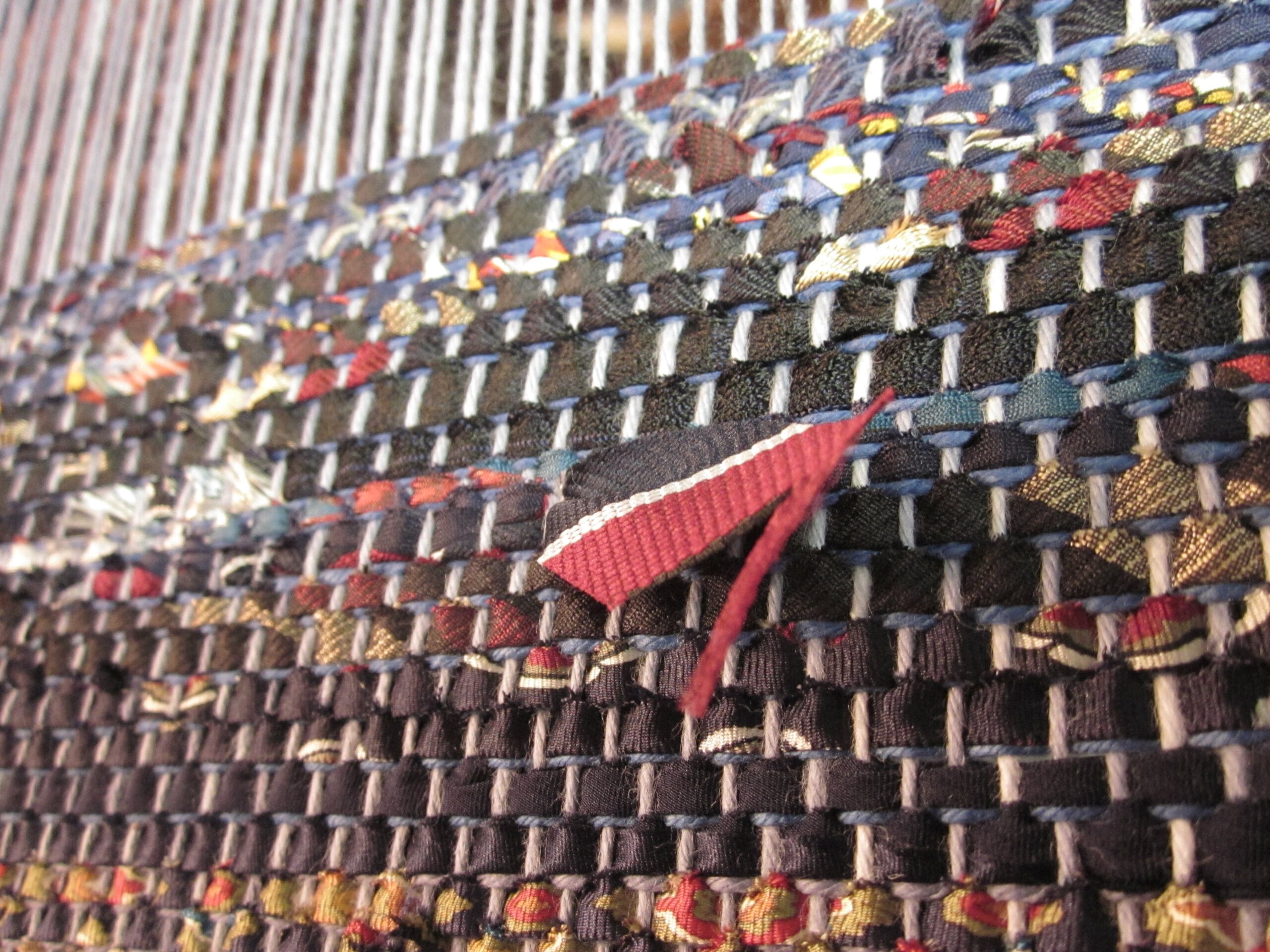 I like to use the big rag shuttle to move the ties across the warp yarns and then, alternate with the cotton yarn in the boat shuttle. So, I typically have 2 shuttles jockeying for position at any given time!