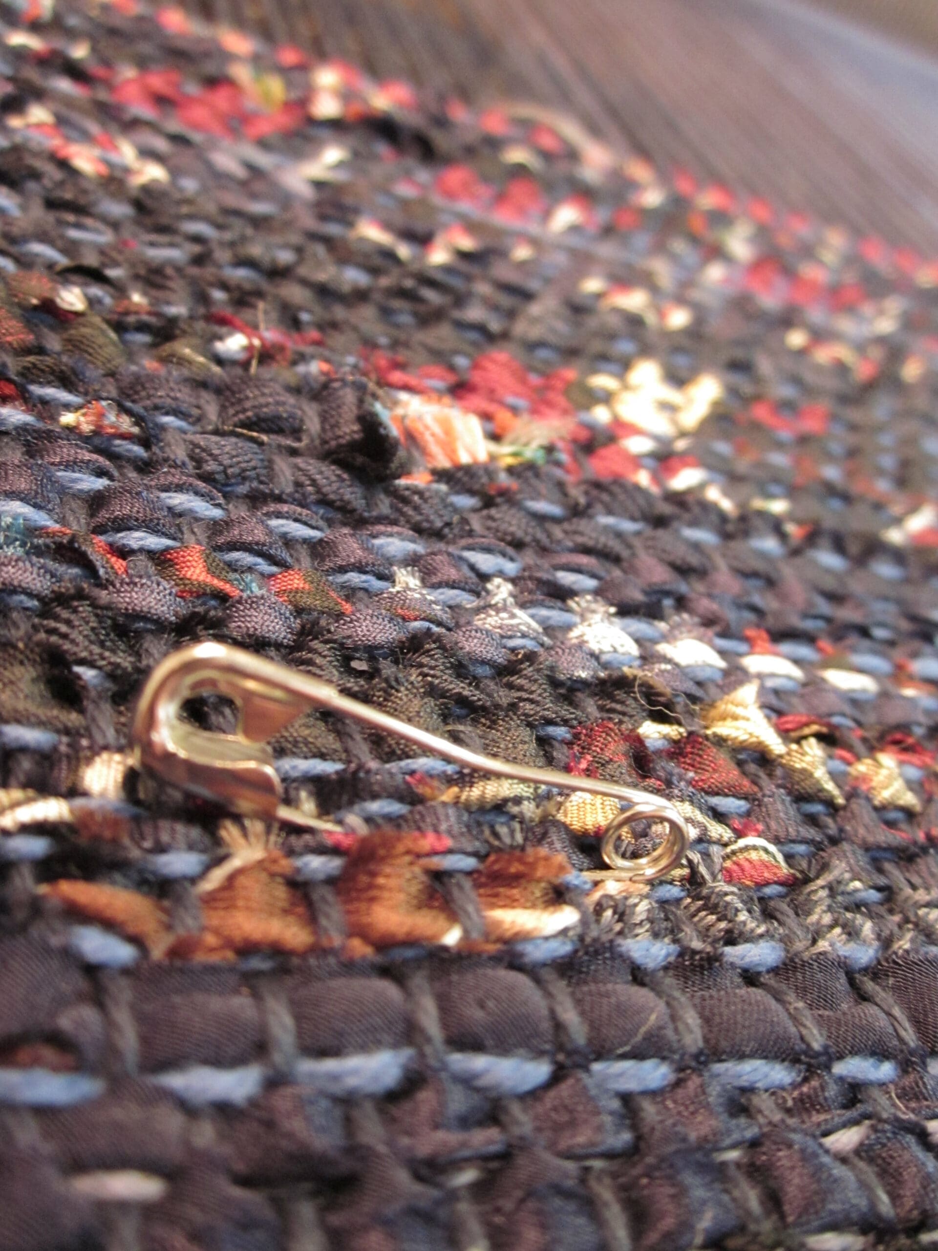 For this project, I have specific sized handbags I am designing for. So, I’m keeping close track of how many inches I’ve woven. Little safety pins are my friends…