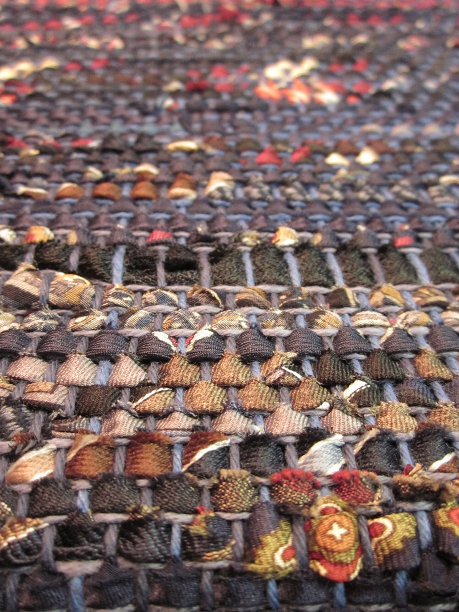 I am using lots and lots of cut up neckties instead of just yarn. I love the reuse, reduce, recycle idea! (Sadly, I’m not as vigilant in all aspects of my life. But, this is my little contribution!) What I’ve discovered is the world doesn’t really wear neckties anymore. Translation – lots of inexpensive materials for me to choose from!