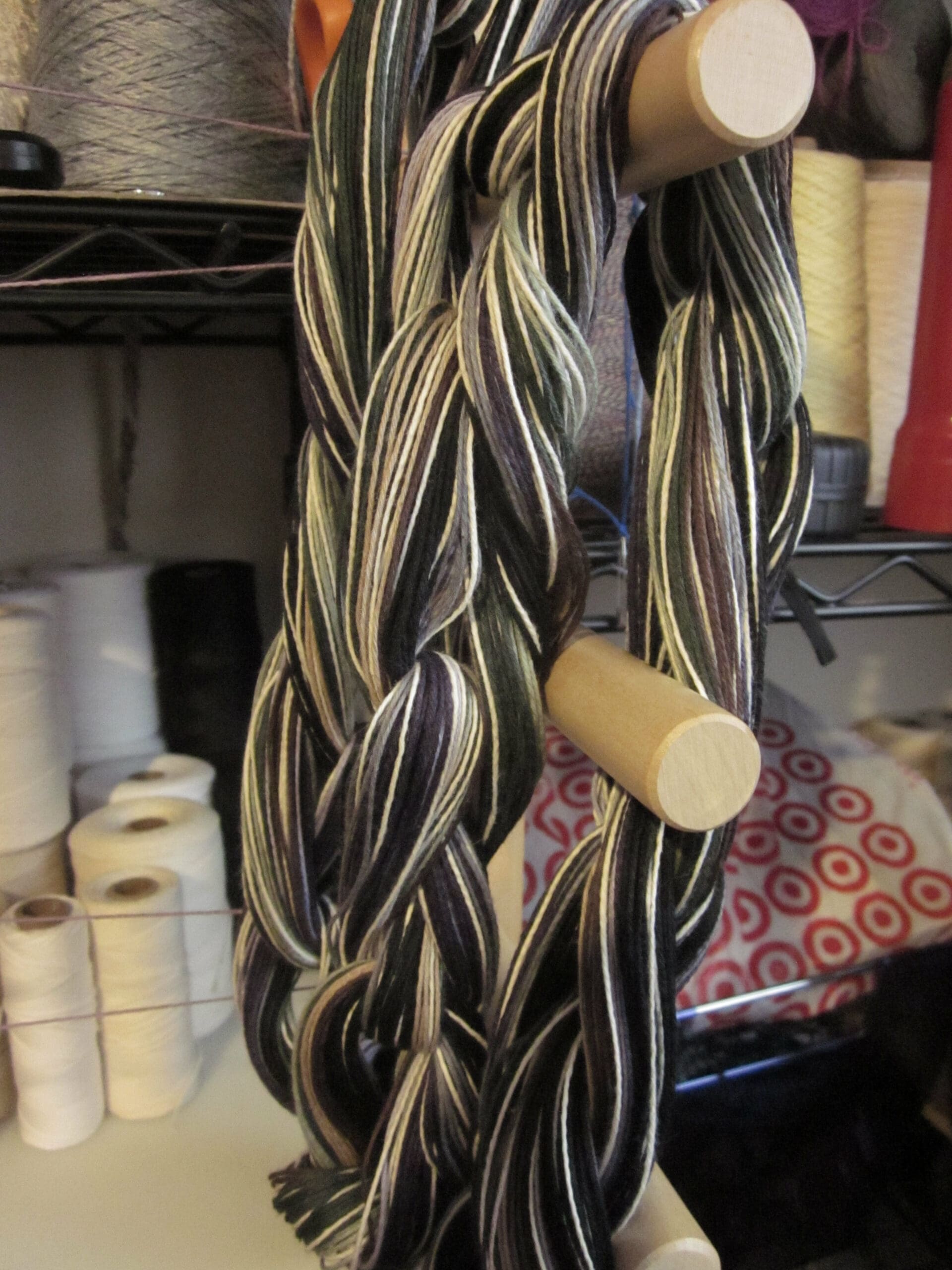 Before I slip each group of yarns off the warping board, I use choke ties at the cross to guarantee I can keep everything in order later! (The knot on the top of the yarn is the choke tie!) The “cross” is the configuration between 2 pegs where the yarns are positioned in order. Sounds vague, I know, but since my photos here don’t do it justice, you’ll have to trust me on this one!