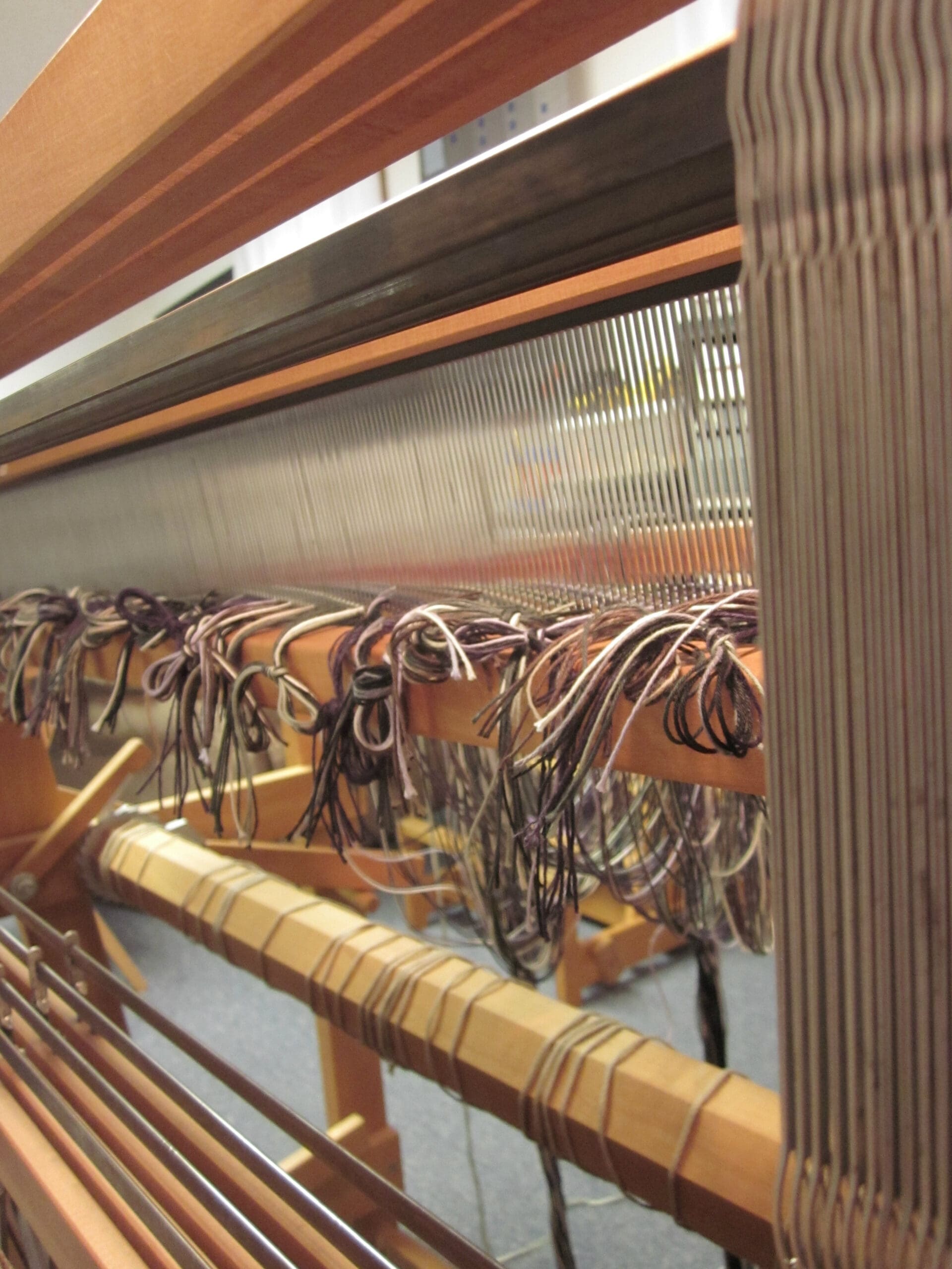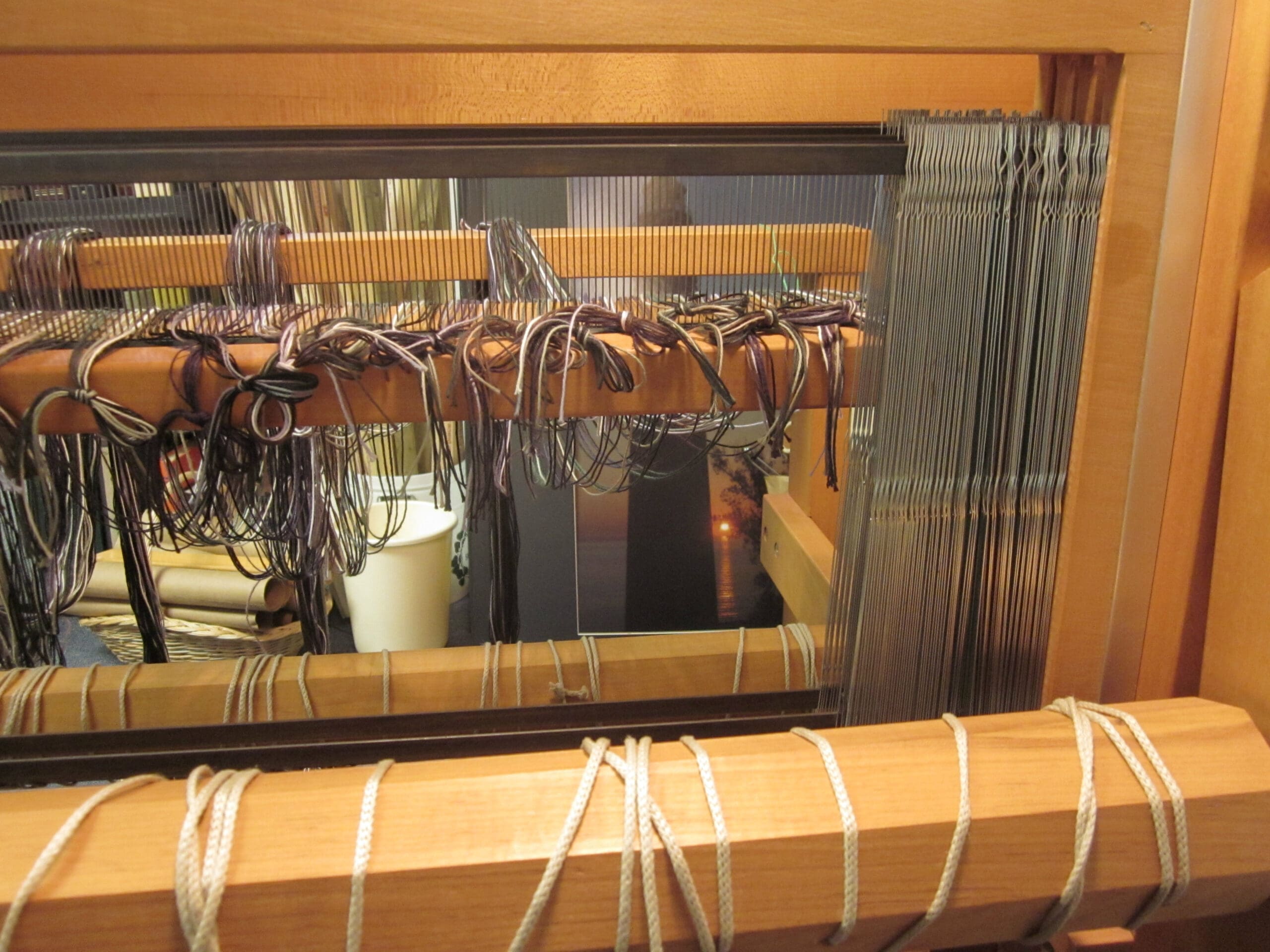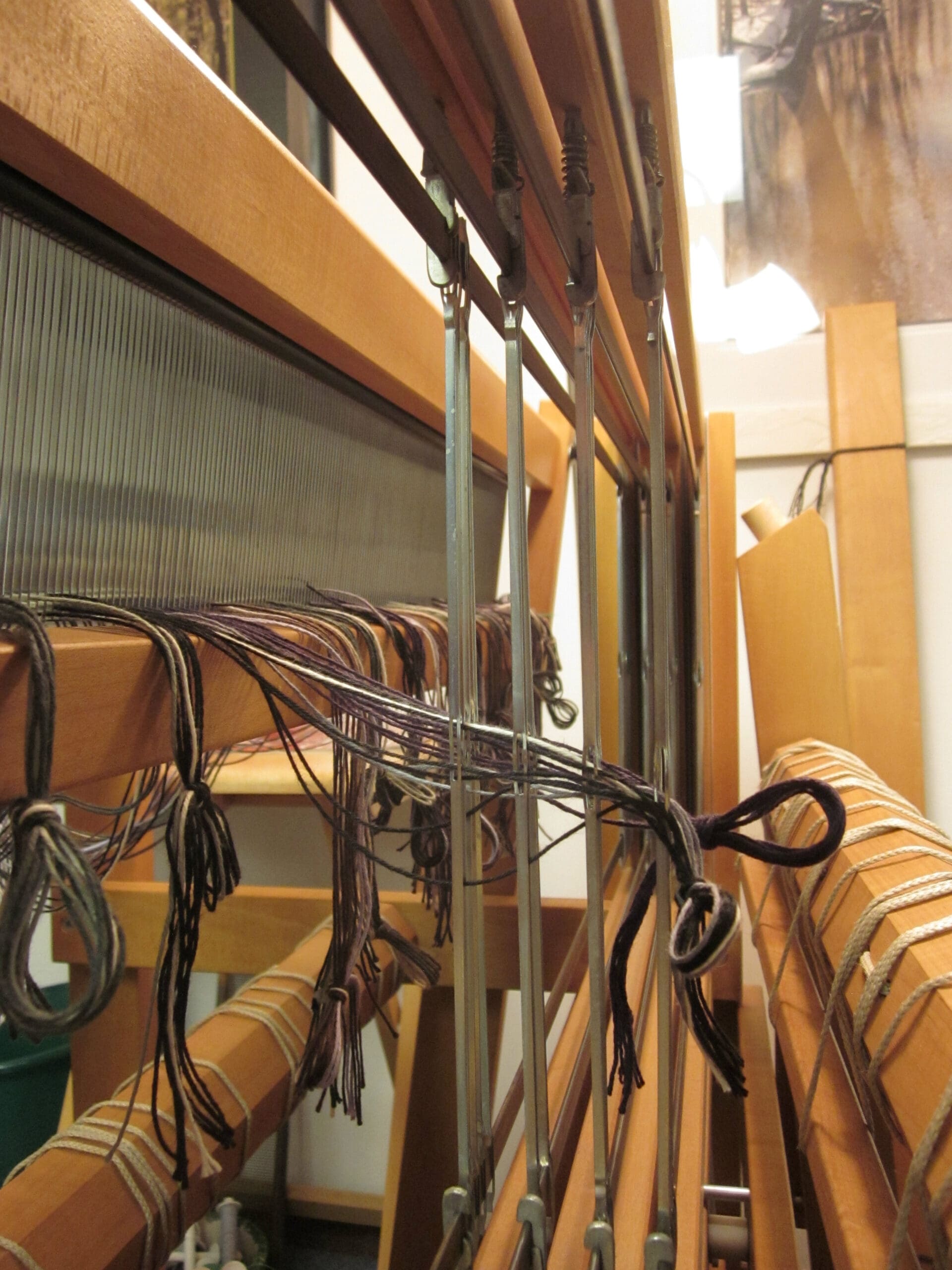 So, imagine if you will, I’m carrying the reed with all the yarns over the loom – trying not to step on the dangling bits. (The journey is all of 10 feet!) Once I get there, the goal is to lay the reed into the beater bar without pinching any yarns in the process. It’s a funny little dance, but always satisfying to see it come together!
