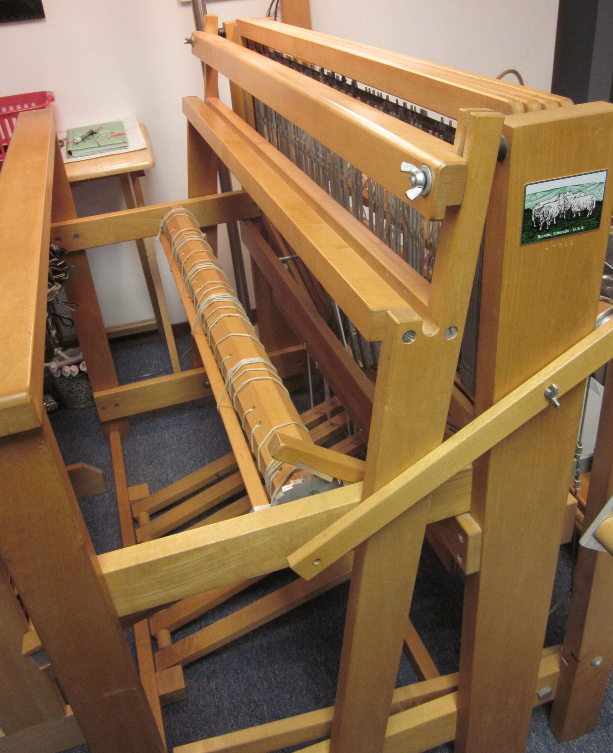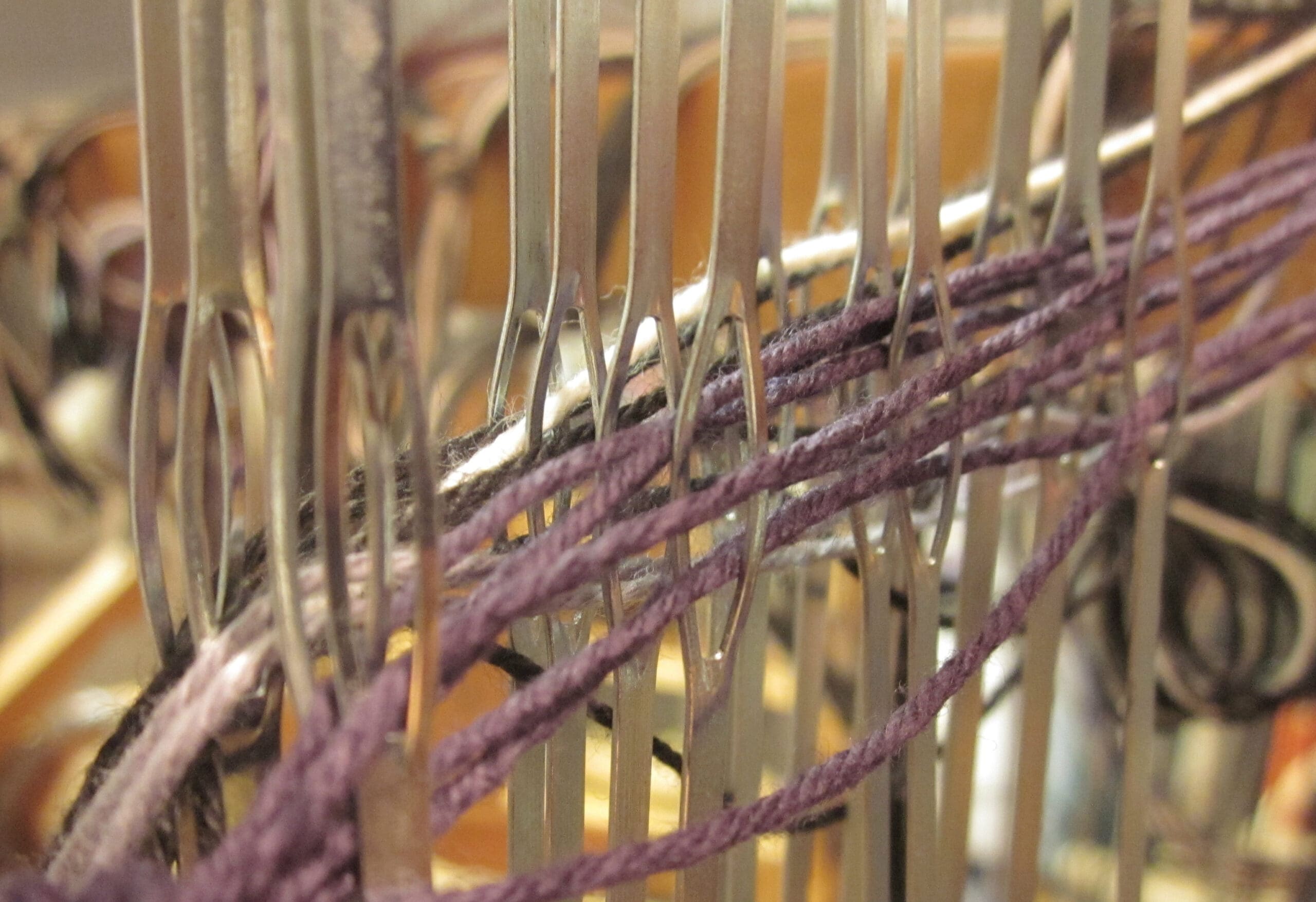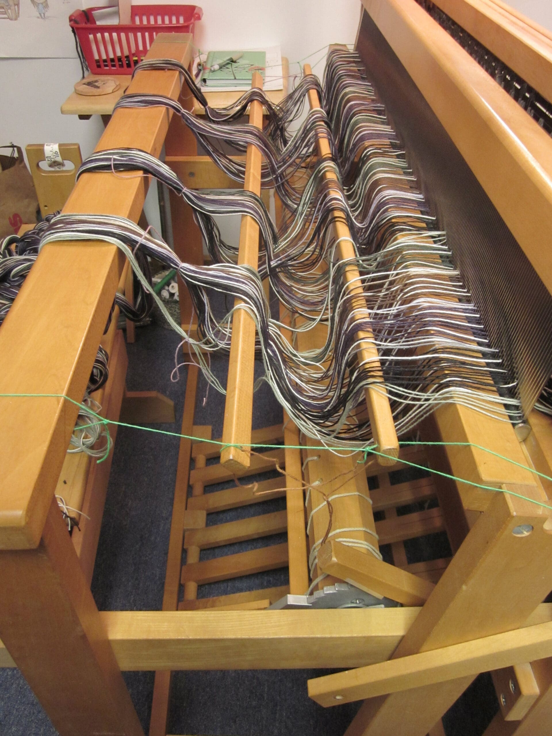 So, imagine if you will, I’m carrying the reed with all the yarns over the loom – trying not to step on the dangling bits. (The journey is all of 10 feet!) Once I get there, the goal is to lay the reed into the beater bar without pinching any yarns in the process. It’s a funny little dance, but always satisfying to see it come together!