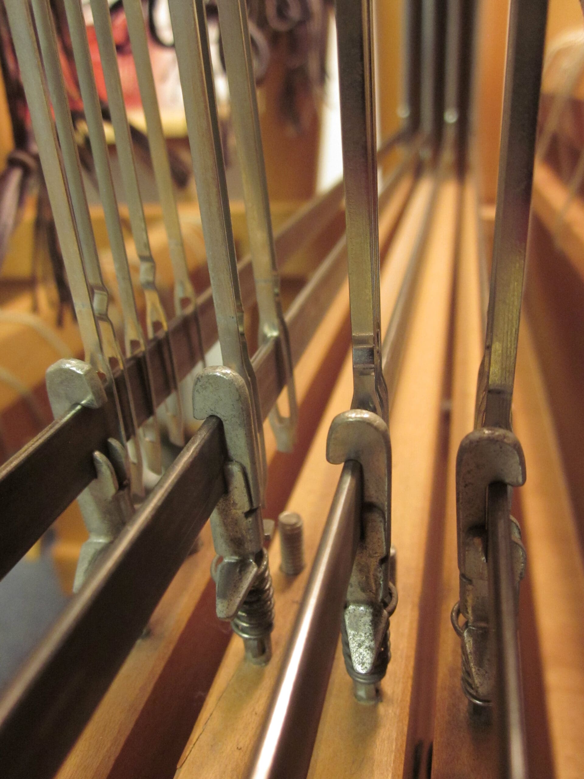Heddles are thin, metal pieces with an eye in the middle of each. Each yarn will get its own heddle.