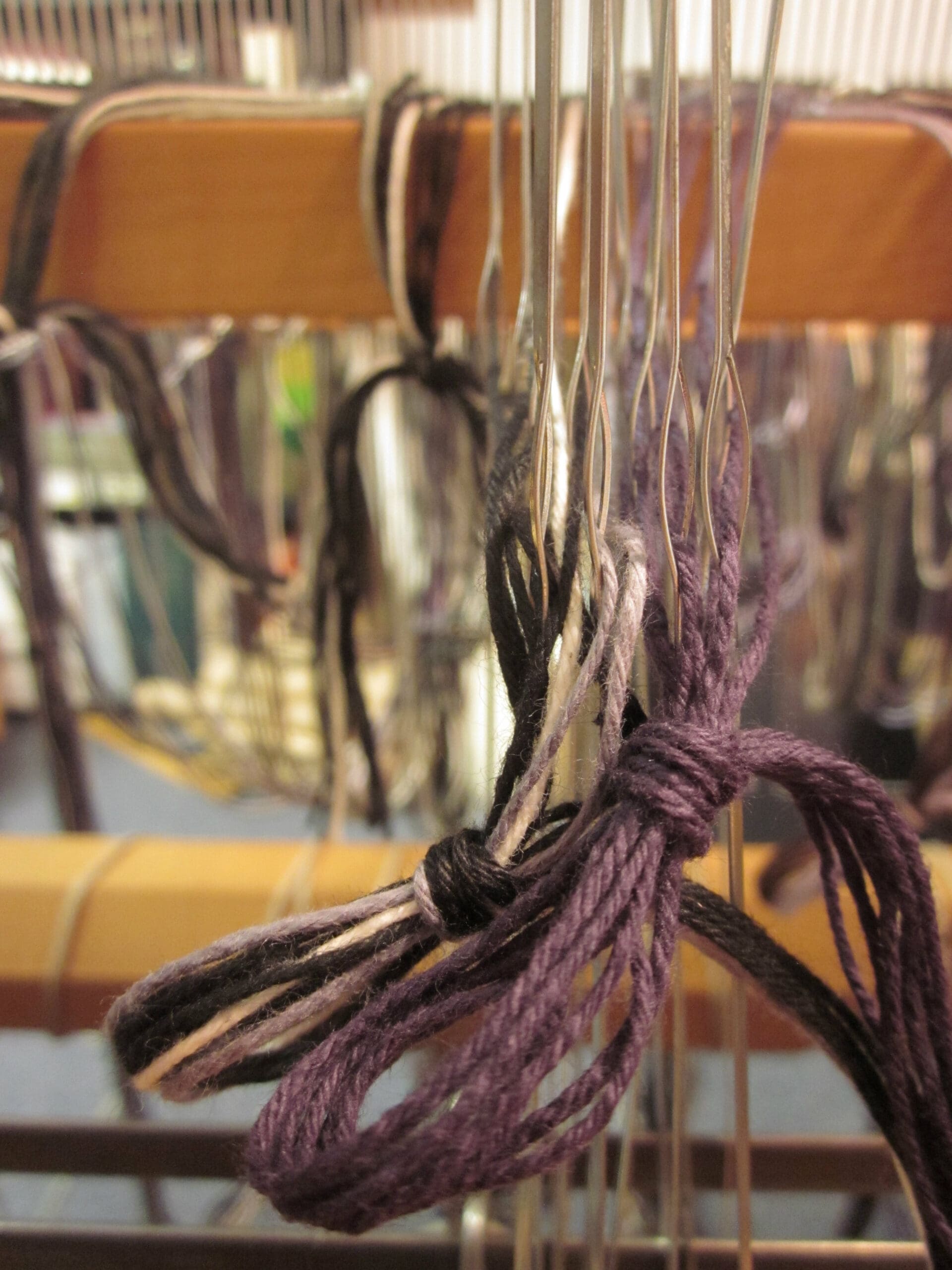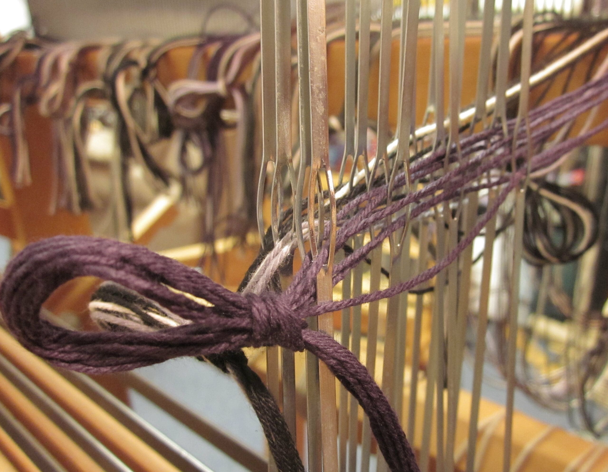 For this project, I am doing a simple threading, 1-2-3-4-1-2, etc. Easy enough! I typically like to start in the middle and work my way out. And as a way to double check my numbers, I knot the yarn every inch just like when I sleyed the reed. Again, could be overkill, but it helps me sleep at night…