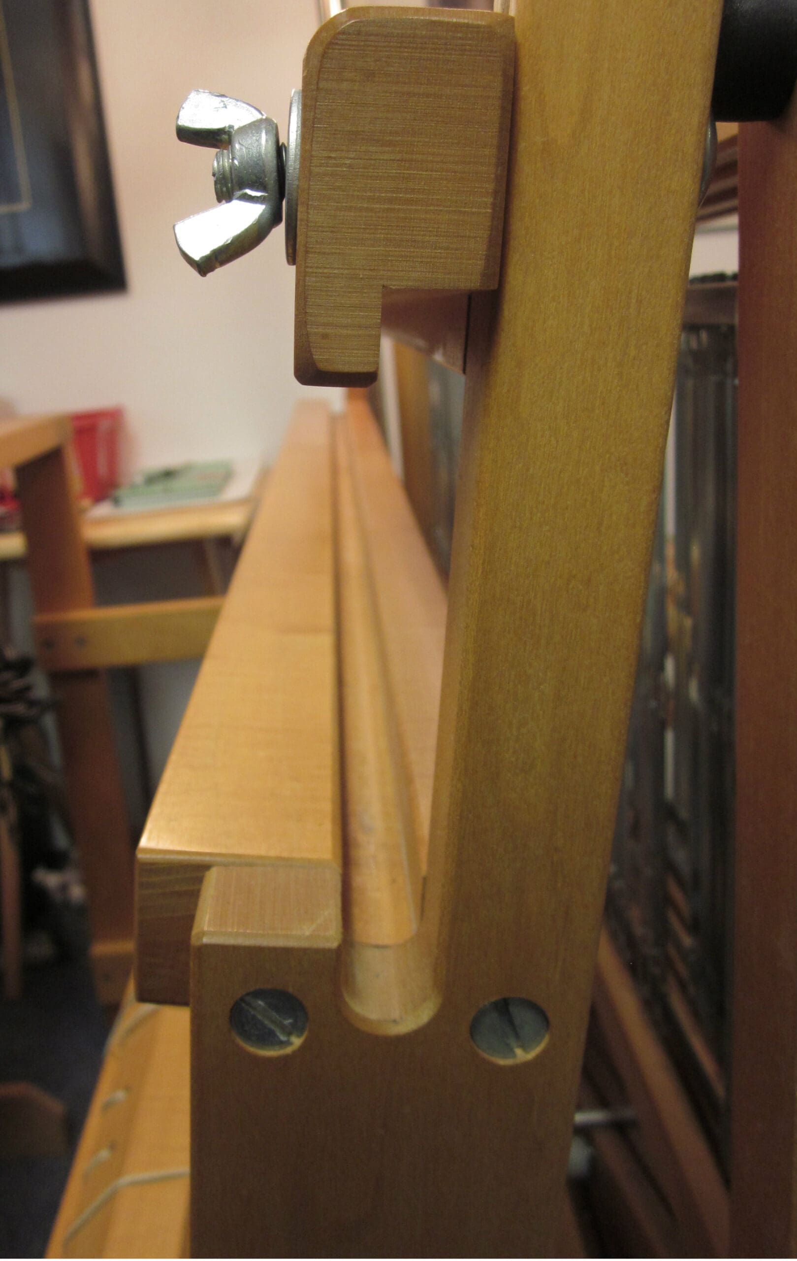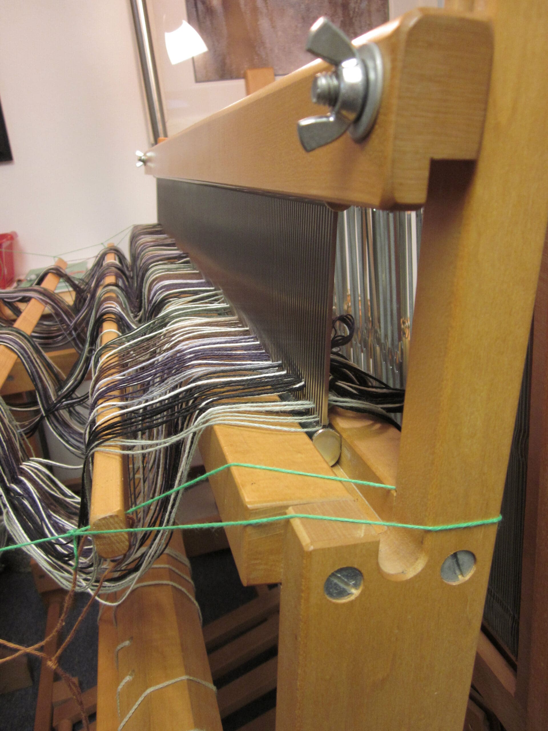 Once the reed is in, I do a little tying to secure the moving parts. I’ll take some scrap yarn (the electric green yarn) and tie the lease sticks to the reed and the front beam so the various elements don’t wiggle too much while I’m threading the heddles. I’m all about removing as much frustration from the process as possible! A happy weaver is always the goal…