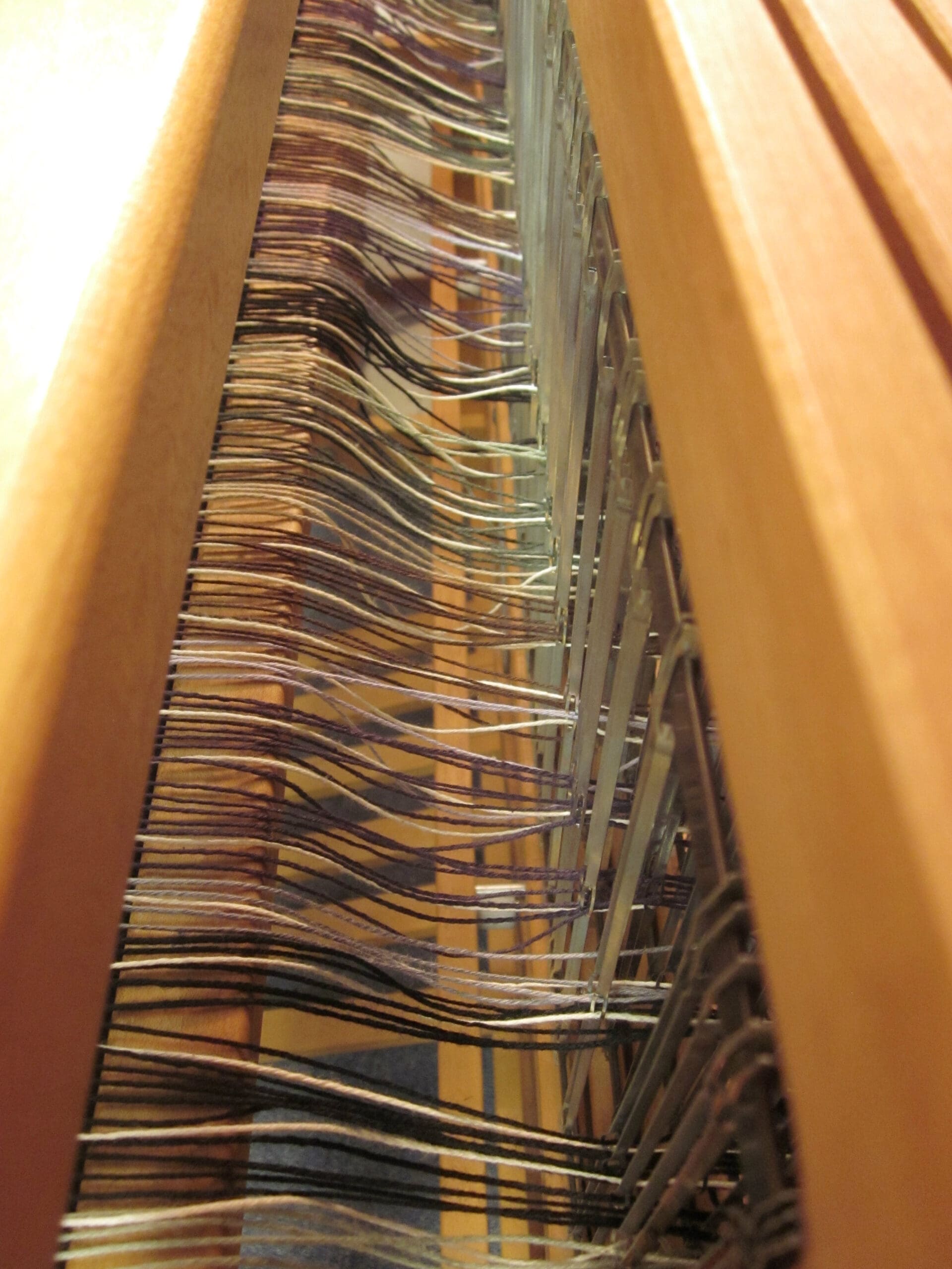 My loom is a 4-shaft loom, meaning I have 4 frames that lift and lower – controlled by the pedals at the base. Each shaft holds a whole bunch of heddles, who in turn hold each of the yarns.