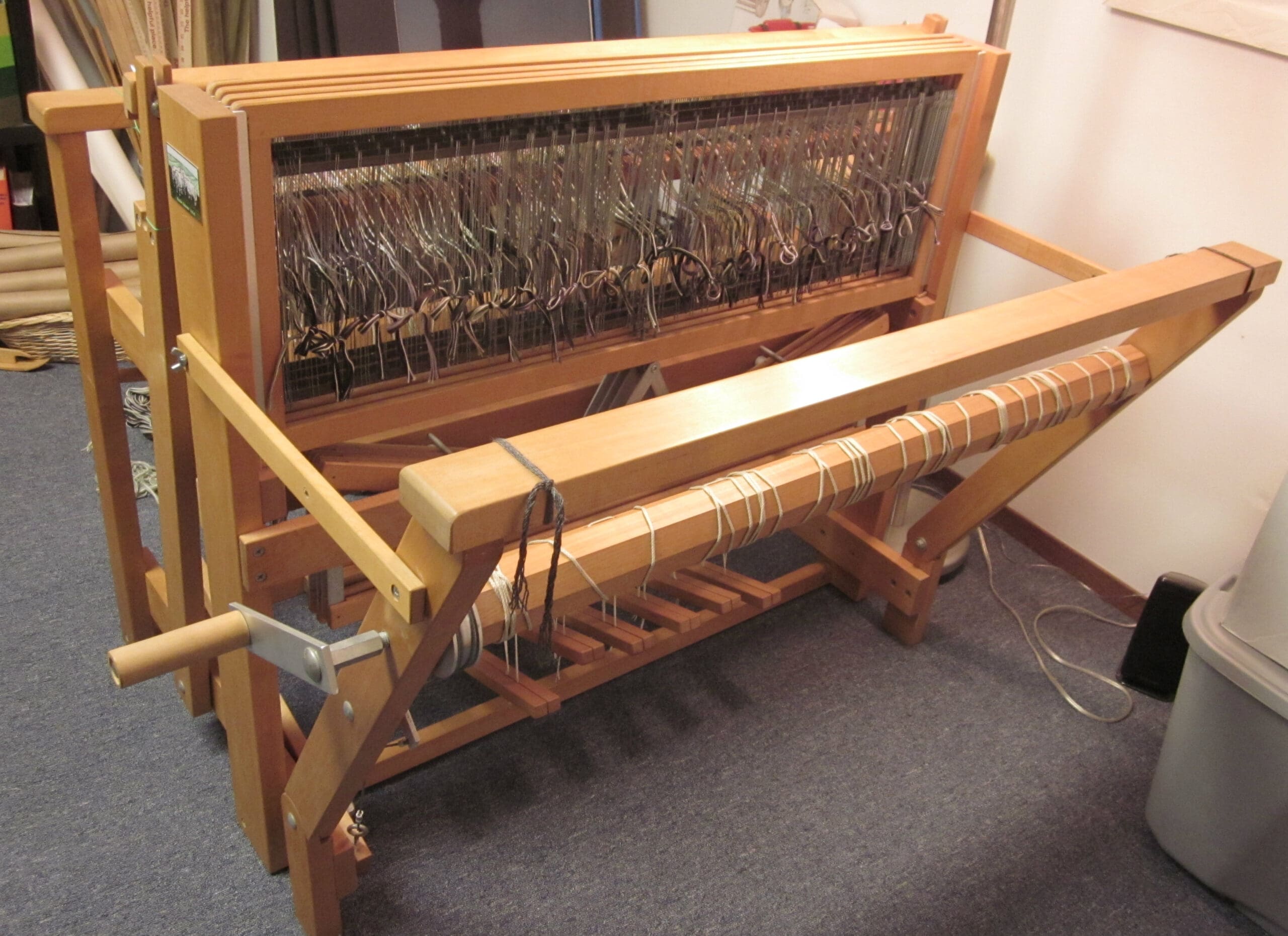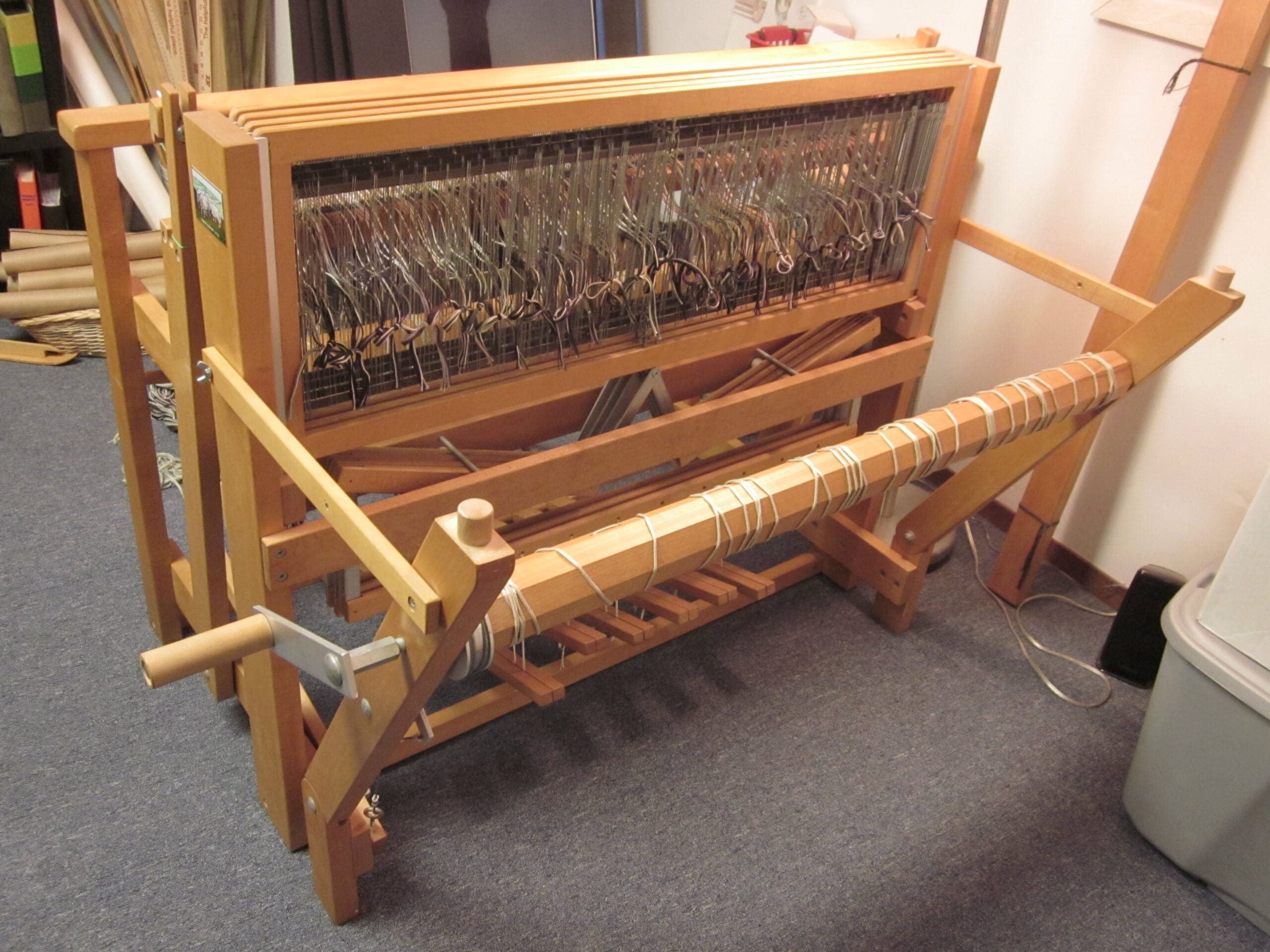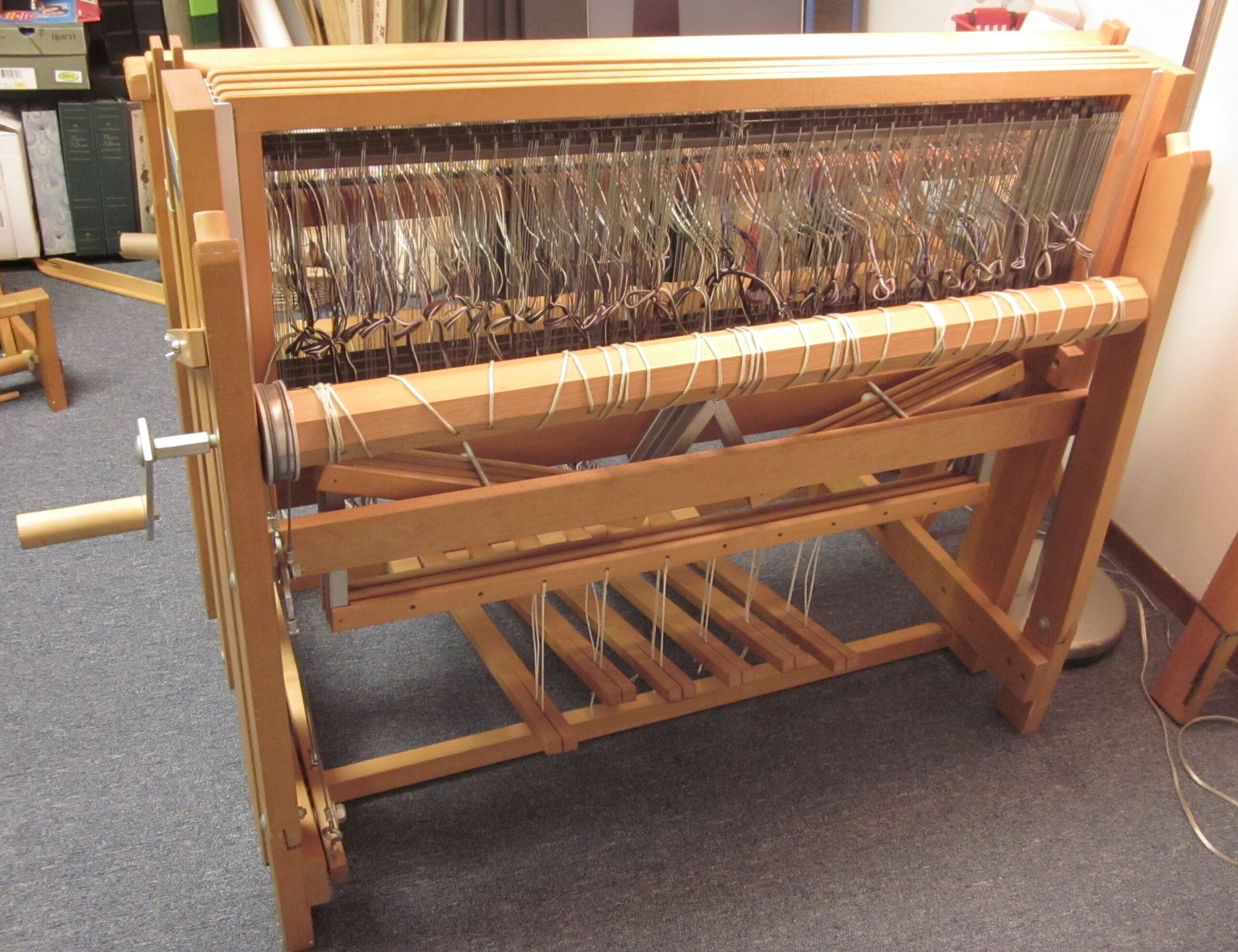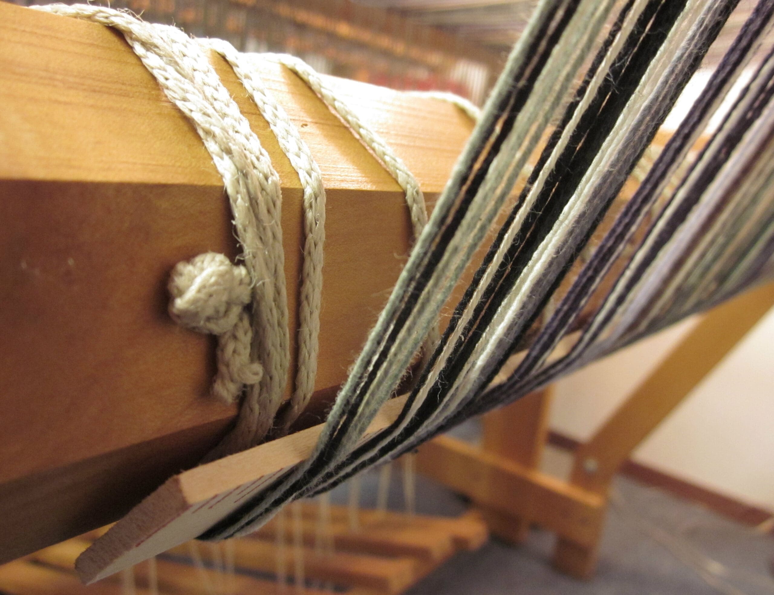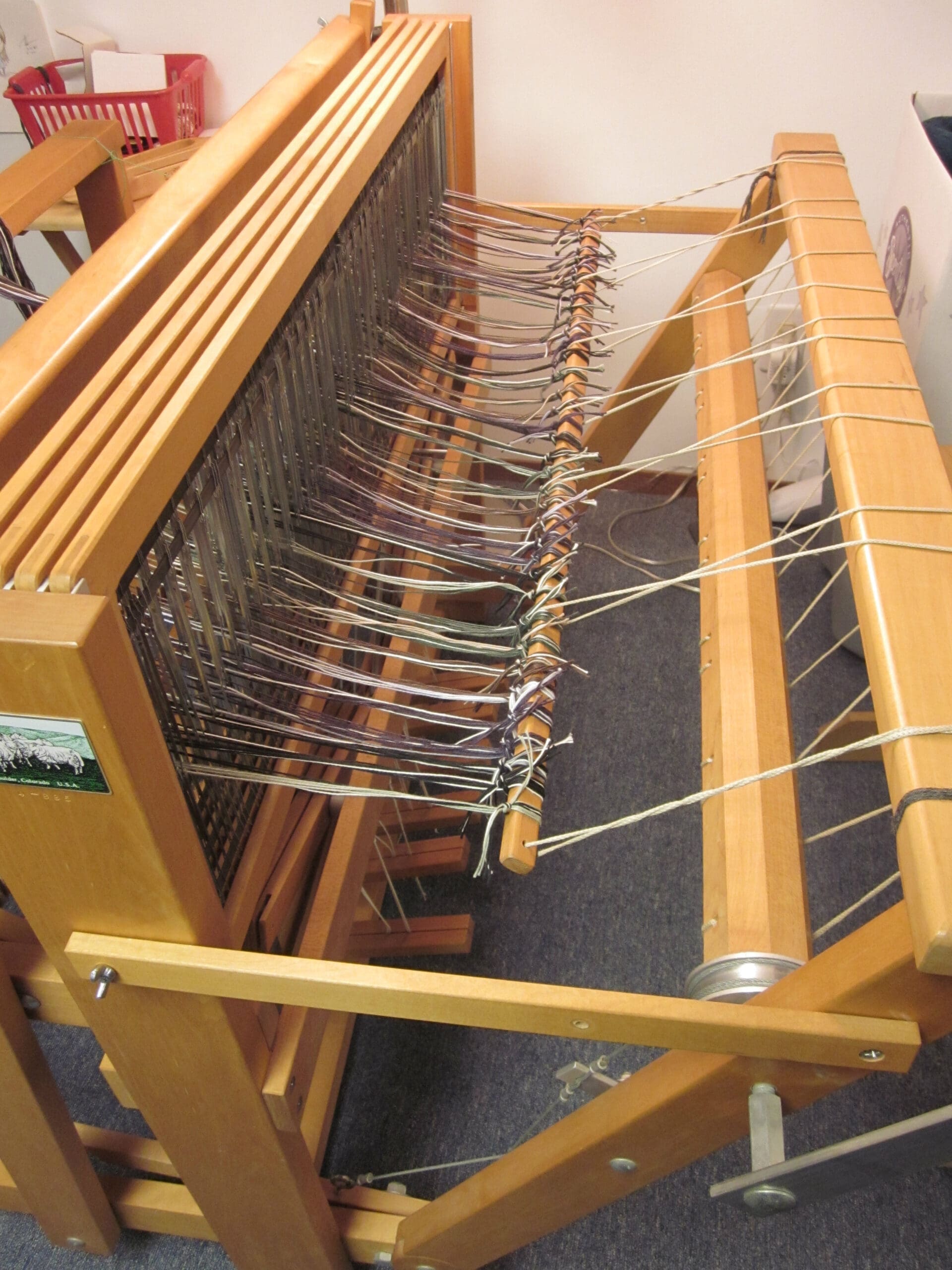 Little by little, the yarn moves from the front, through the heddles, and around the back beam.