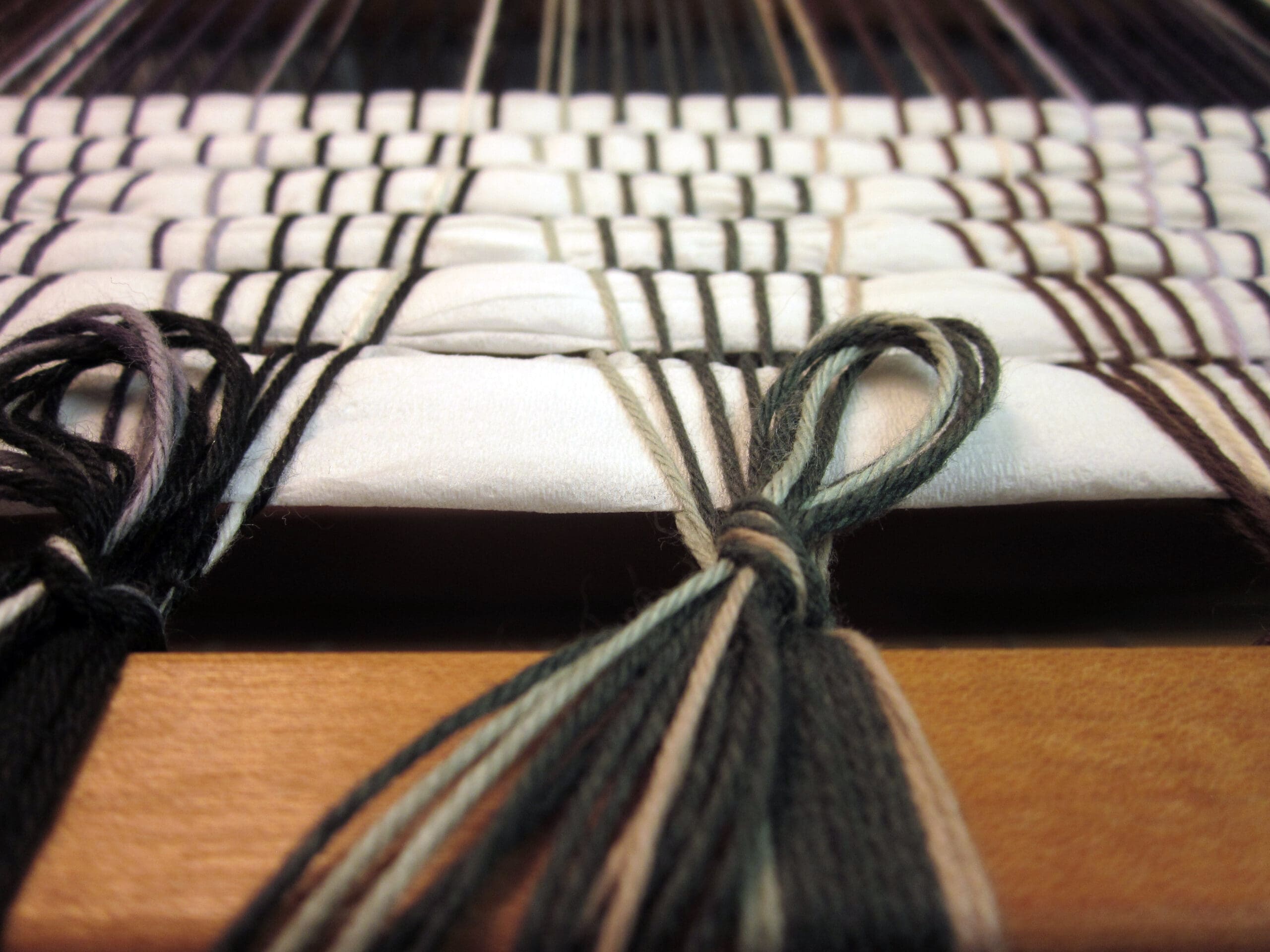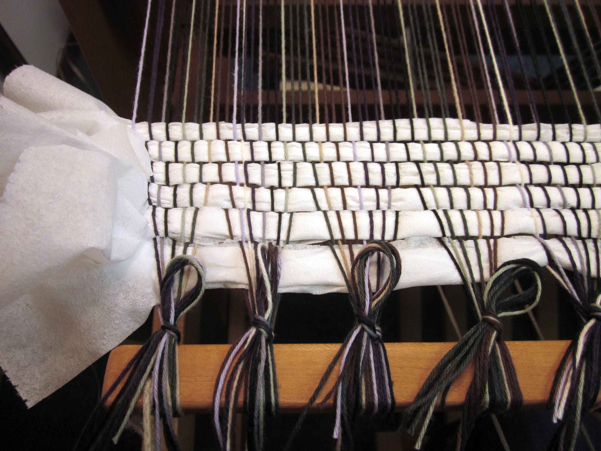 I like to use toilet paper to start the project. It’s a cheap resource, it’s perforated (easy to remove later), and it’s bulky enough to fill in the space between the yarns quickly! Recently, my family mistakenly bought really cheap toilet paper – the see-through kind. Funny how it all ended up in a bag by my loom! It’ll get used eventually, I’m sure!