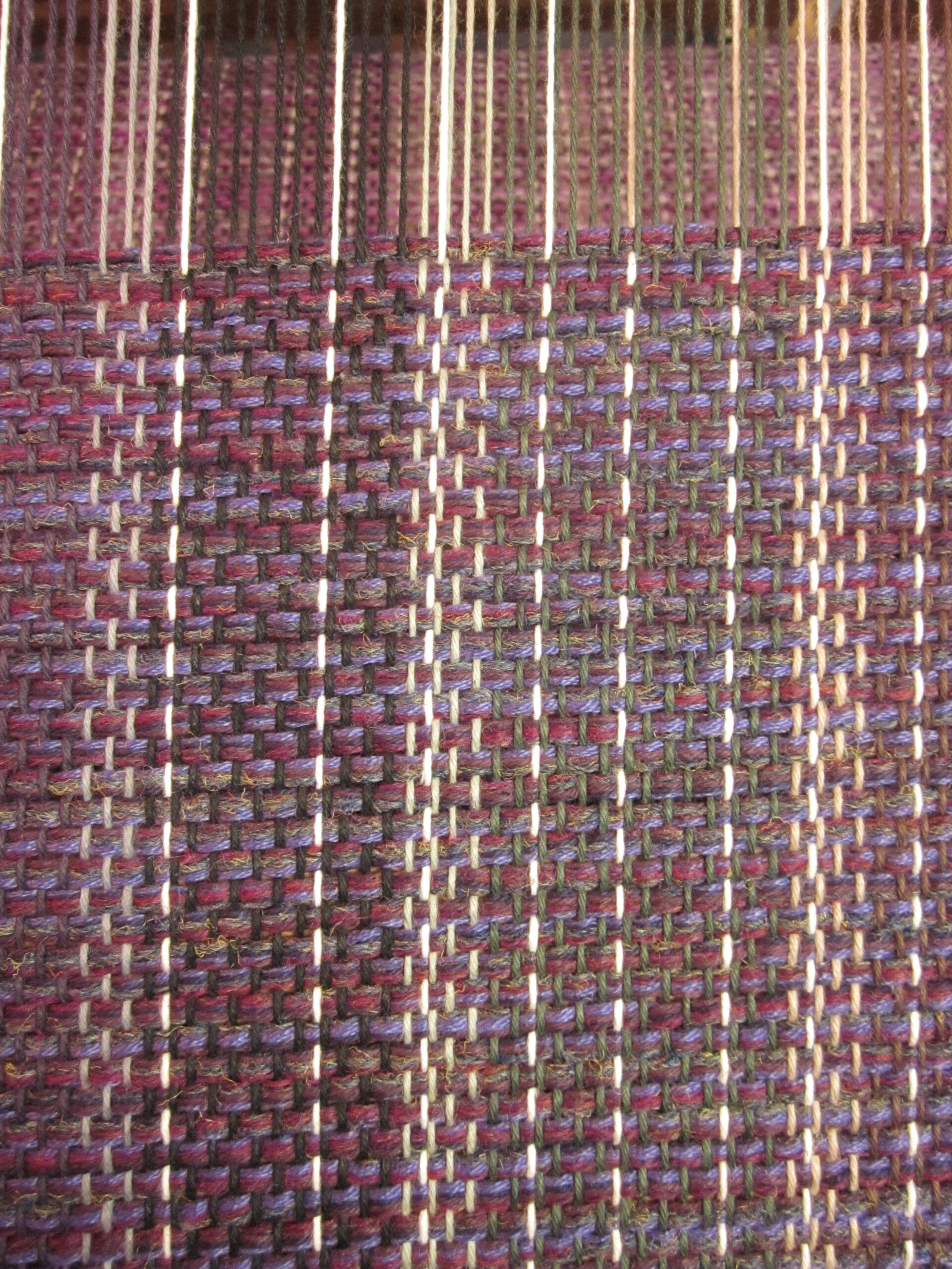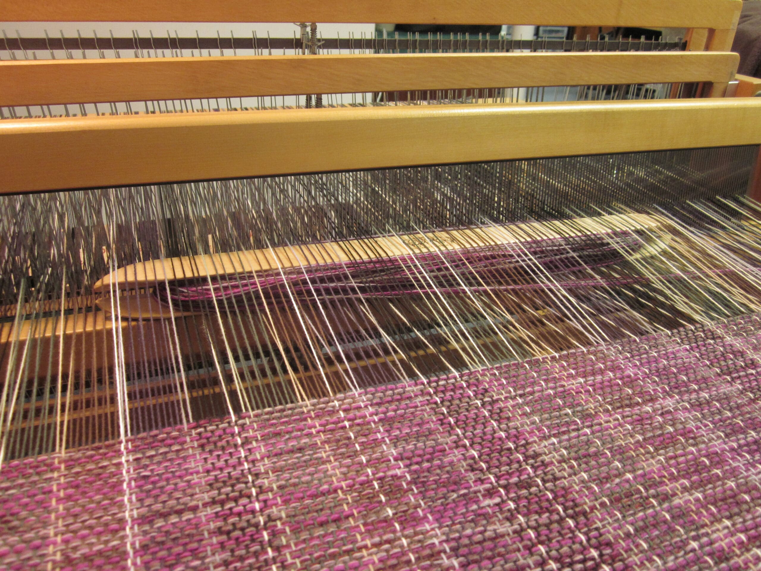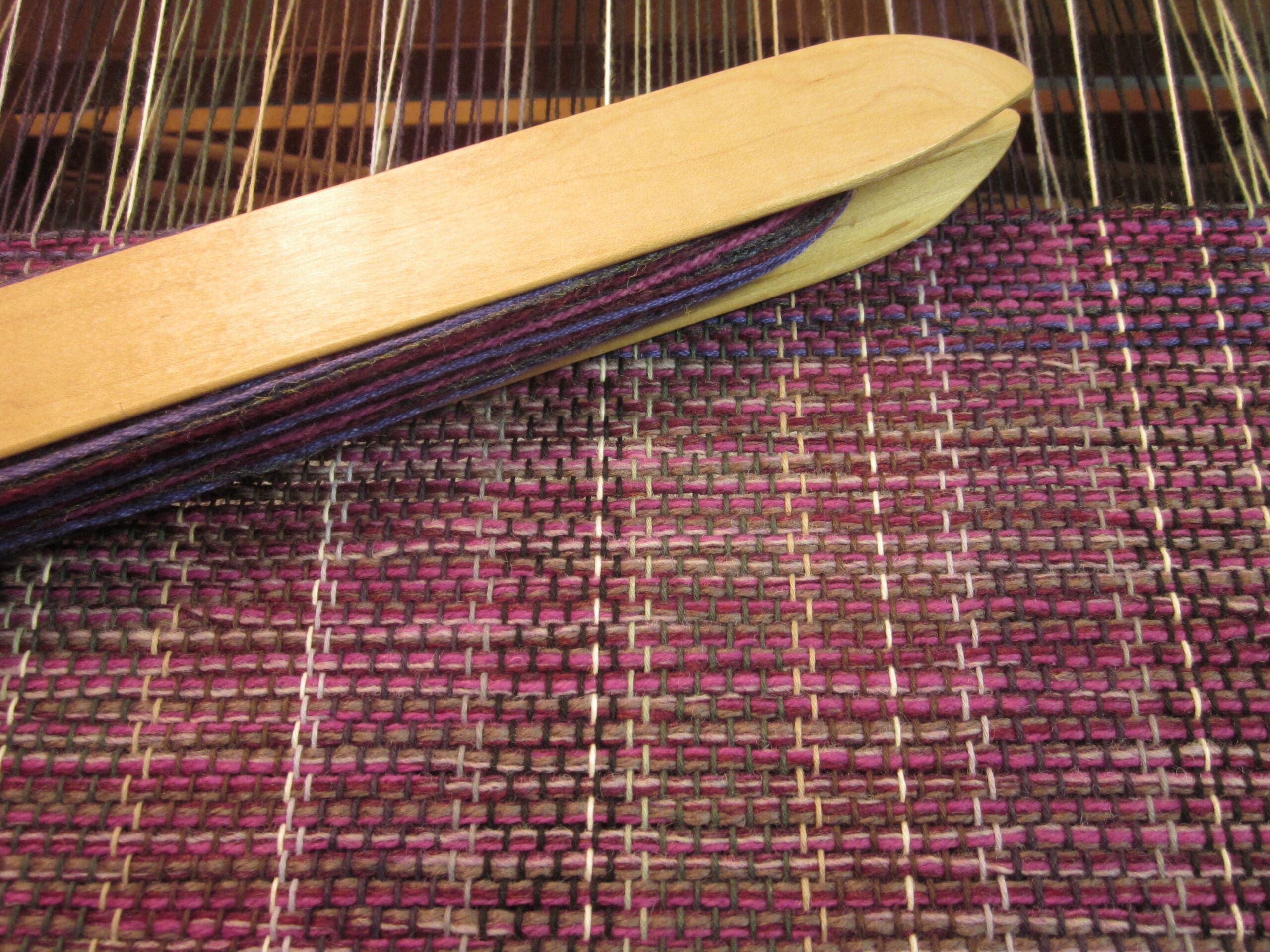 I like to group yarns together in the shuttle. So, at any given point, I’ll have 4-8 yarns traveling together to create the fabric. This technique makes it much more seamless when changing colors. I can keep 1/2 the yarns and change the other to gradually alter the overall look. Below, you can see the subtle change to a darker purple…