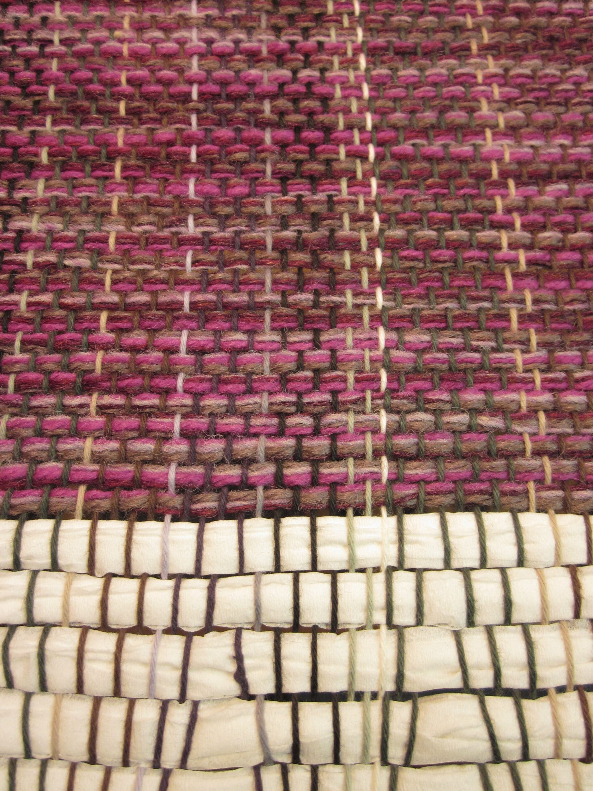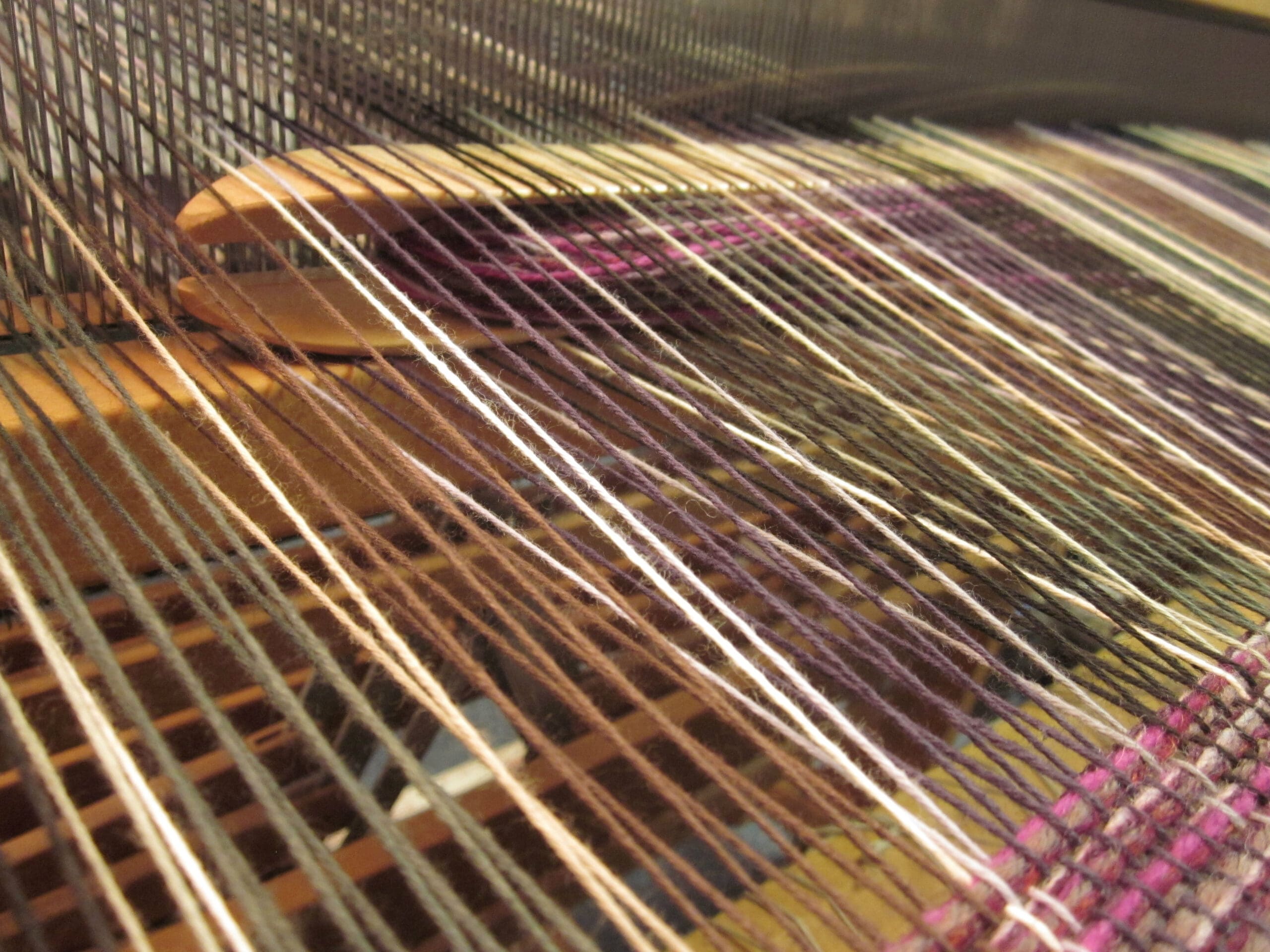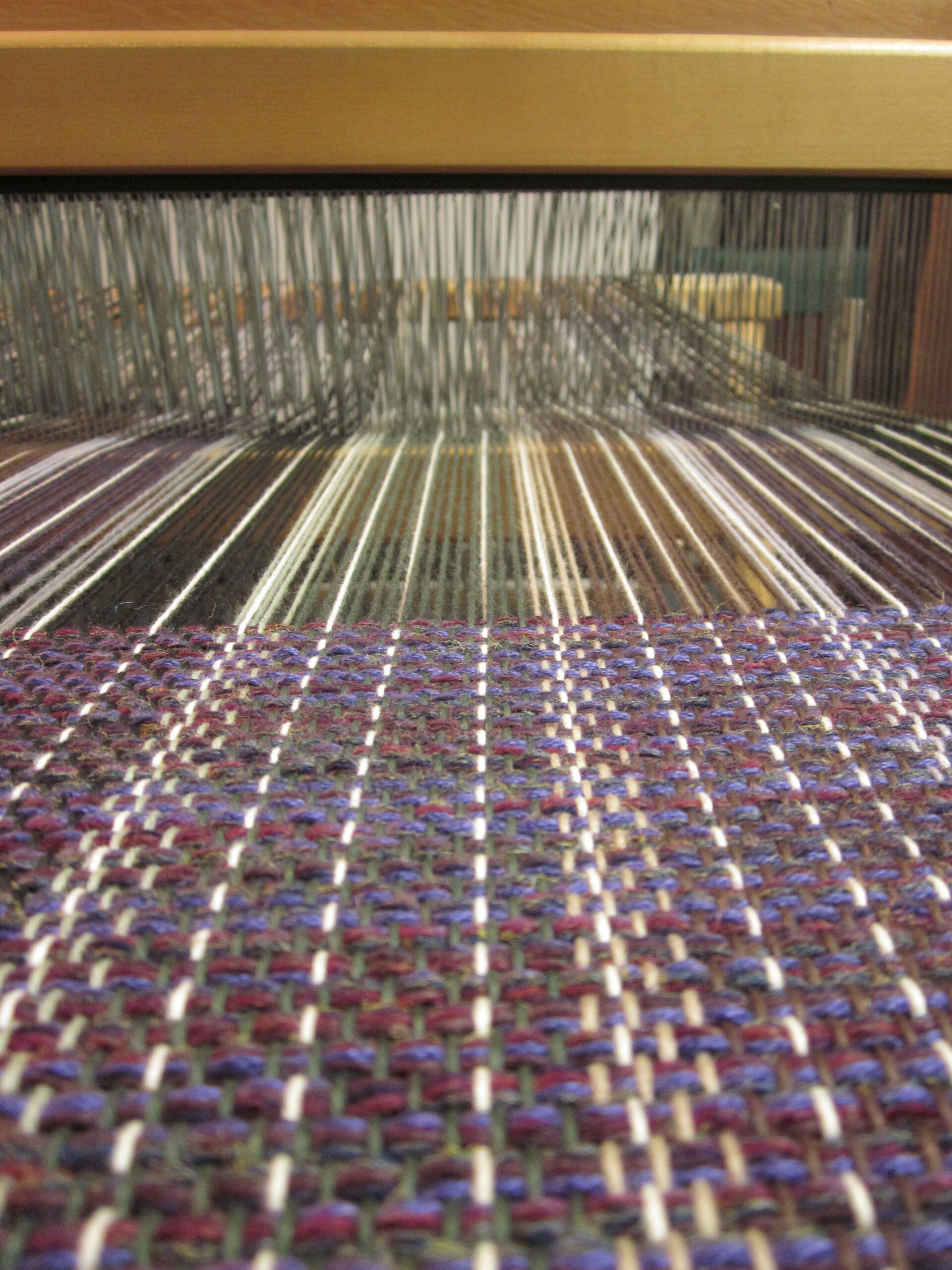 I like to group yarns together in the shuttle. So, at any given point, I’ll have 4-8 yarns traveling together to create the fabric. This technique makes it much more seamless when changing colors. I can keep 1/2 the yarns and change the other to gradually alter the overall look. Below, you can see the subtle change to a darker purple…