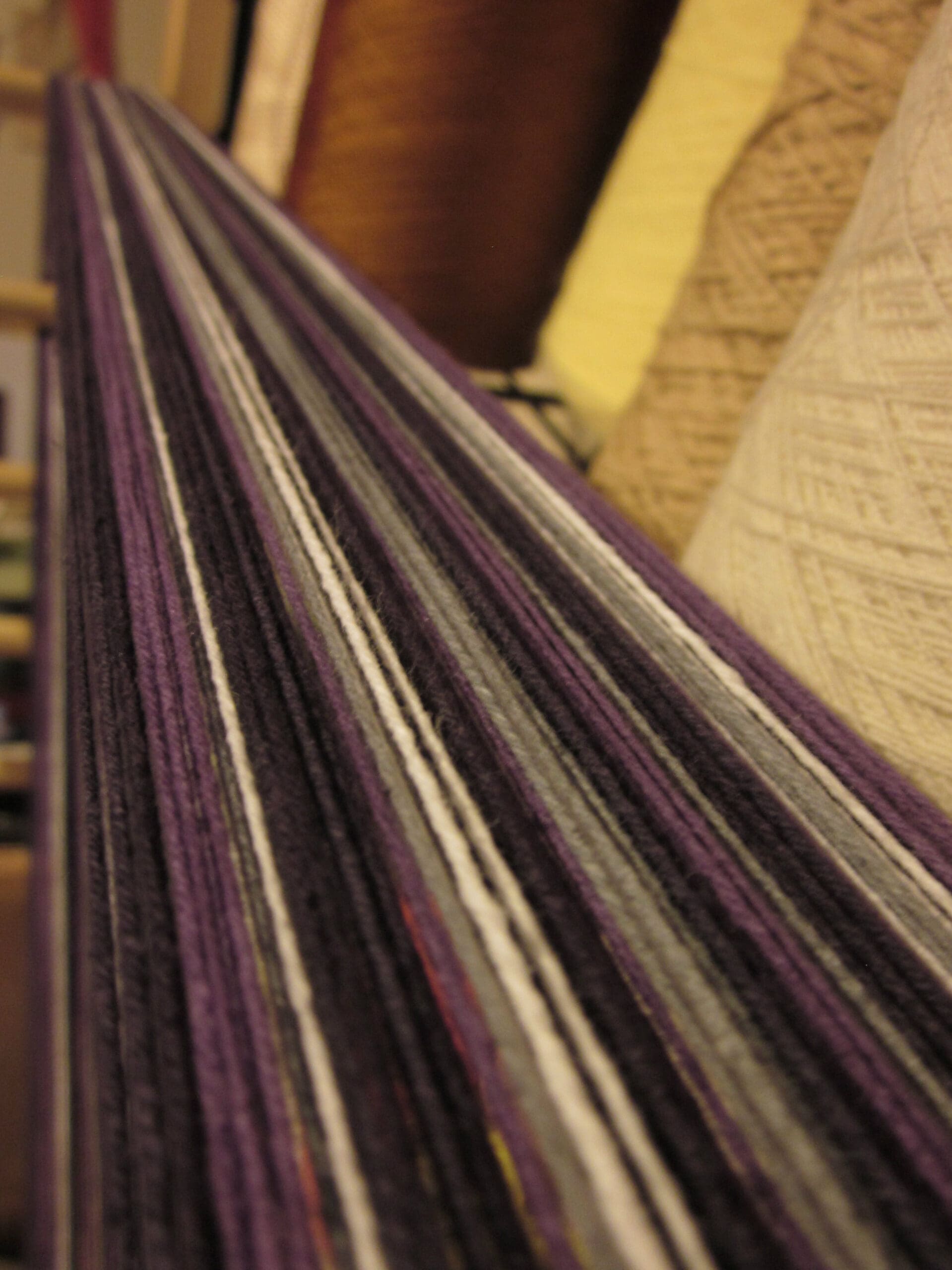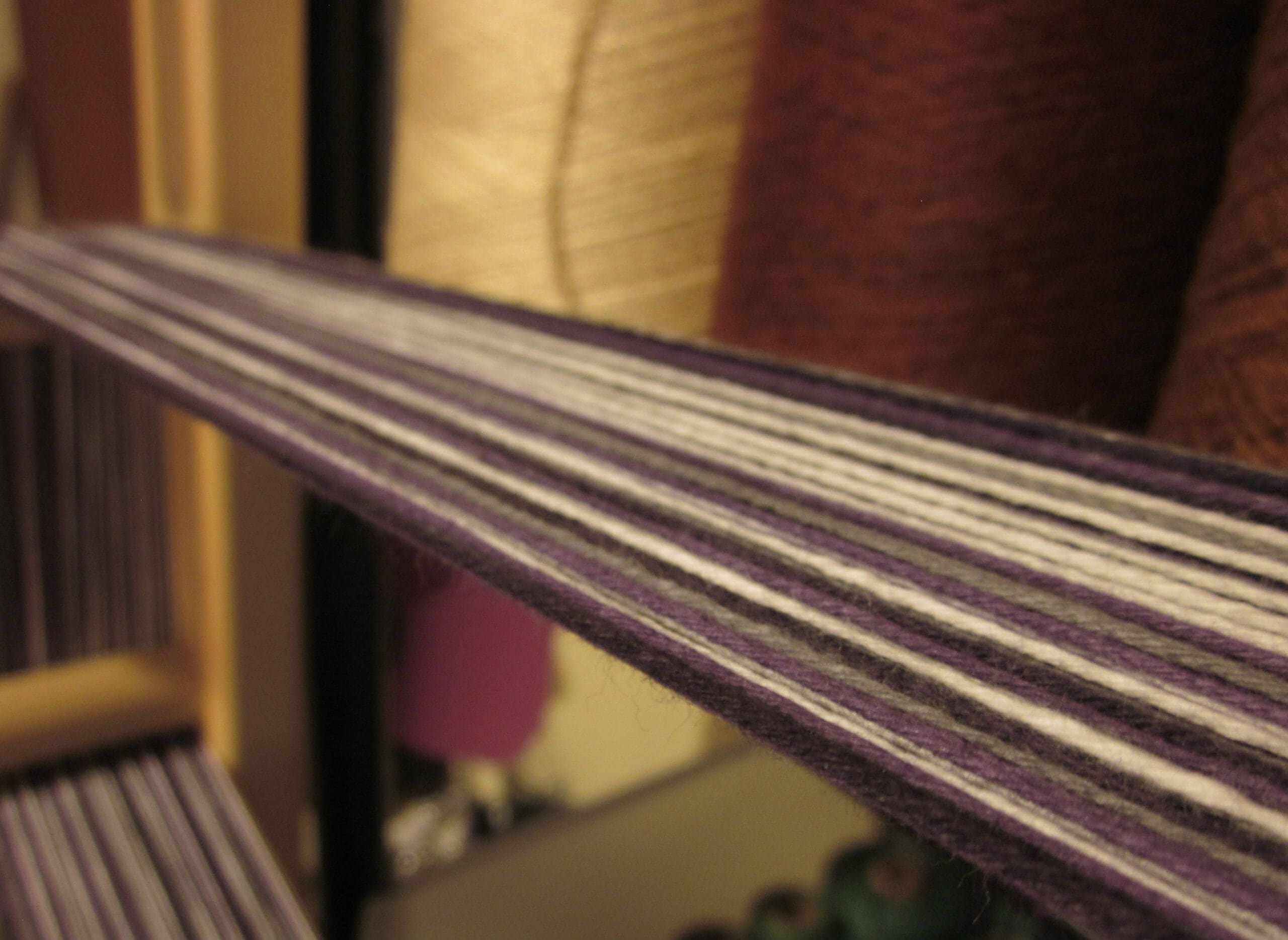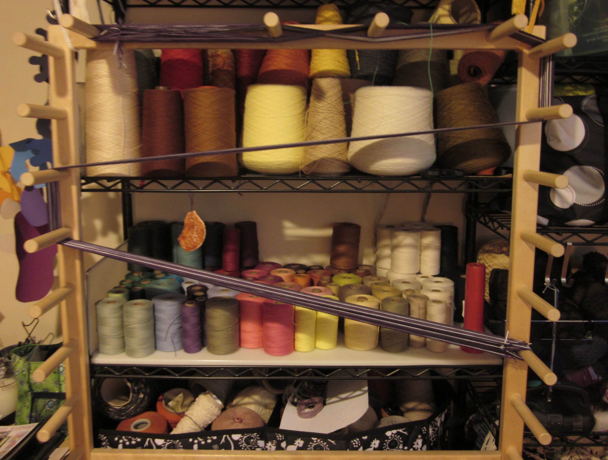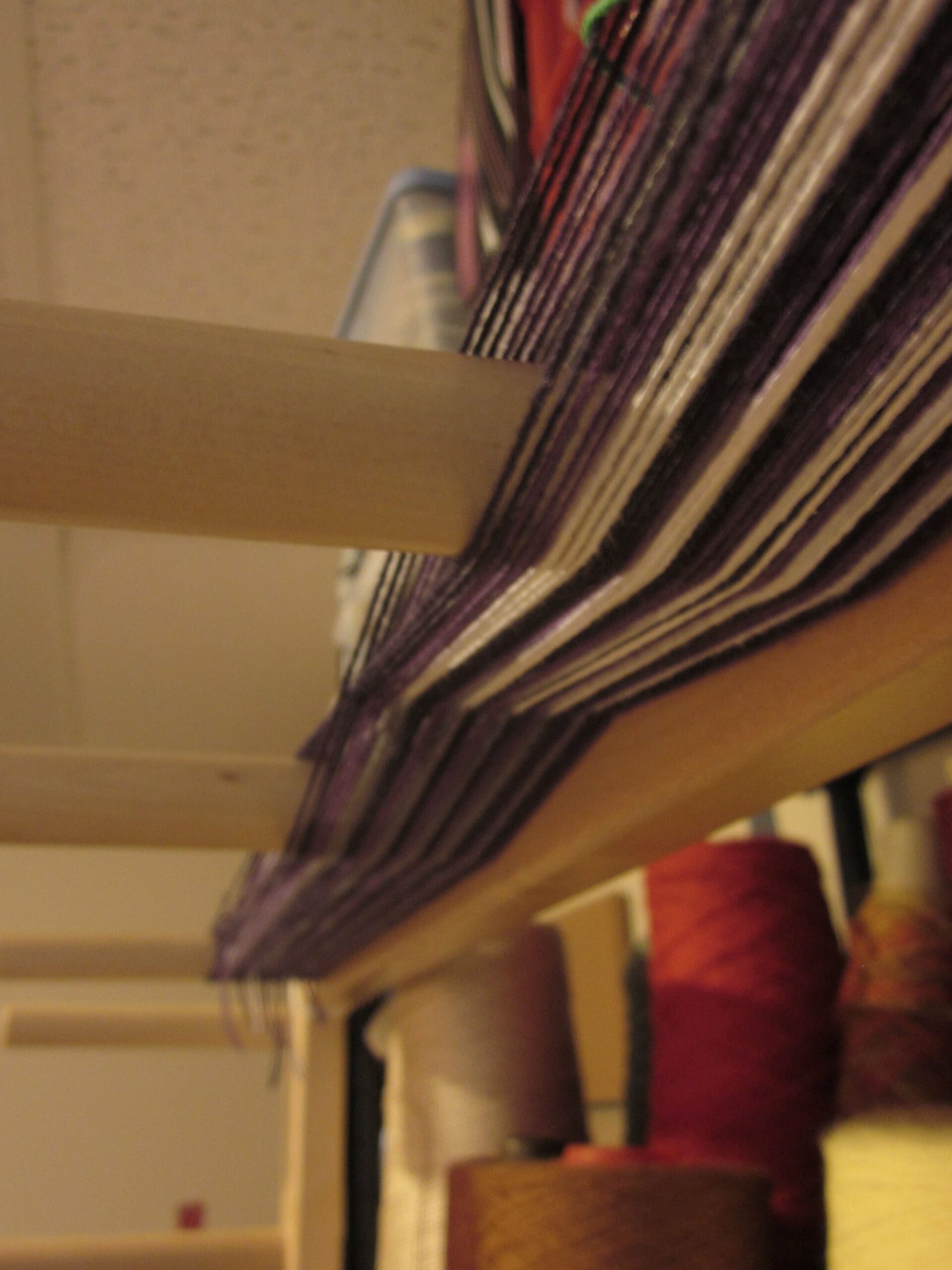 First up, measuring the yarn. I think it’s important to show the warping board and the process of winding the yarn, in order, around the pegs. But, I always cringe because the photos almost always show more of the room than I’d like. I don’t carry all the stereotypical “artist” tendencies. But, the messy part – I’ve got in spades! At least the capacity for it. So, for my very neat friends, try to overlook the other stuff! Just focus on the warping board… please… I’ll feel better if you do…