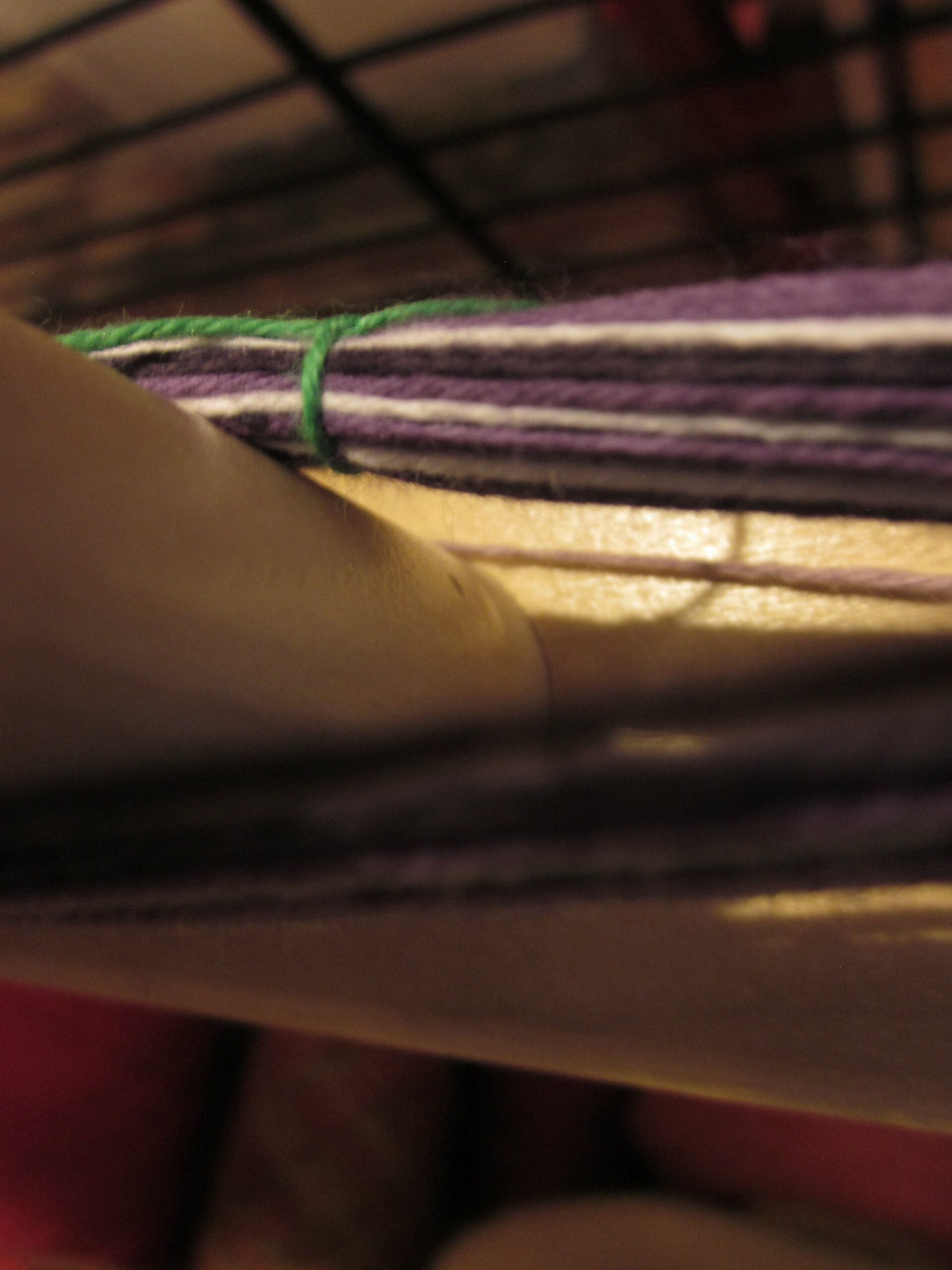 Part of the goal when working on the warping board is to put all the yarns in order for the project so you don’t have to worry about it again! One way to do that is by using the “cross”. You pick 2 pegs (usually at the top, could be at the bottom) to be the framework. My cross pegs are at the top of the warping board near the starting peg. By sending the yarn over the pegs in different directions, you develop an order that can be translated once it’s off the board. I don’t mean for it to sound cryptic, but it’s a little tricky to explain. Maybe one day I’ll do a video for you – that would be easier! In the meantime, trust me – the cross works!