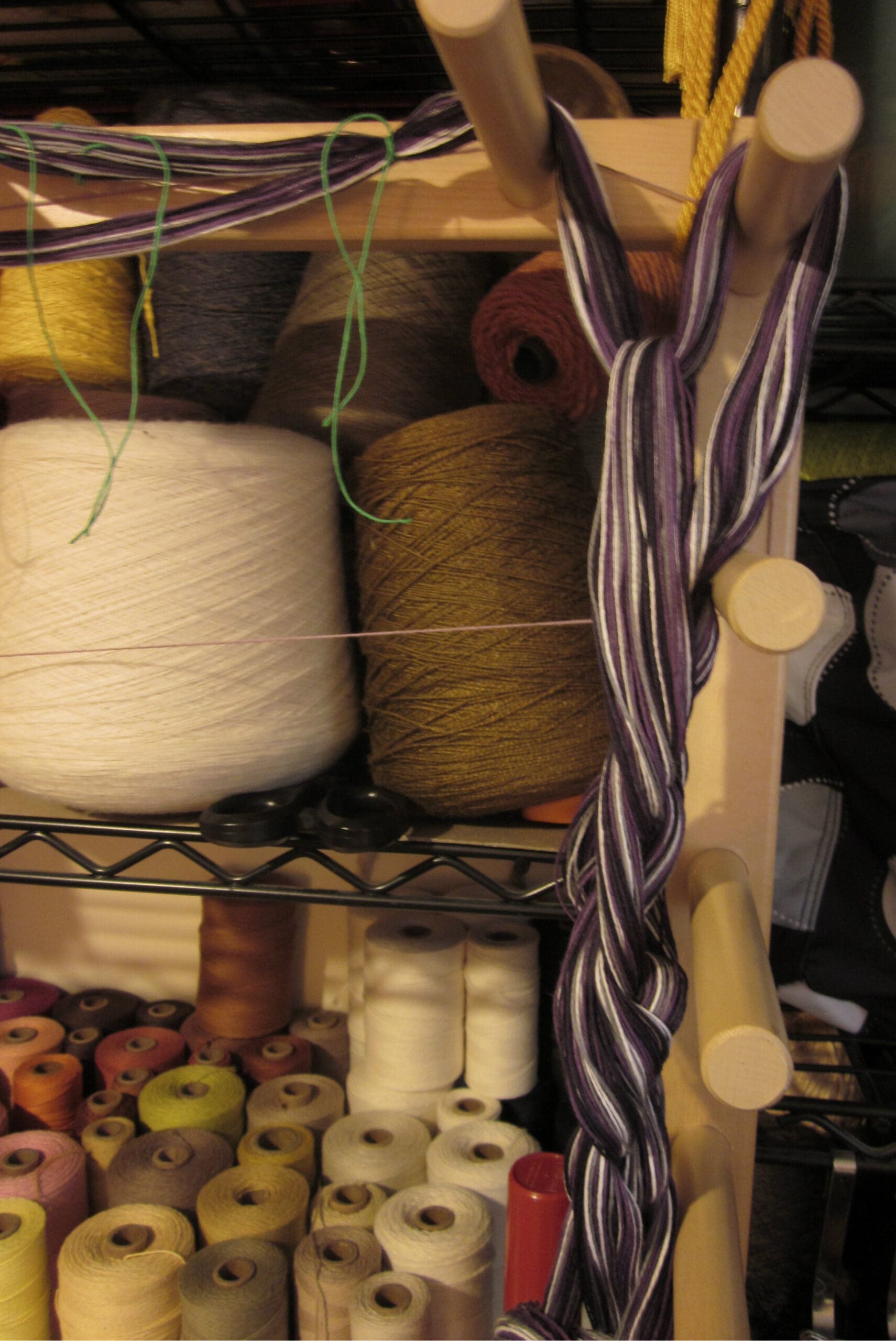 Once everything has been measured, I take a contrasting-colored yarn and tie it in critical spots around the cross, so I can reproduce the order later! Then, I do a loose twist and slide it off the warping board! This project was big enough that I broke it into (3) different groups of yarns. I will put it all back together at the next stage, no sweat!