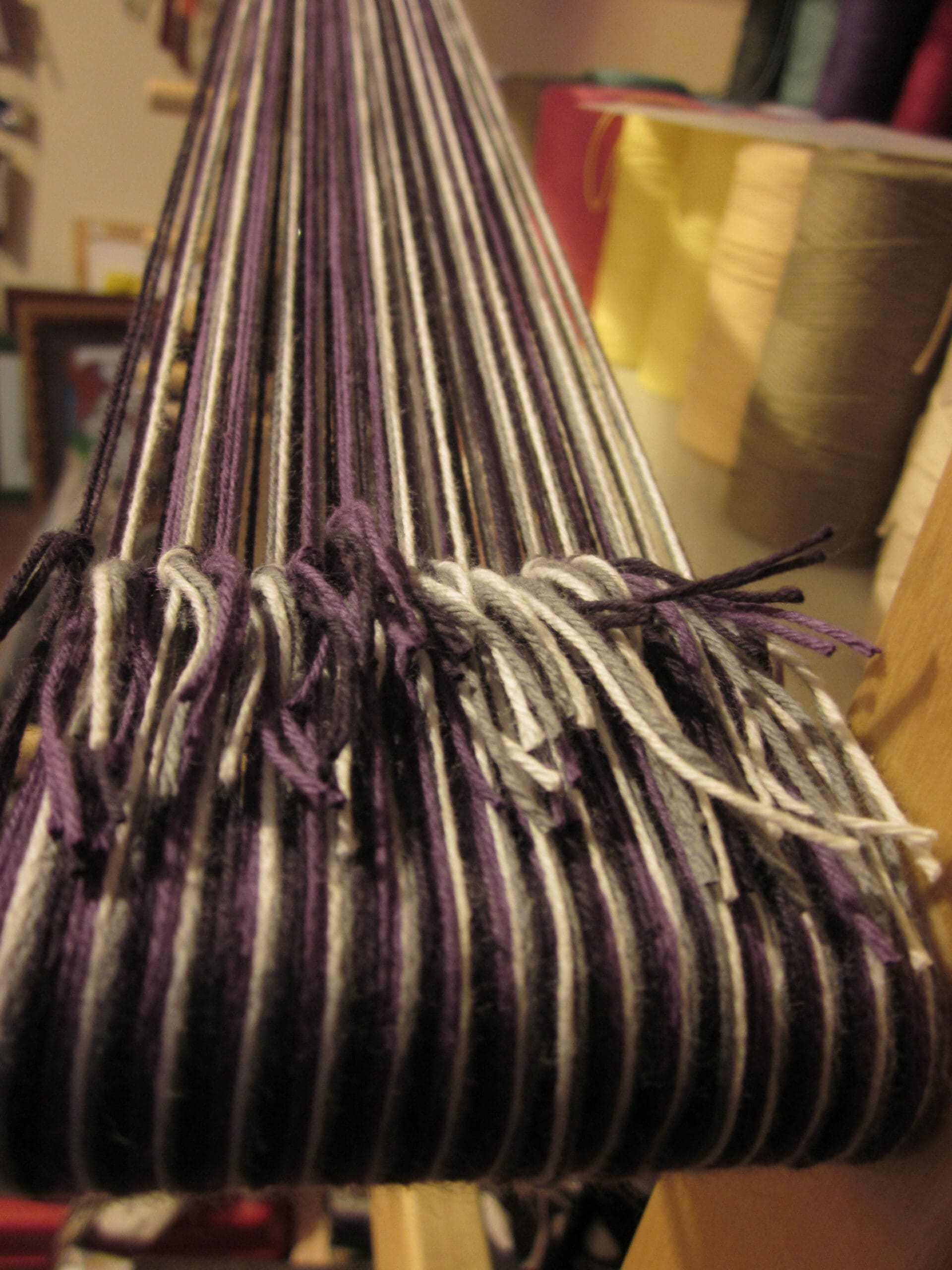 Because I don’t have actual silver metallic yarn, I’ll be using a light gray and a white instead. I’ll use the colors above to “dress” the loom (set up the loom). Then, the plan is to dig into my collection of neckties and use the “silver-y” ones for the shuttle. While I’m not usually a sparkly, glittery sort of weaver (if you hadn’t already guessed!), this should be a fun change! And there are always occasions when you need a cute, little silver bag! So, here goes!
