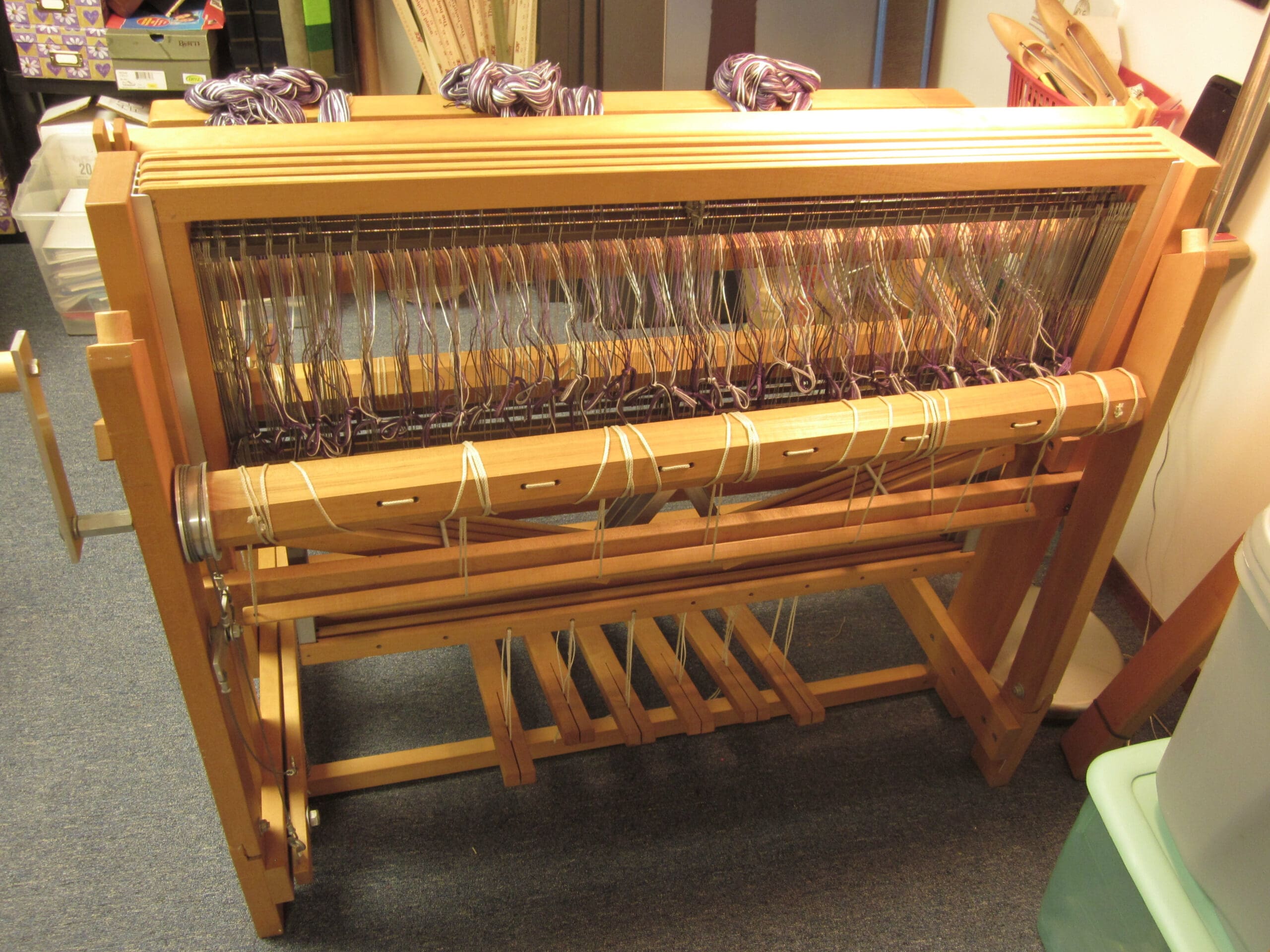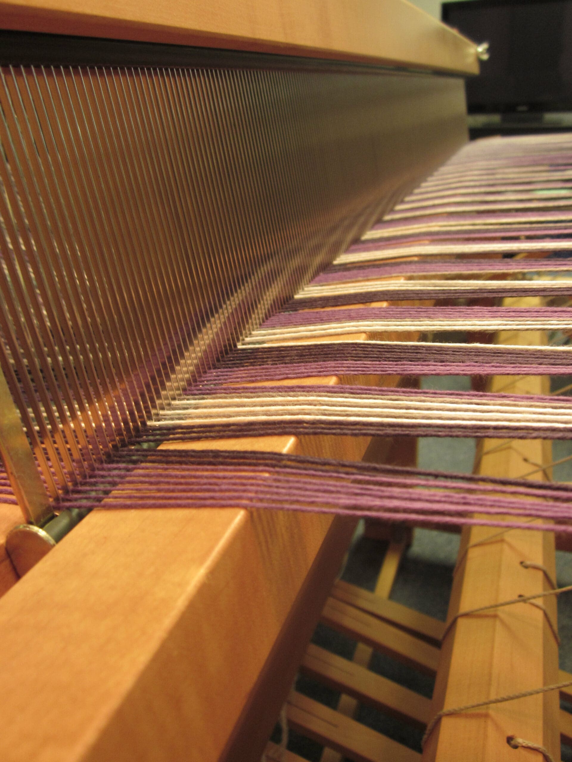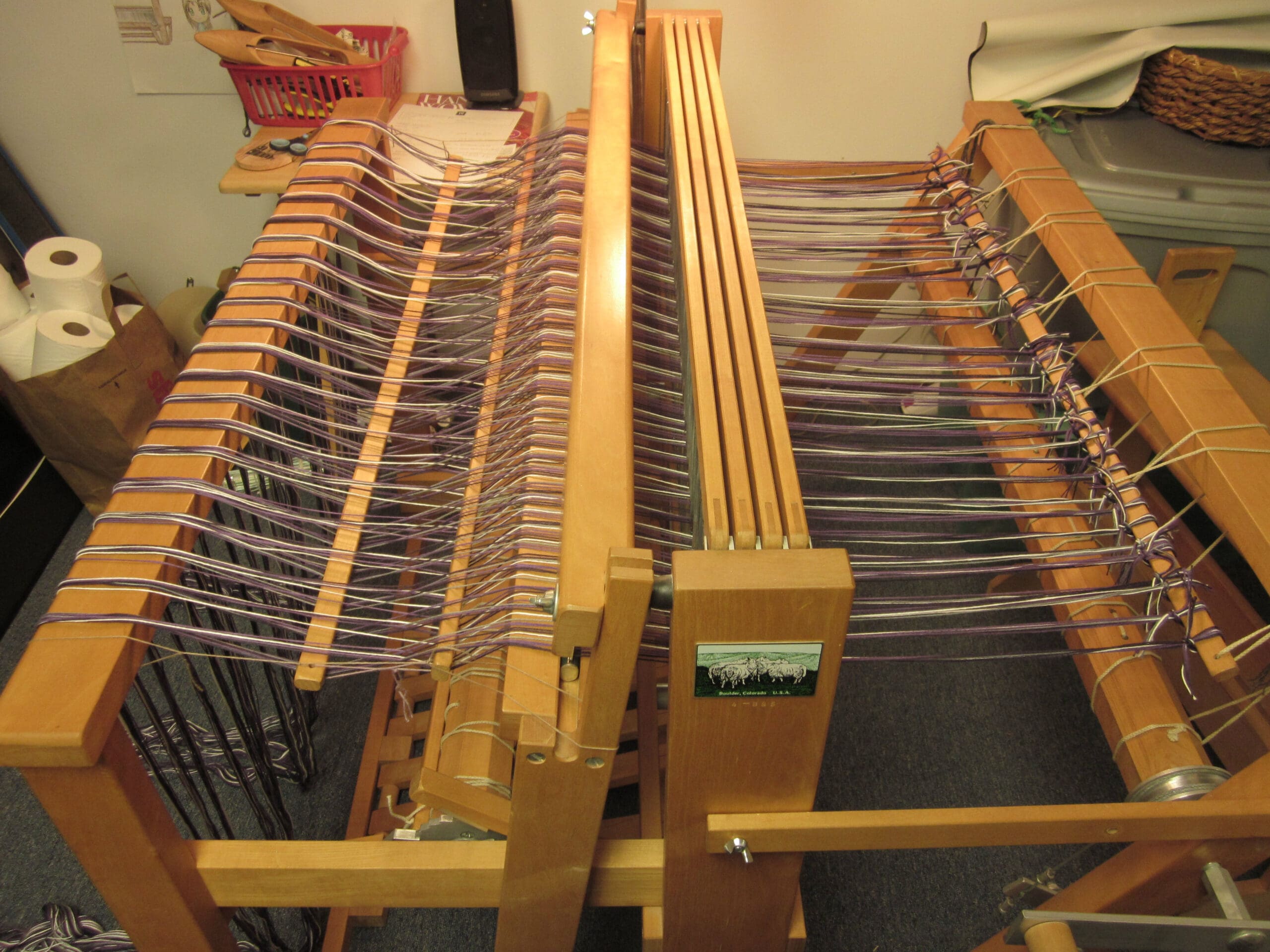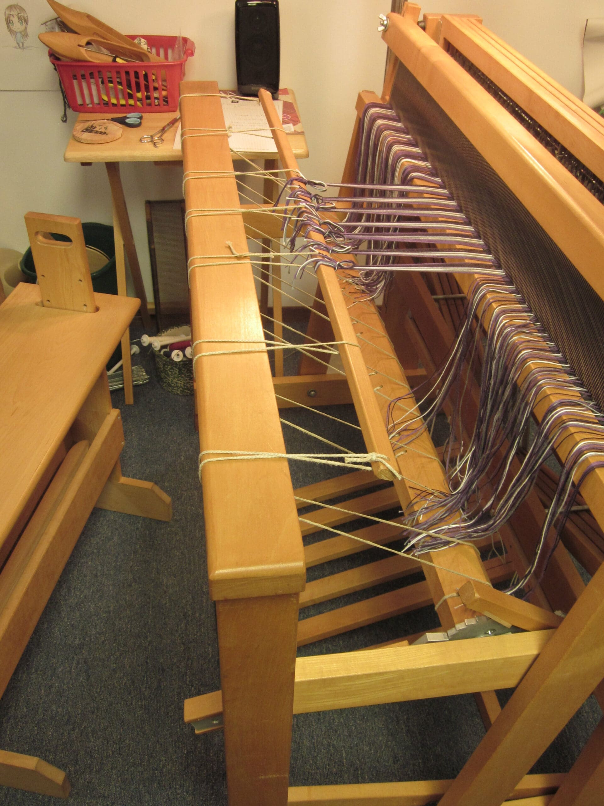 The photo above shows the back of the loom. There’s a bit of loom-altering that happens after the heddles are threaded and before I start winding. The entire back beam structure opens up and the top bar slides on (which you can see in the image below). It’s funny how owning a loom requires you to be part mechanic, along with the rest of the hats you wear (artist, mathematician, scientist, etc.)!