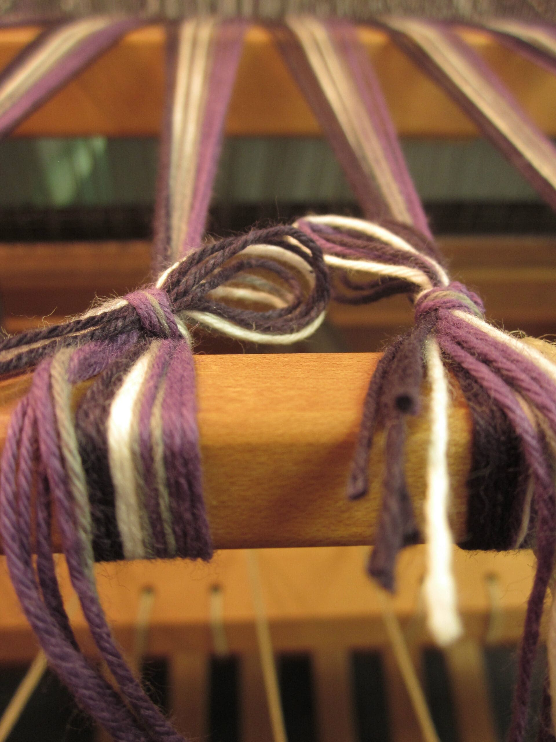 These are the fancy knots I mentioned earlier. The beauty of them is that when you are ready to undo them, you tug on the shorter ends and voila! Knot is no more! Because I use the kind of cotton yarn I do, I’ve found that the fancy knot will slip open if I don’t put another basic knot underneath it – which negates the magic a little bit. But all in all, it’s still easier to undo at the end of the project than a square knot!