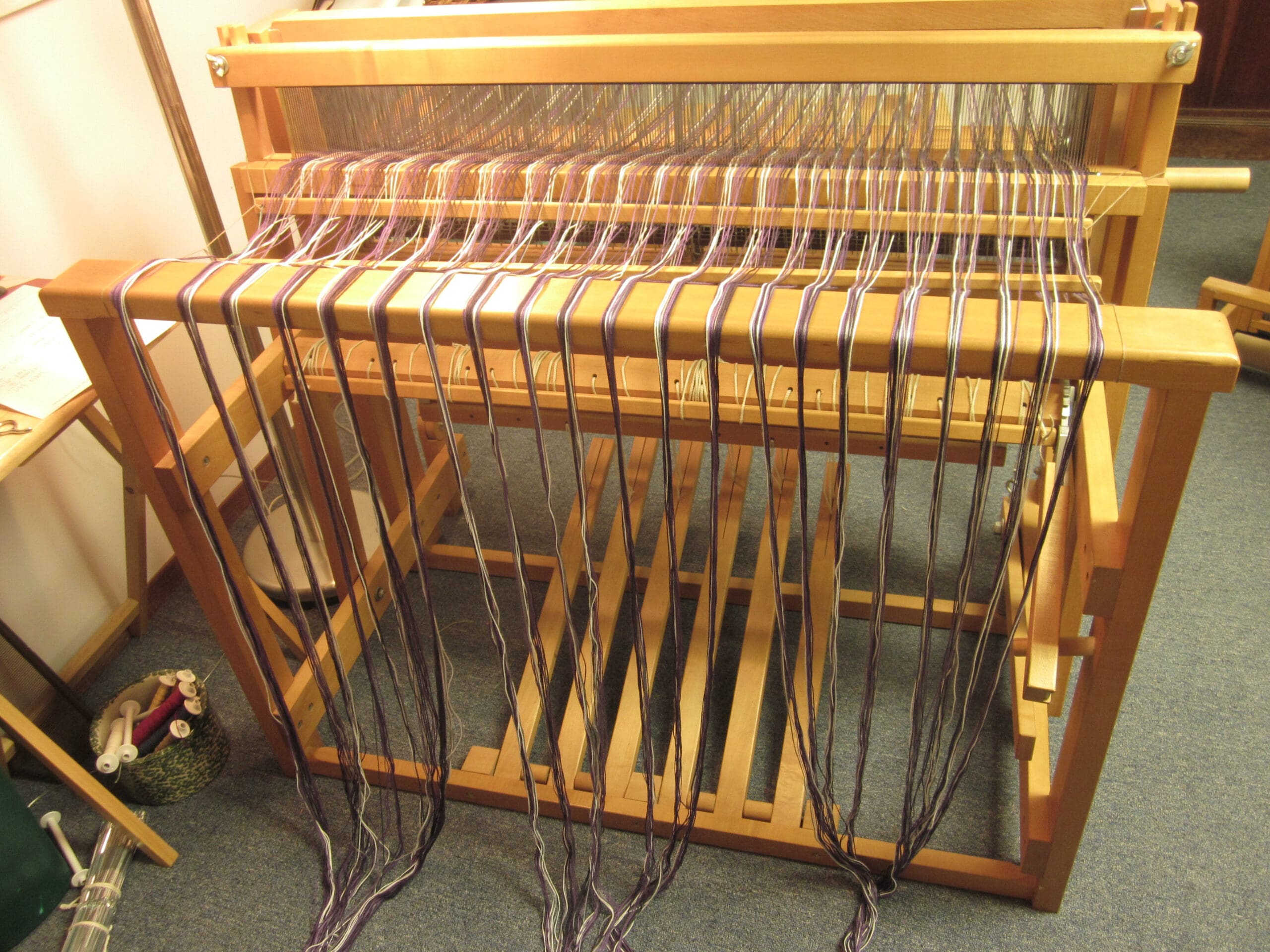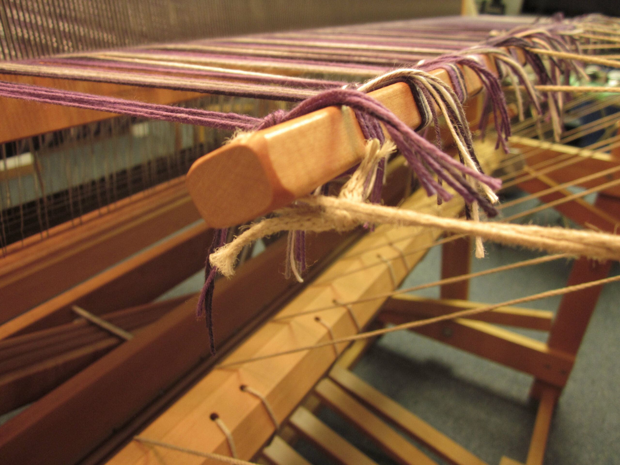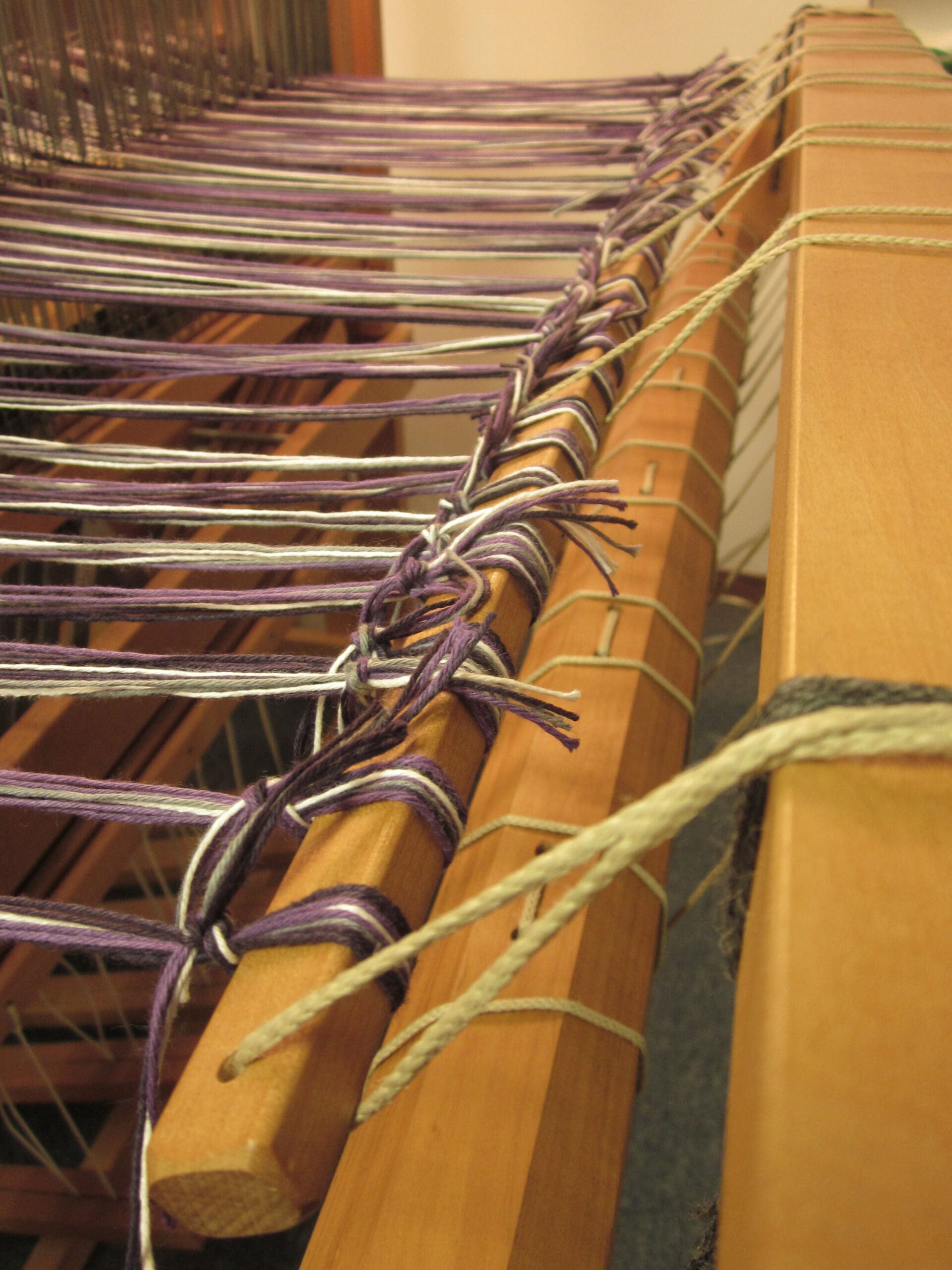 The yarn has been measured, threaded through the reed, sent through the heddles and is ready to be wound on!