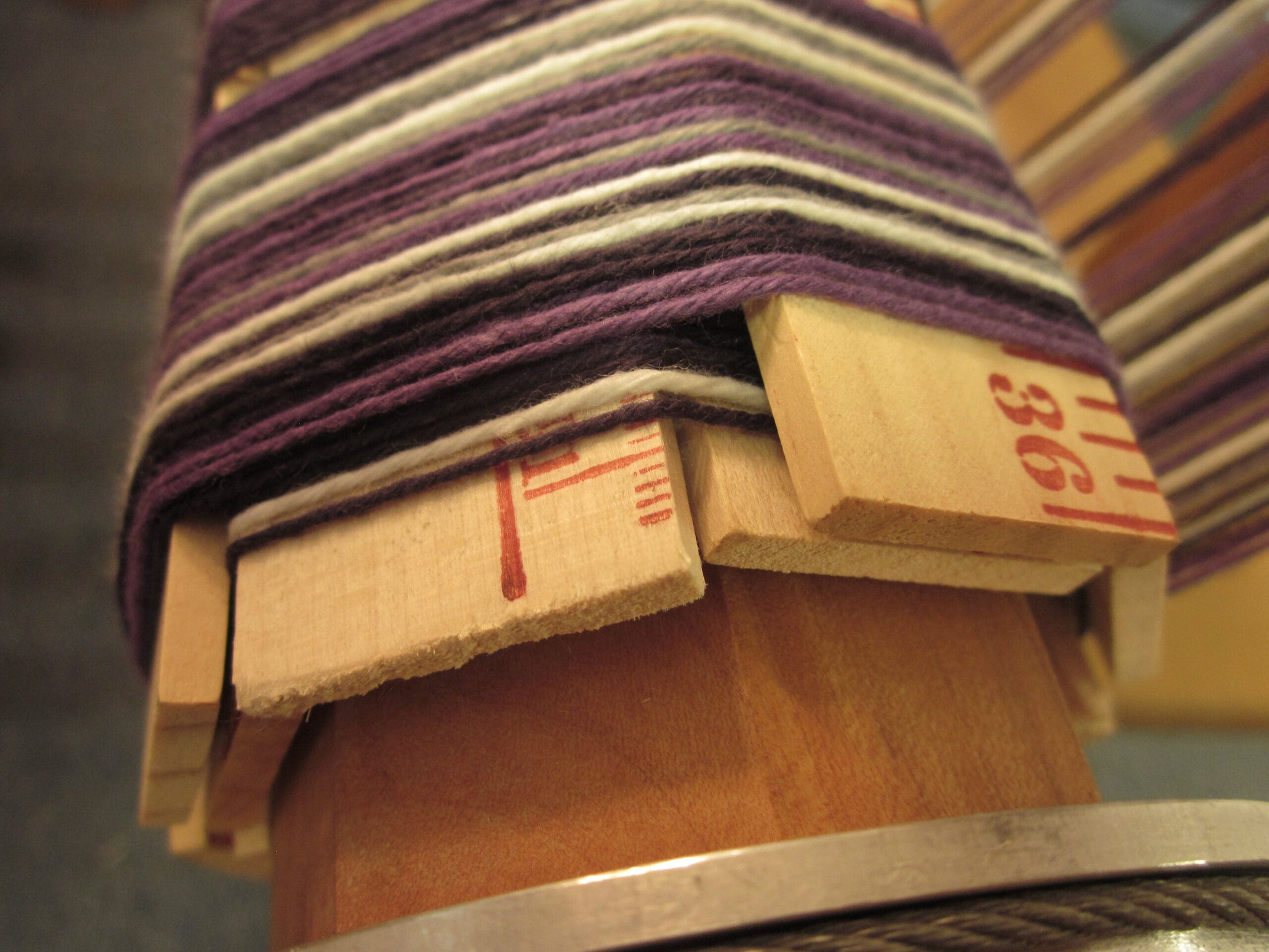 If you haven’t read a previous blog where I’ve been winding on, let me introduce you to my beloved yard sticks! My loom has a 36″ wide weaving width. Thus, yard sticks are a perfect fit around the front and back beams! They keep the yarn from developing mountains and valley when winding over itself. Once upon a time, I picked up different lengths of scrap from Lowe’s – which could have been a great idea! But then, I soon realized that they are scraps because they are irregular in length and width, which I didn’t really enjoy. To add to that, I didn’t really want to take the time to sand all of them. So… yay for yardsticks!!!