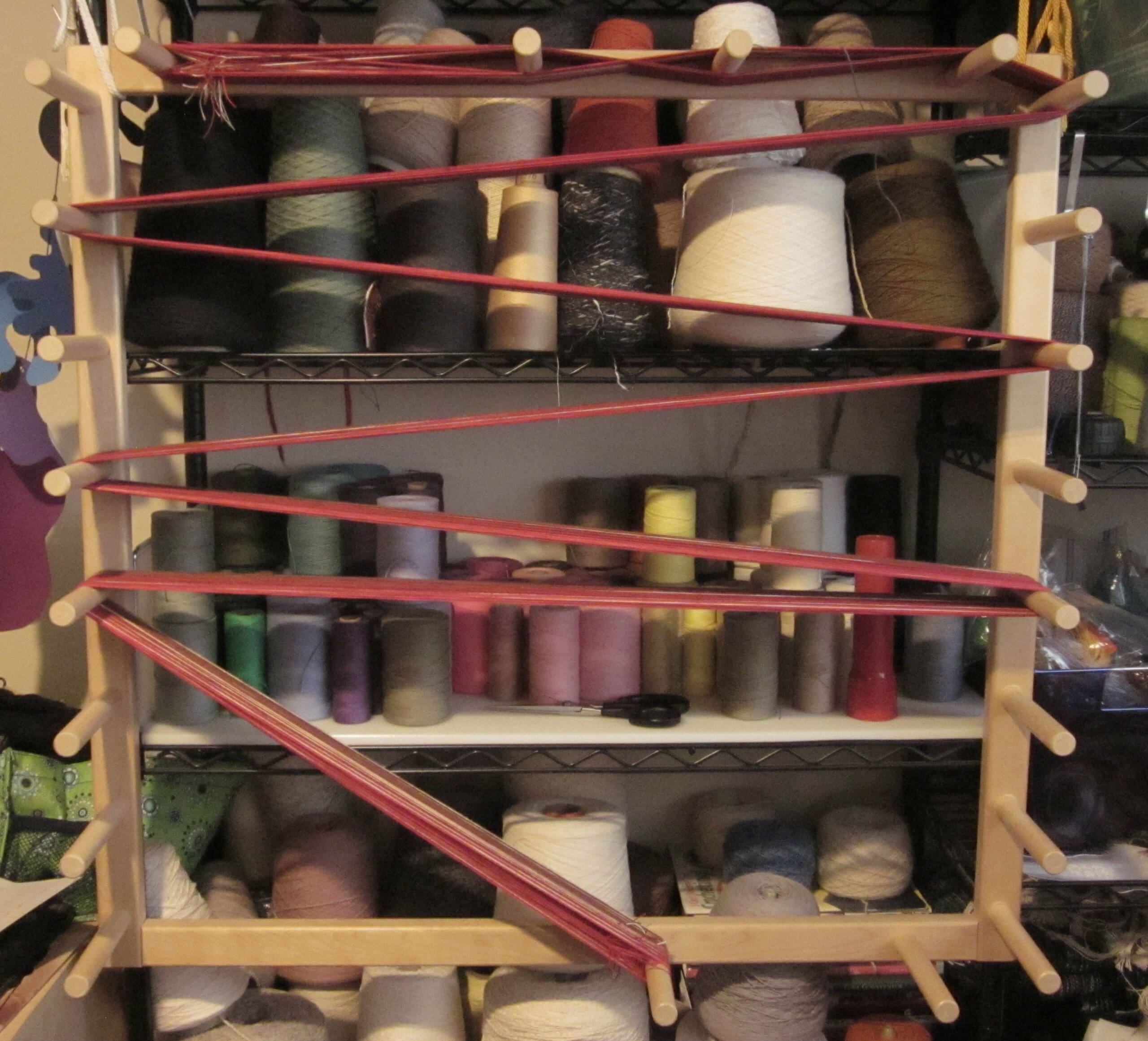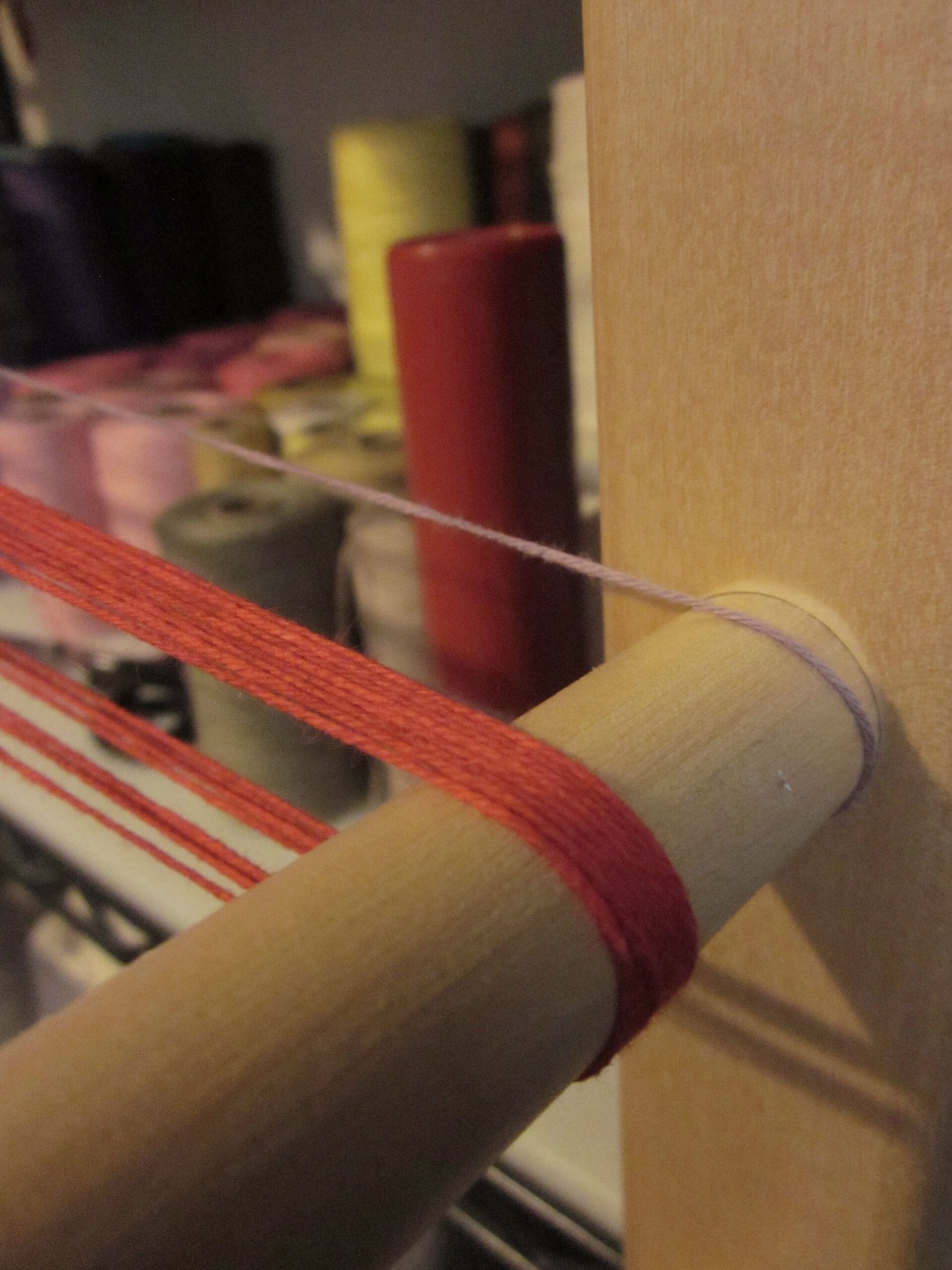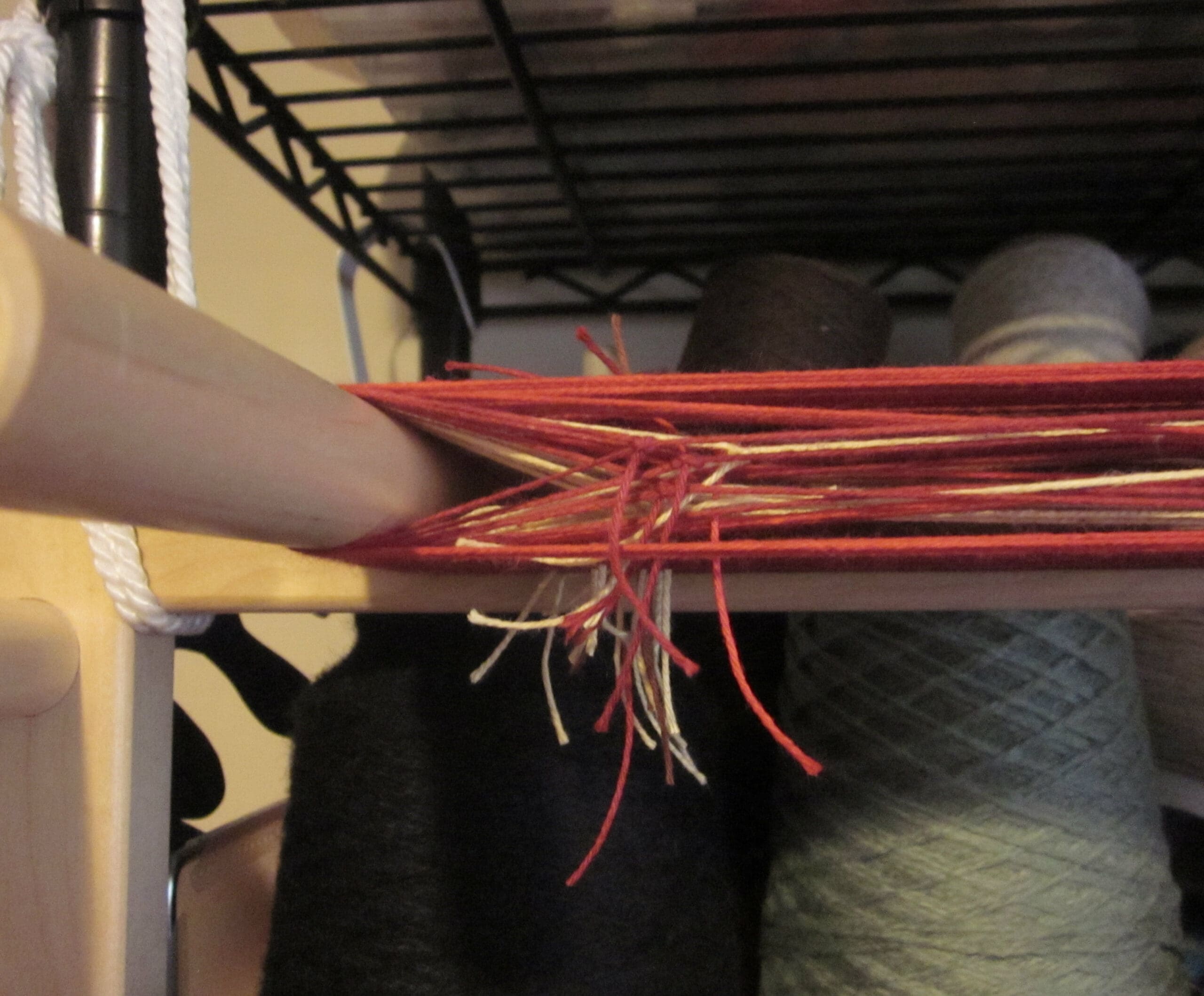 When you are measuring yarns on the warping board, it is inevitable that you will need to change colors. Earlier in my weaving career I would have tried to save as many inches of yarn as possible by not cutting and knotting it if I didn’t have to. These days, I have taken a different approach! If it saves me time and frustration to cut it – yes please, let’s cut it! Plus, I don’t typically use expensive yarns. Thus, it is helps with the overall justification. Bottom line is, all those ends you see at the picture above, are occasions when I’ve knotted and cut the yarn to change colors. (That was all sorts of wordy, wasn’t it? Sorry – I can get carried away!)