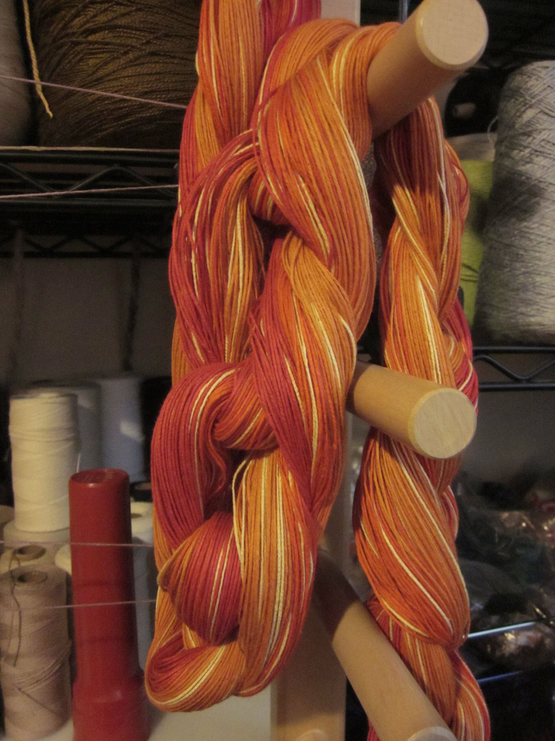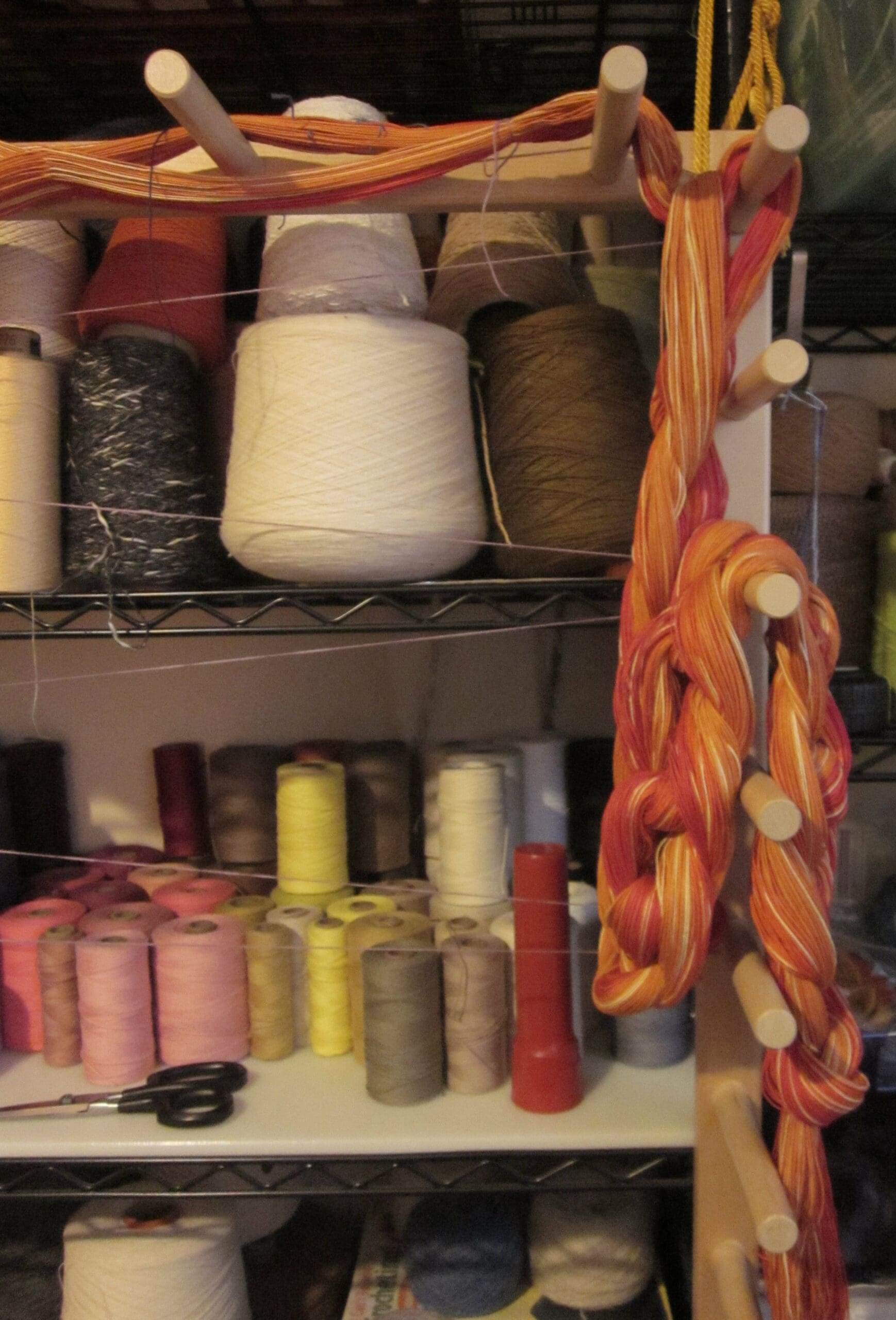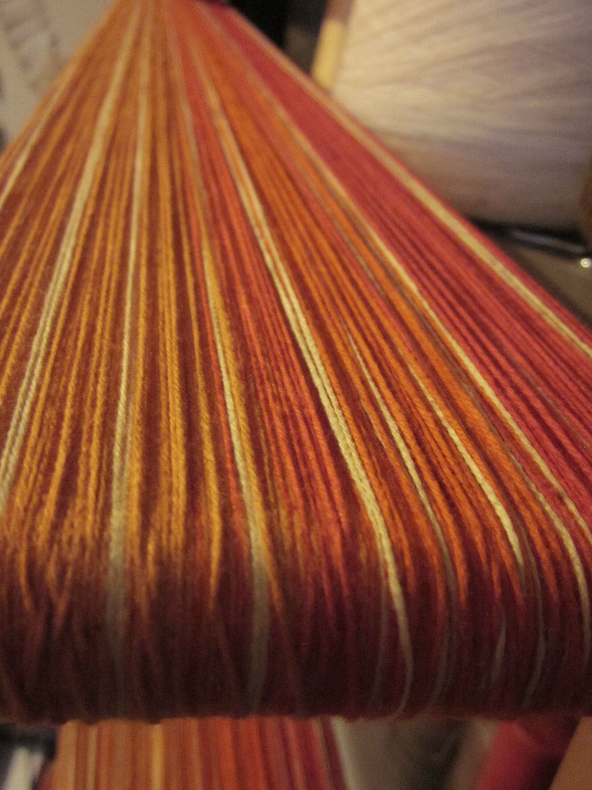 There are other ways to lay out a project besides using a warping board. Warping mills are also a great tool! And they always look like such fun! Instead of moving the yarn around a board, you spin the yarn around a mill that looks like one of those rotisseries for gyro meat – know what I’m talking about? I would imagine that the process is a little easier on you, physically. But, truthfully, I haven’t had the pleasure of playing with one, yet! Maybe one day…