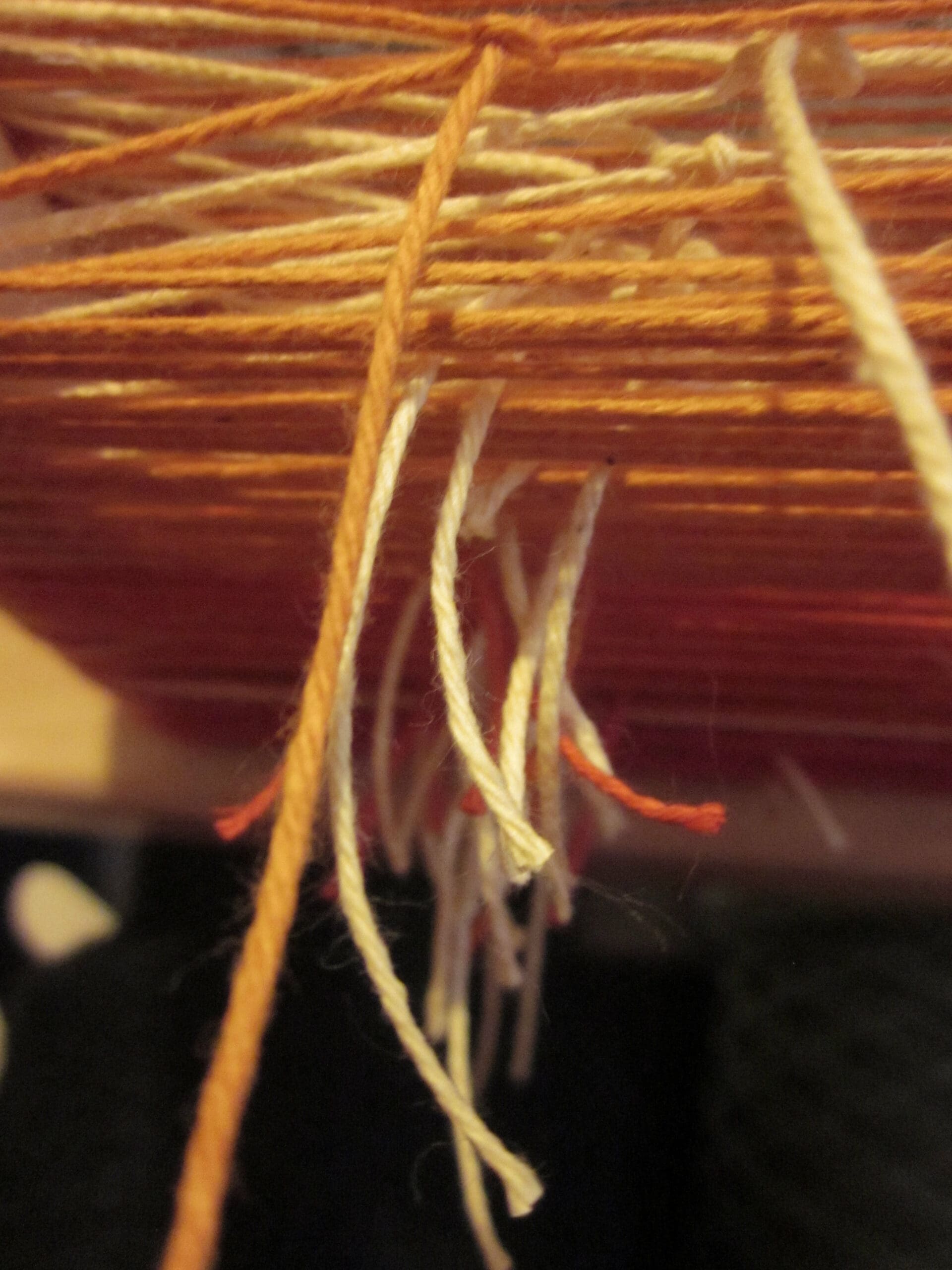 As I wind on, I make sure that the yarns are in order (it helps guarantee a more calm, peaceful weaver later!). I tried to capture a picture of the cross below so you can see how the positioning of the warp yarns will make a huge difference when sorting out the progression when its off the board!