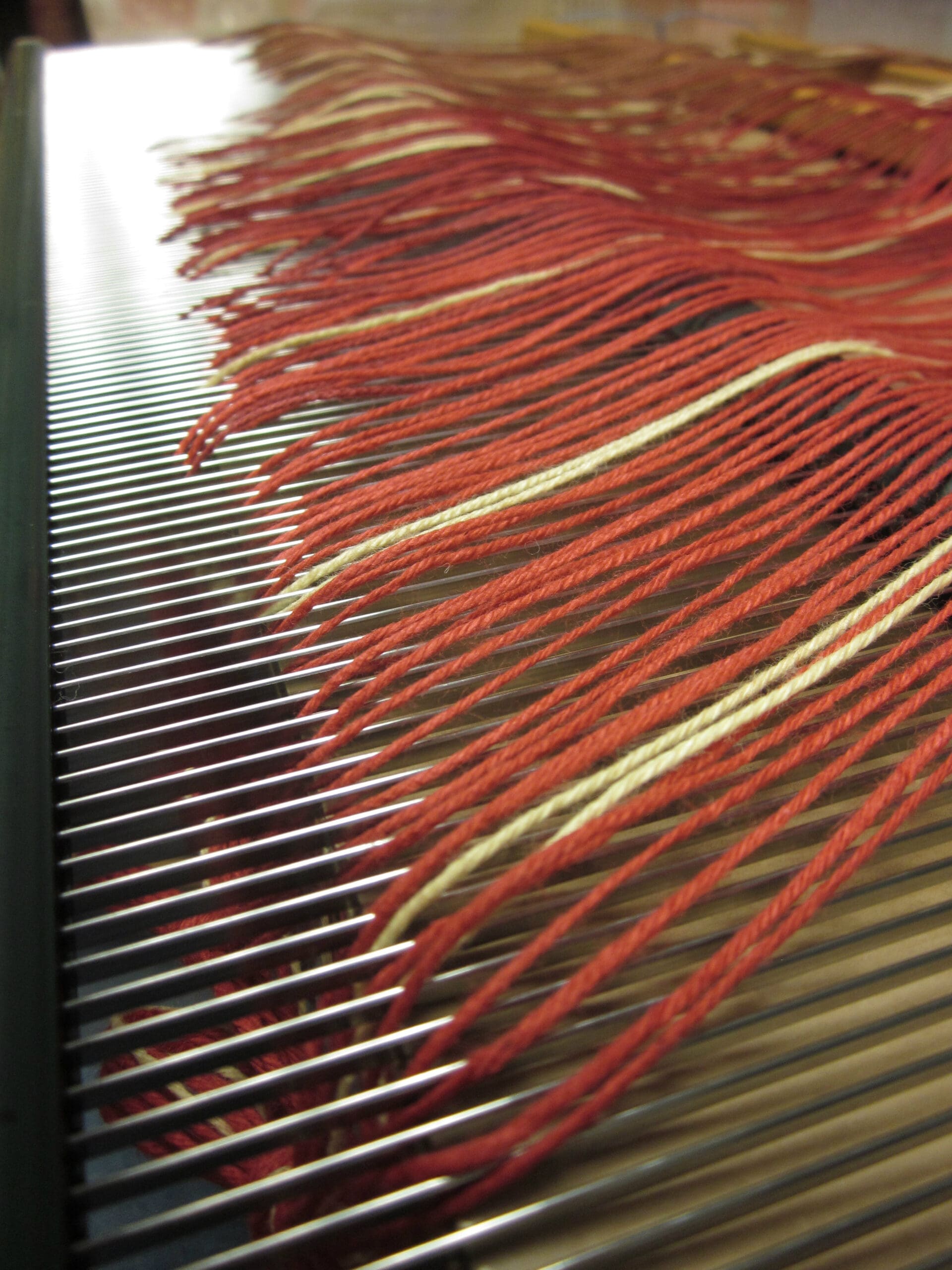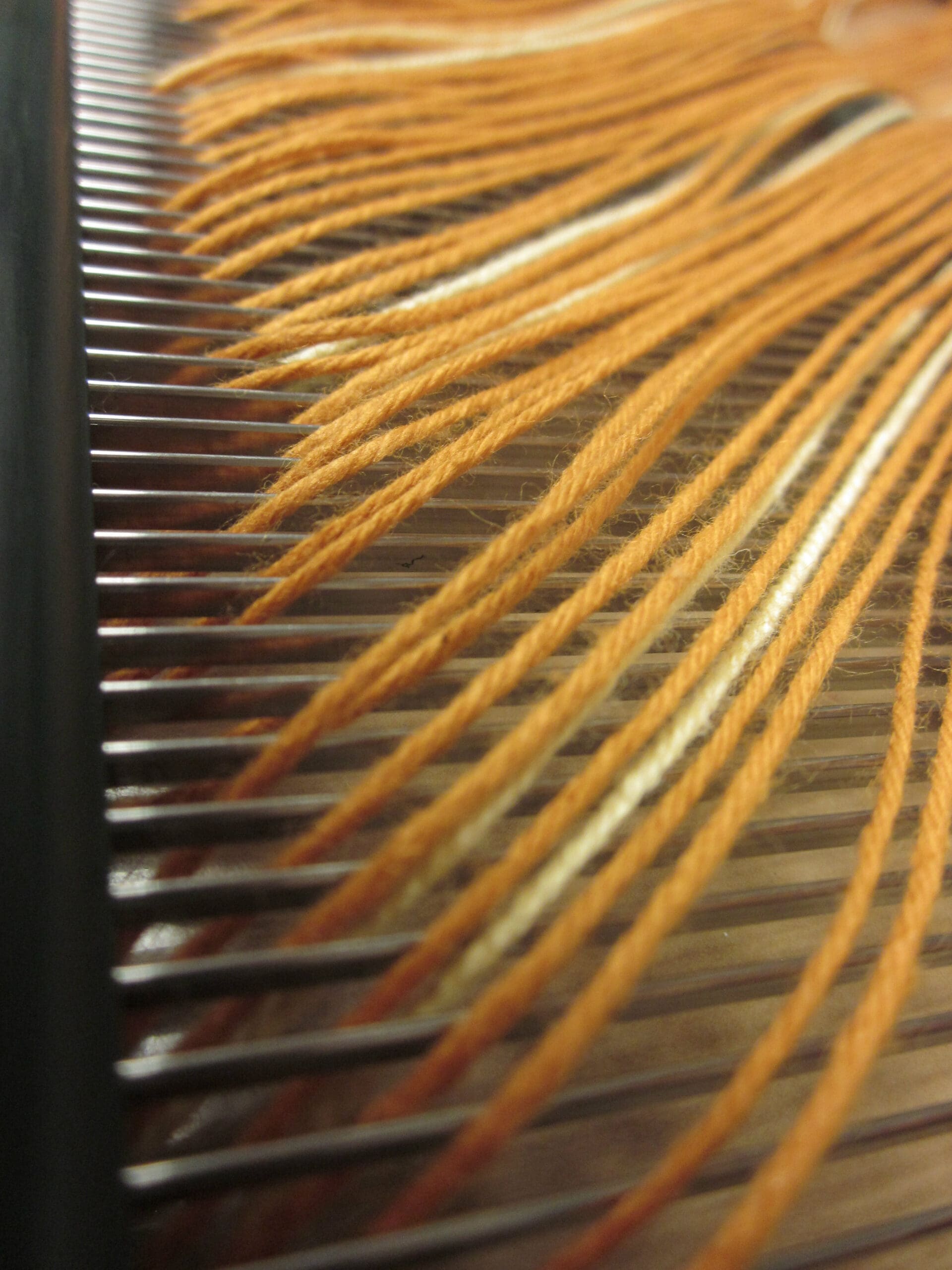 This part of the process usually takes a couple hours. I’m using a 36″ reed that has (8) dents per inch… doing the math… carry the (1)… well, let’s just say it takes quite a few yarns to fill it!