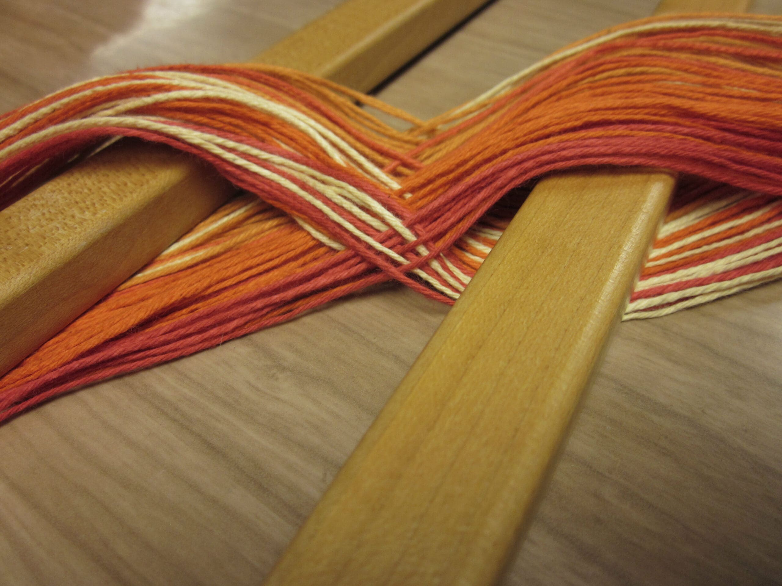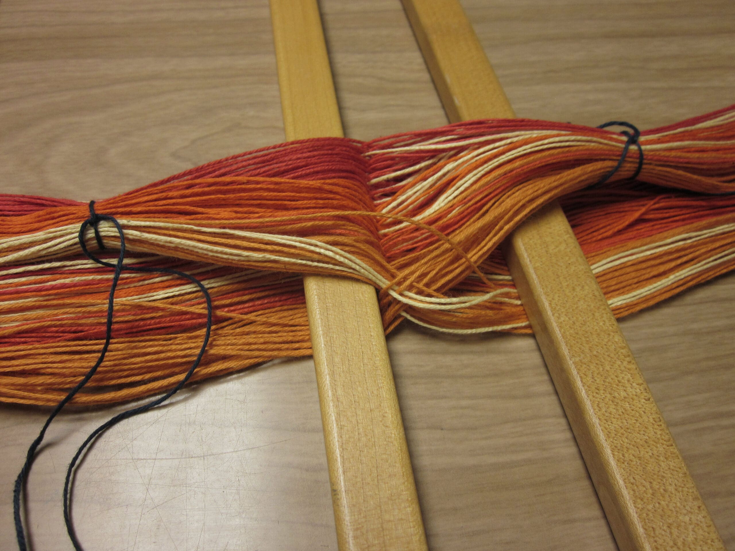 First up, the lease sticks slide into the yarn keeping the top and bottom groups from the warping board in place. This will show me which yarn goes first, second, and so on, continuing in order throughout the project.