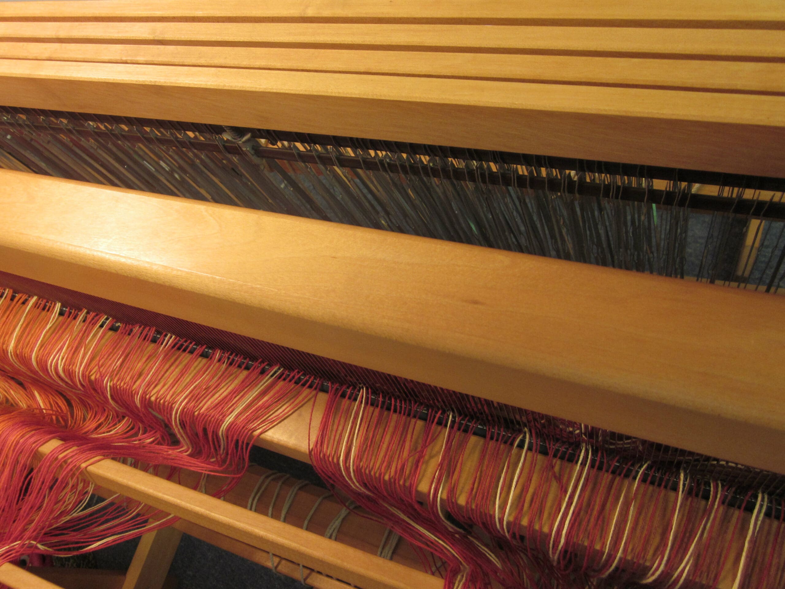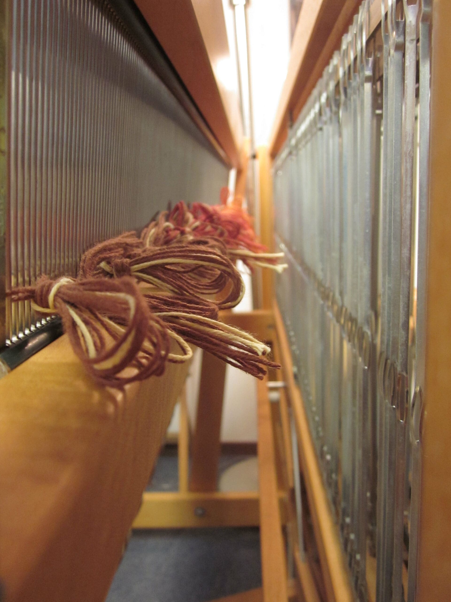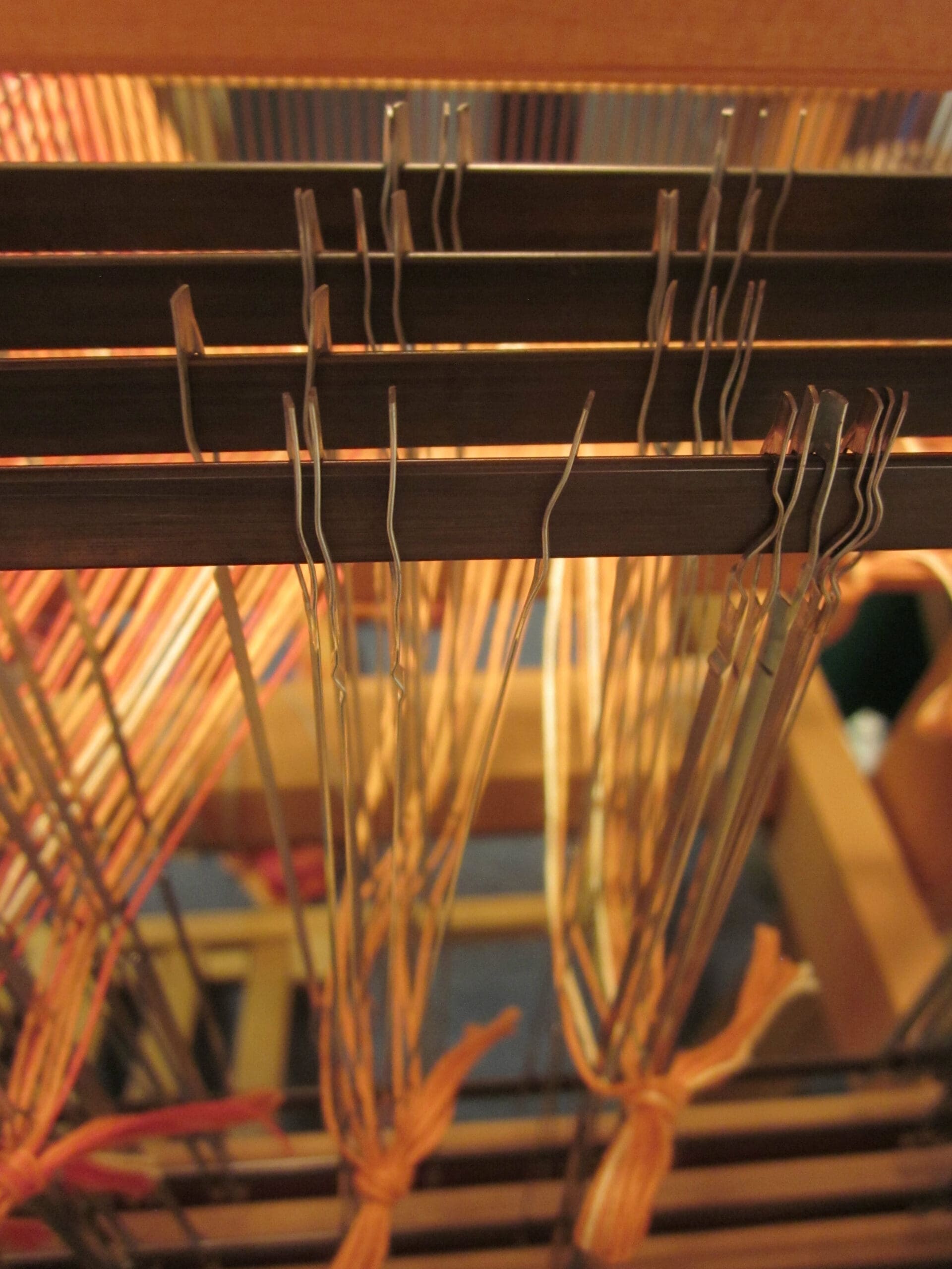 Above is a bird’s eye view of the beater bar with the yarn in it, plus the (4) shafts directly behind it! The heddles all live in the shafts. So, that is where the yarn is headed next!