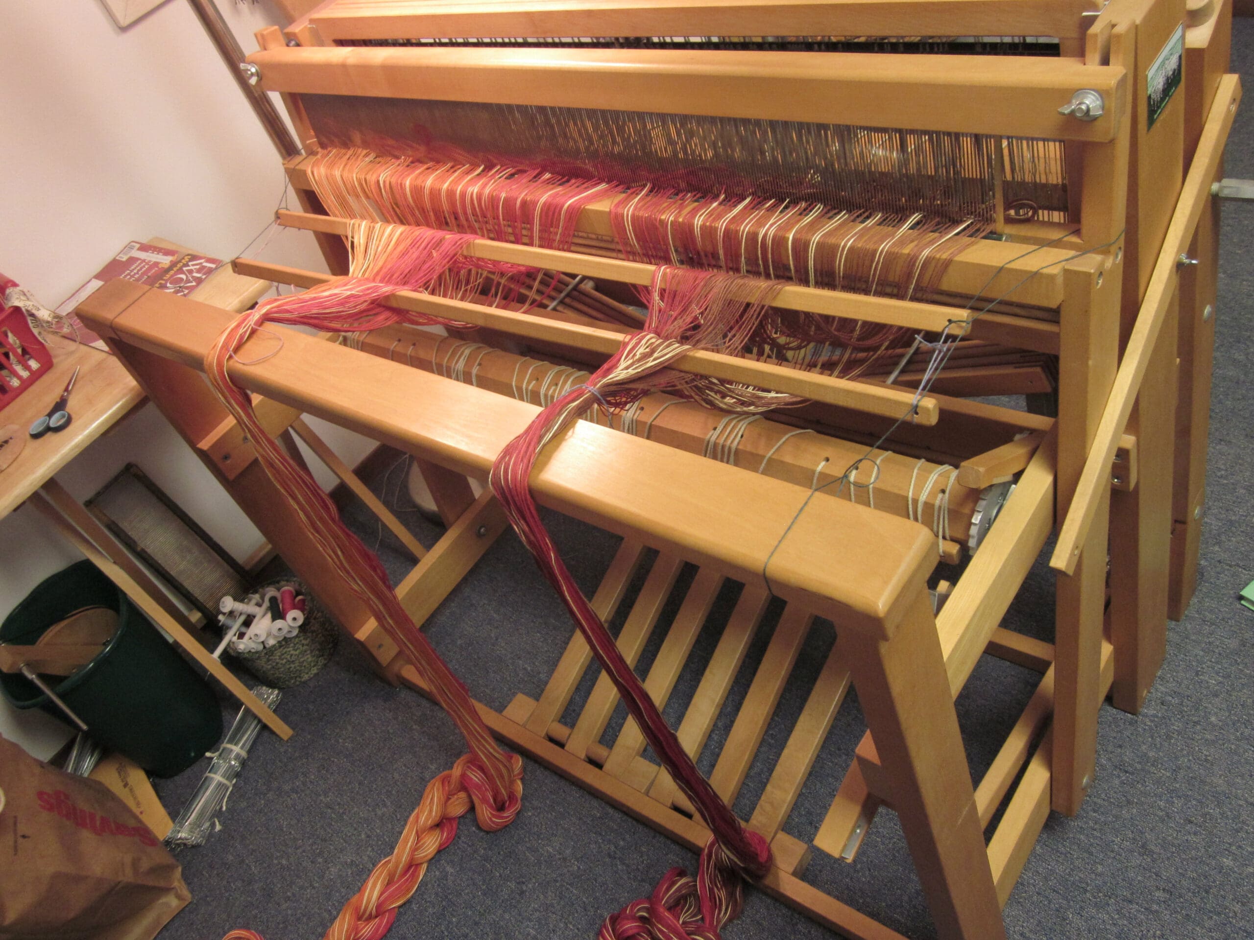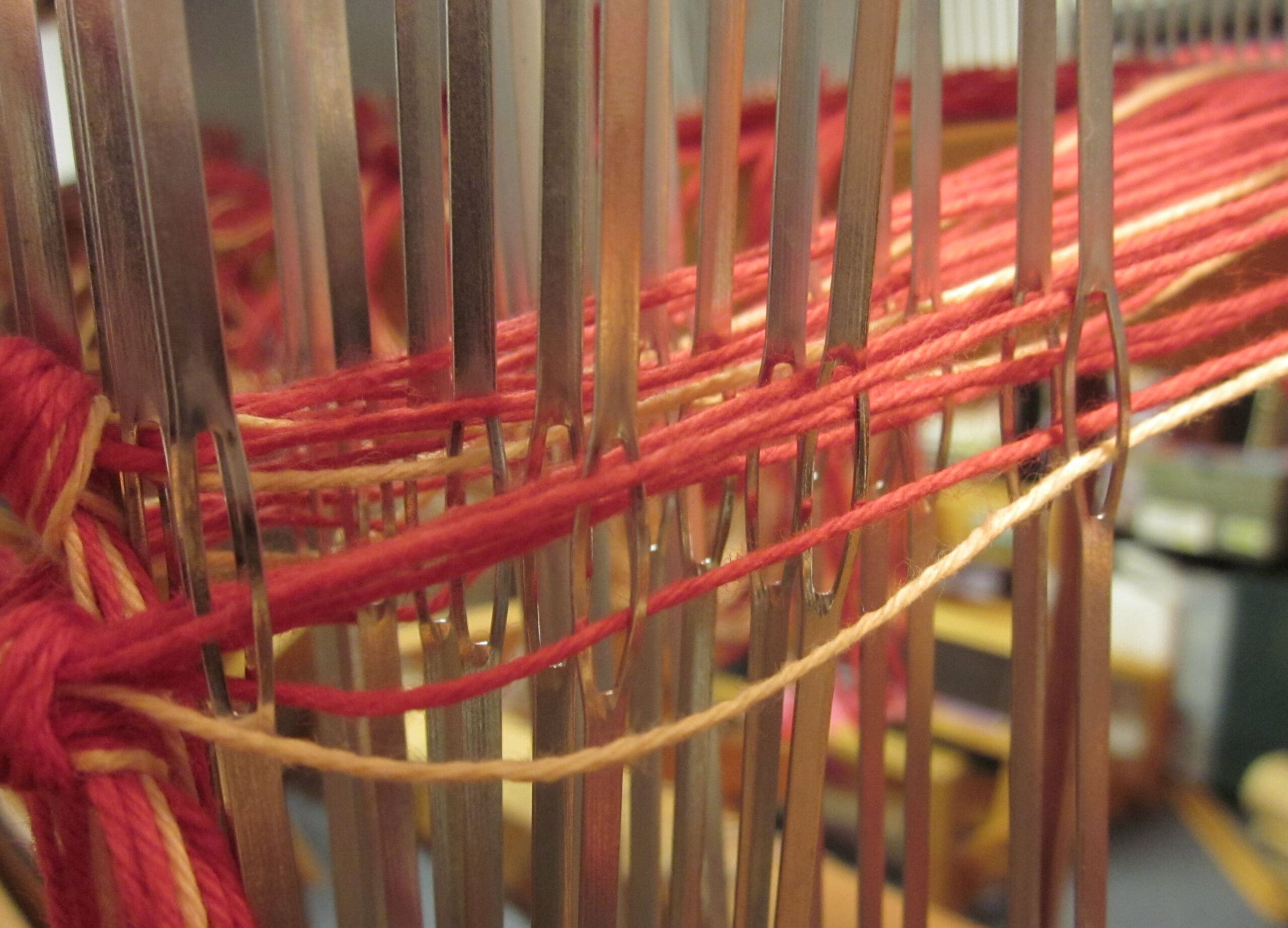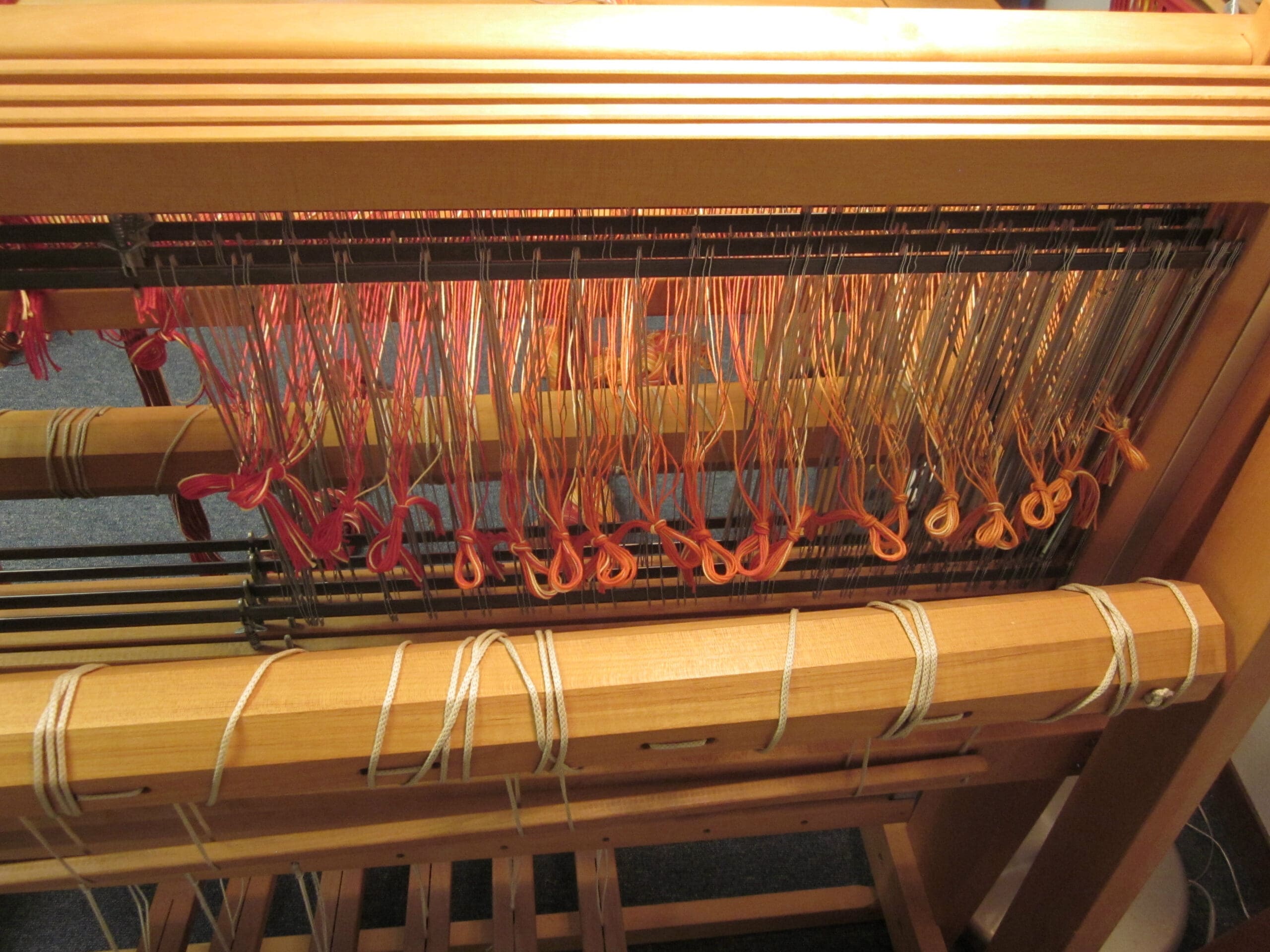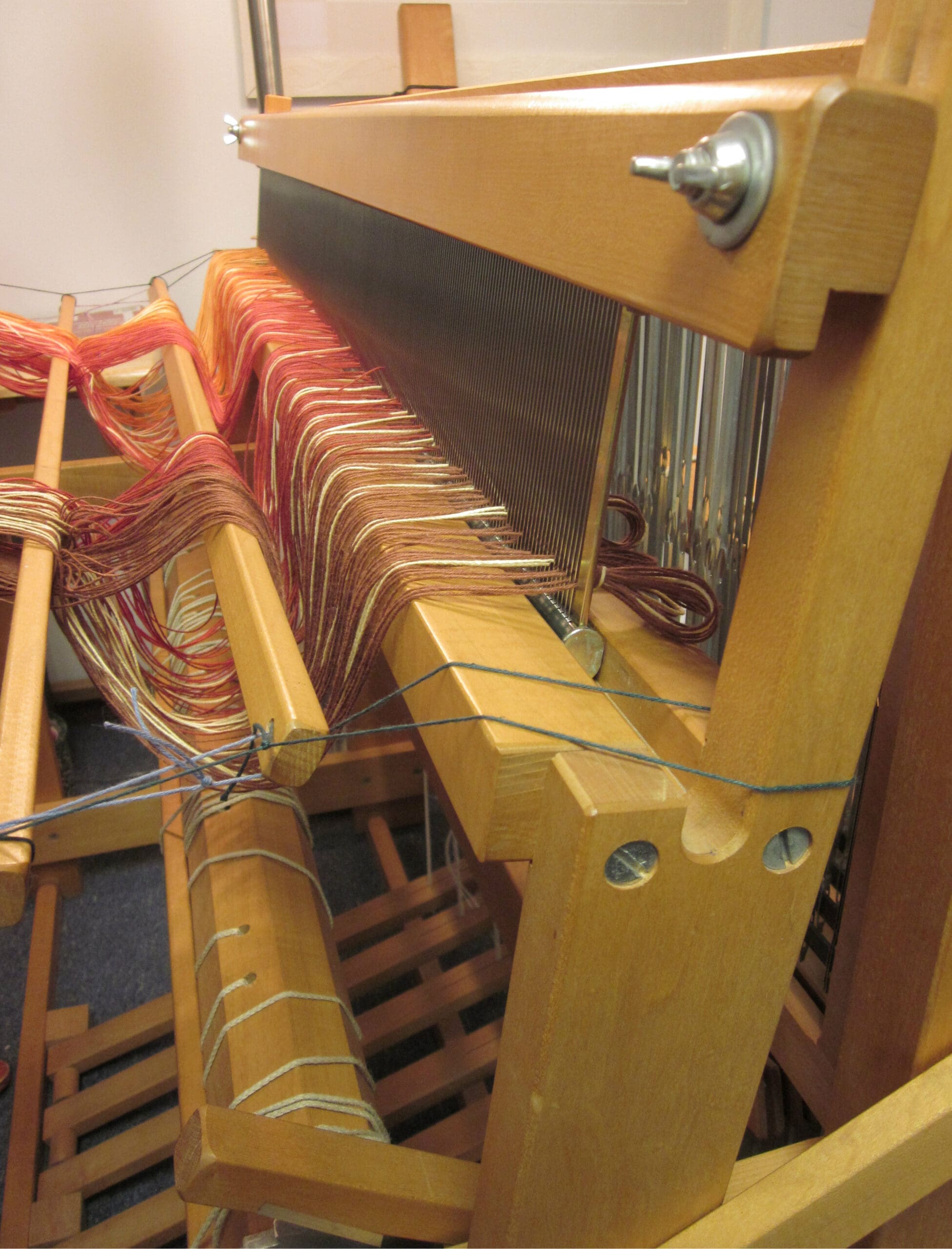 Above is a bird’s eye view of the beater bar with the yarn in it, plus the (4) shafts directly behind it! The heddles all live in the shafts. So, that is where the yarn is headed next!