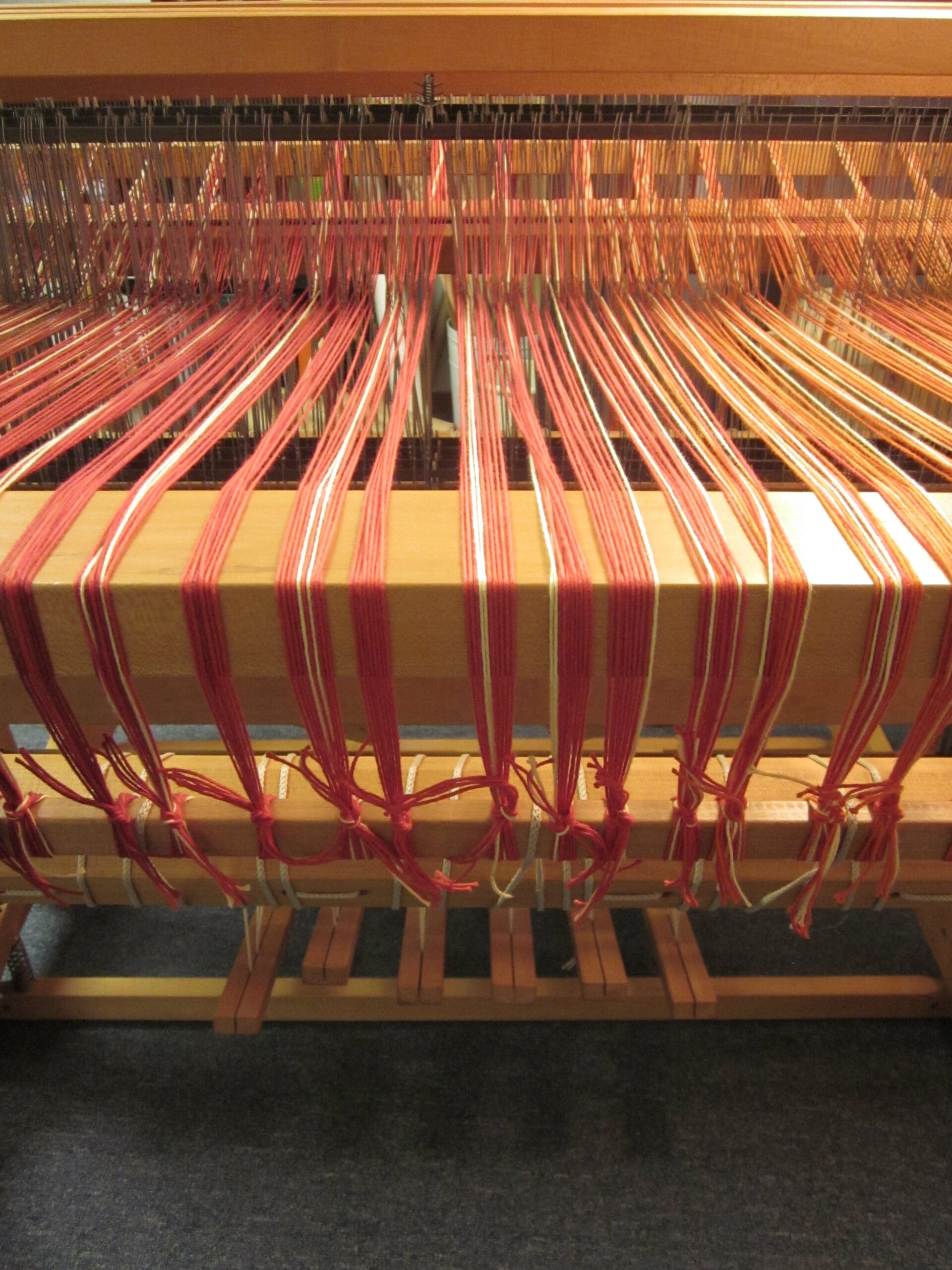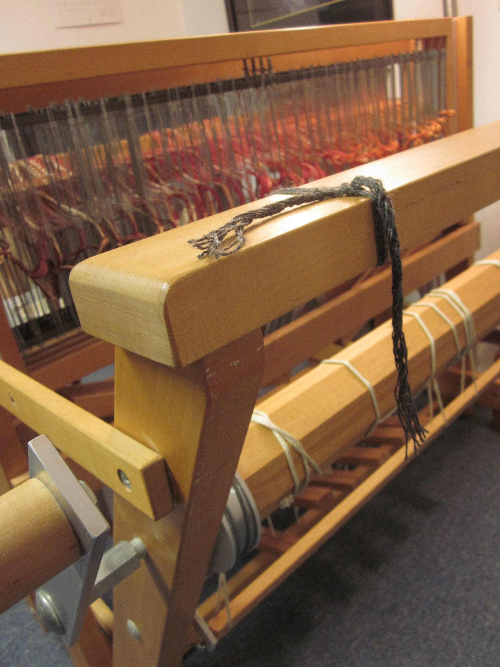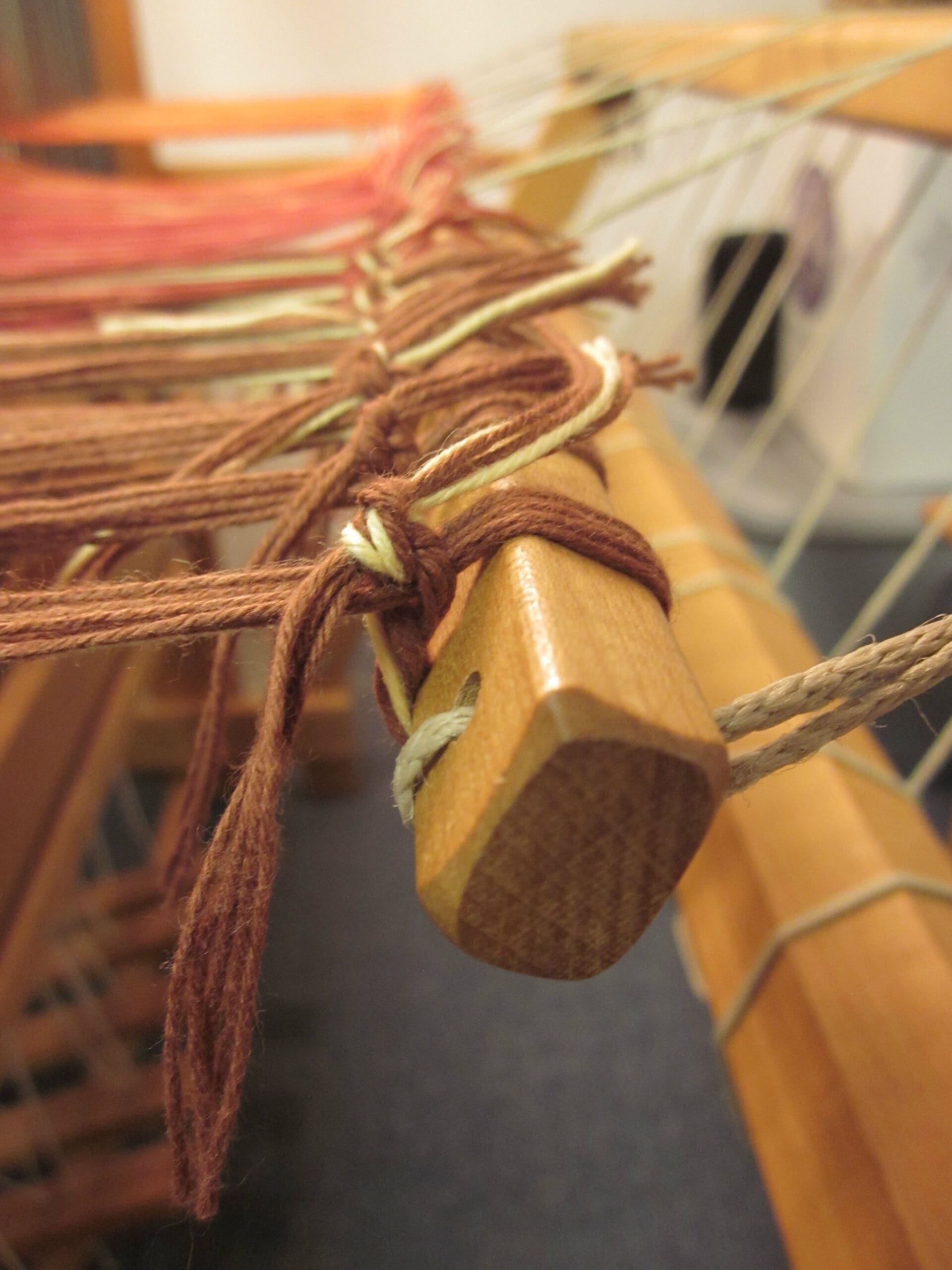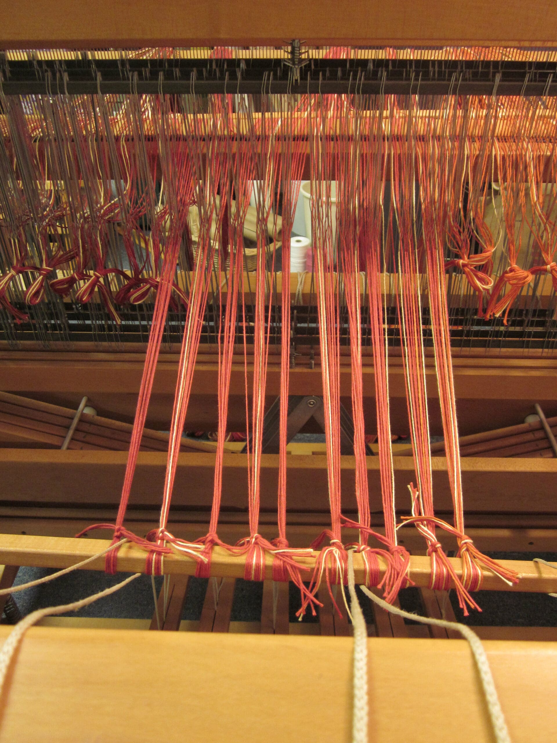 I’ll pull the rod over the beam, take each group of yarns waiting for me at the heddles and tie them to the rod. I usually start in the middle. But, I imagine the world would not shift on it’s axis if I started at an end instead!
