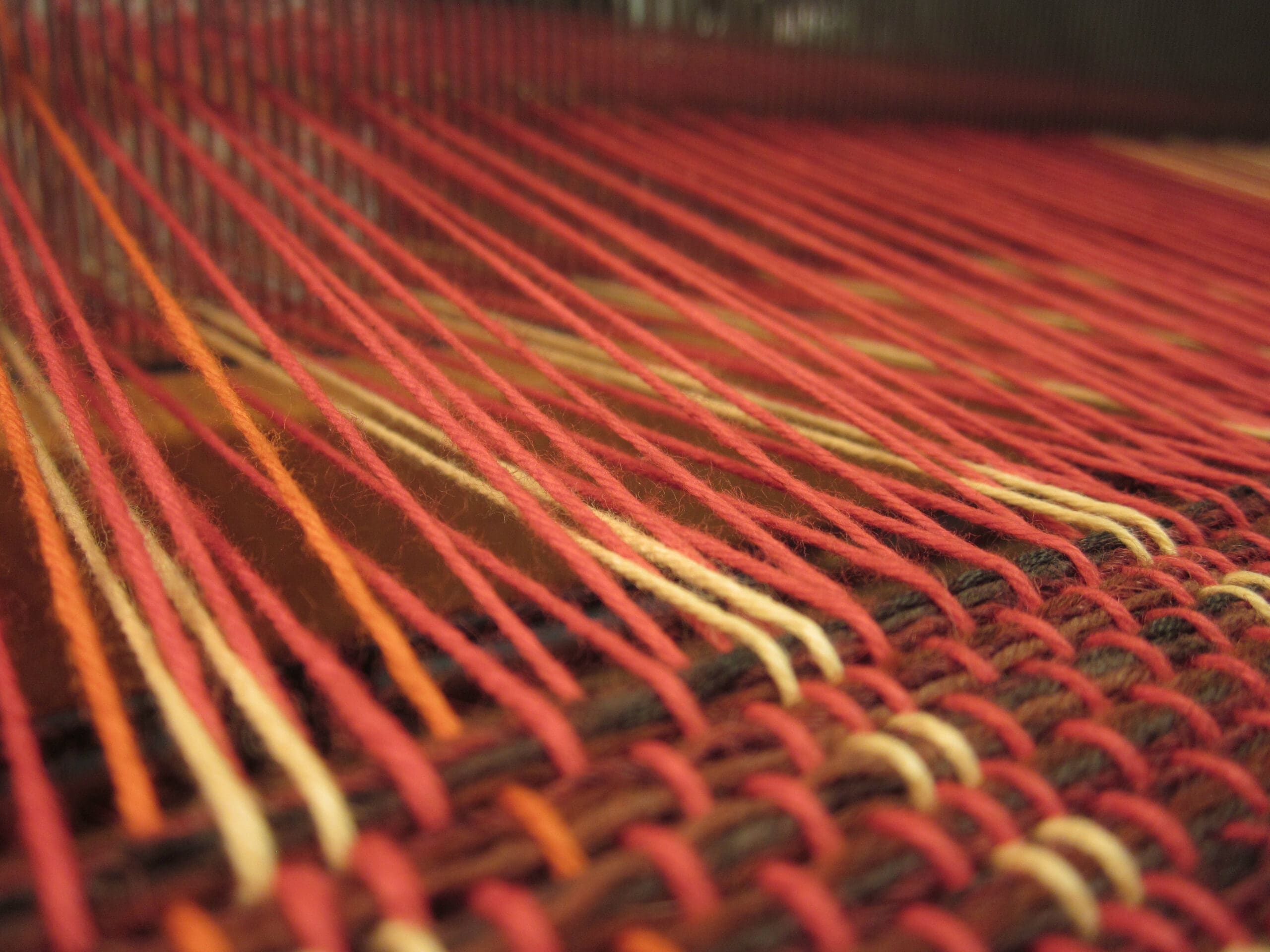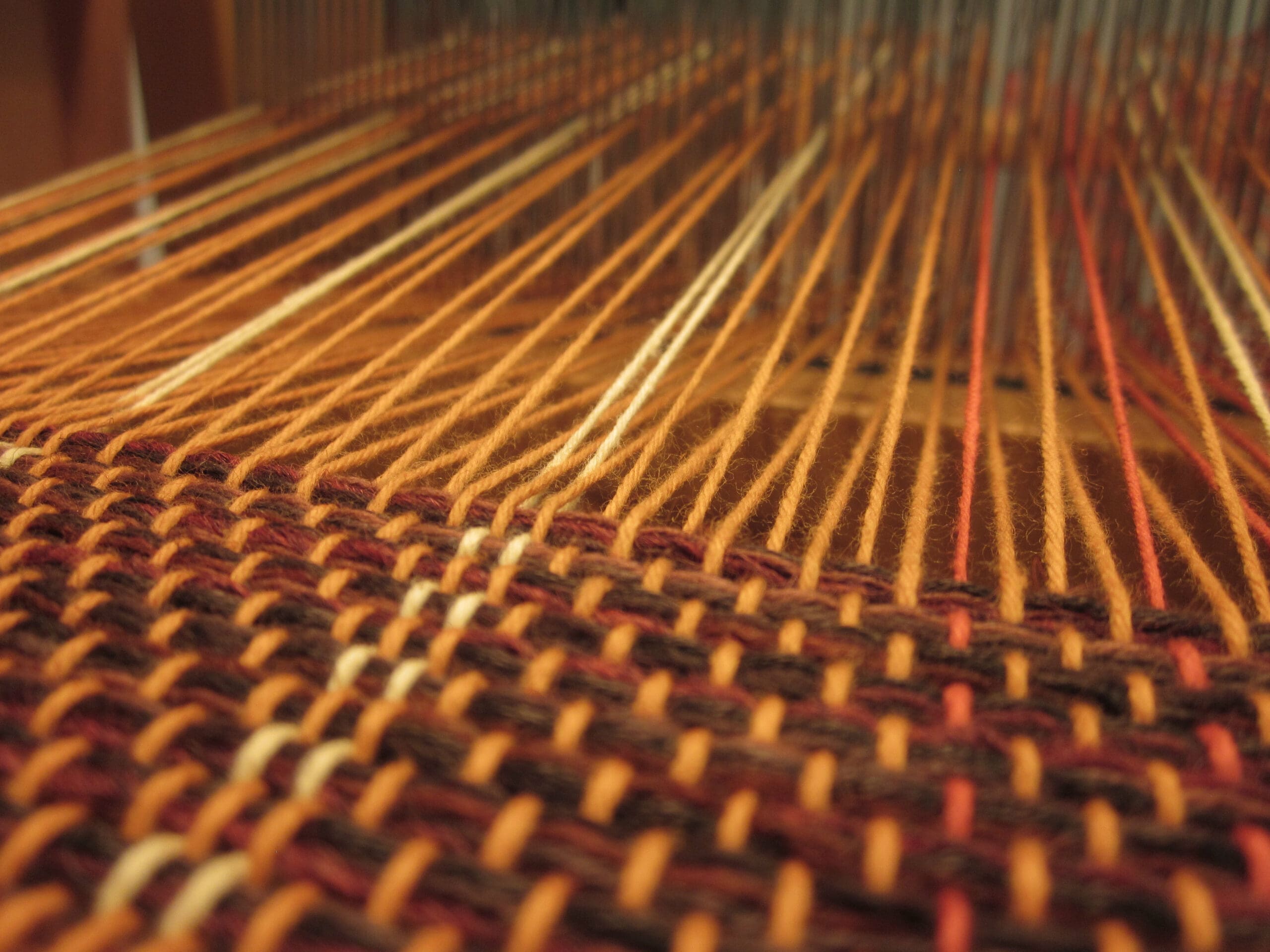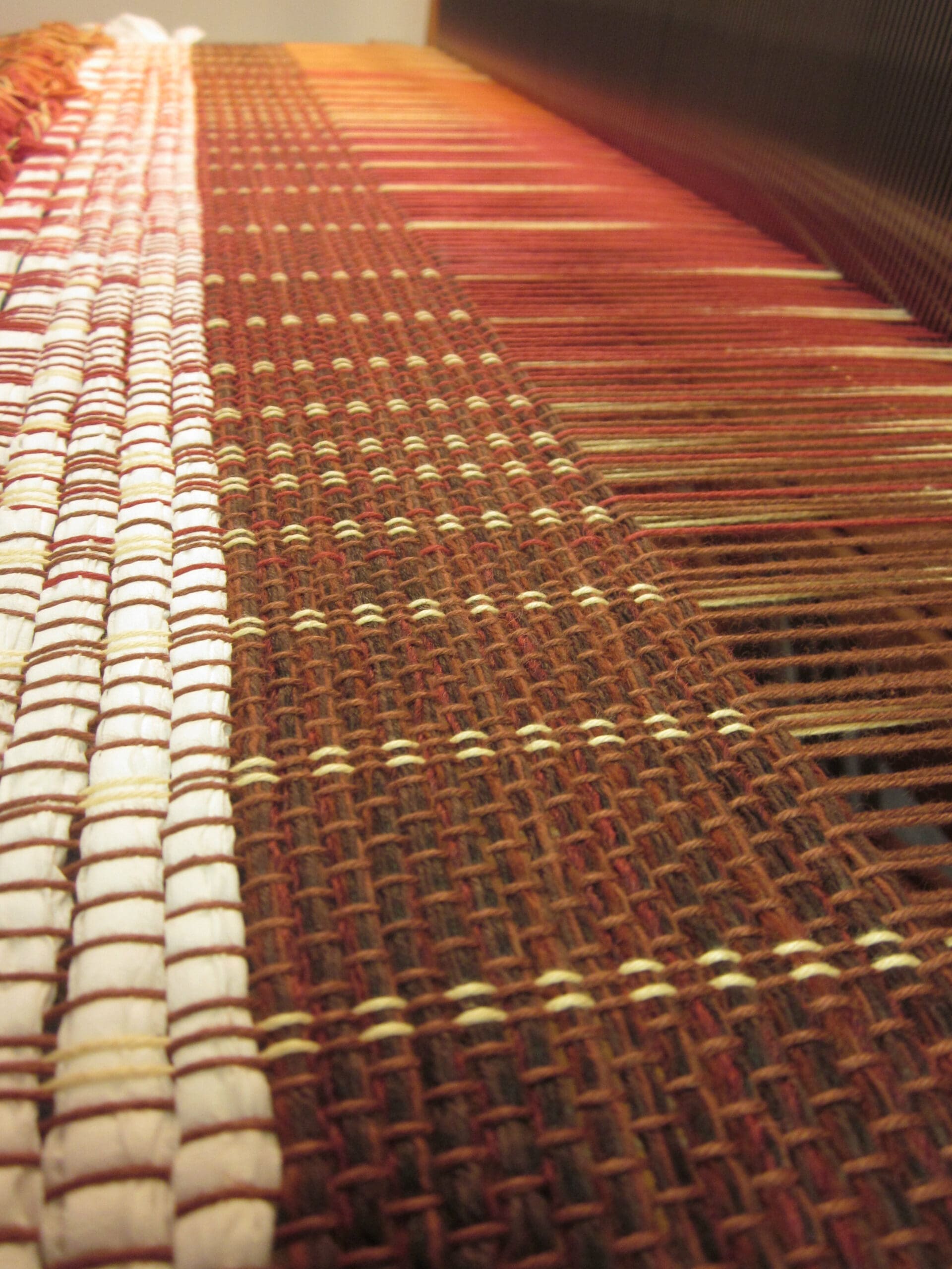 So, the beauty in using a loom lies in the options it provides you, the artist, once it’s been dressed. (“Dressing the loom” is the phrase weavers use when they describe the set-up process.) At any given point, I can completely change the pattern by lifting and lowering different yarns. I could have a spontaneous twill or basket weave break out at any time! I have a 4-shaft loom (meaning each yarn could go into 4 different positions) which provides a large number of options. But, looms can be found with 8, 12, 24+ shafts, giving the weaver enough choices to really make her head spin! Kind of makes me dizzy just thinking about it…